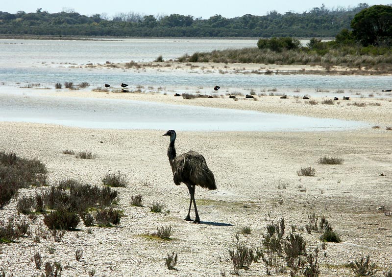 (Bild 8 ): Als willkommene Dreingabe trabten dann noch zwei Emus über einen ausgetrockneten Teil der Lagune