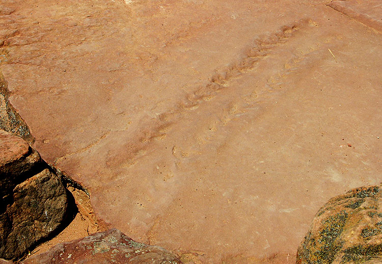 Bild 1: Kriechspur eines Eurypteriden auf einer Felsplatte (die zwei diagonal parallel verlaufenden Spuren).