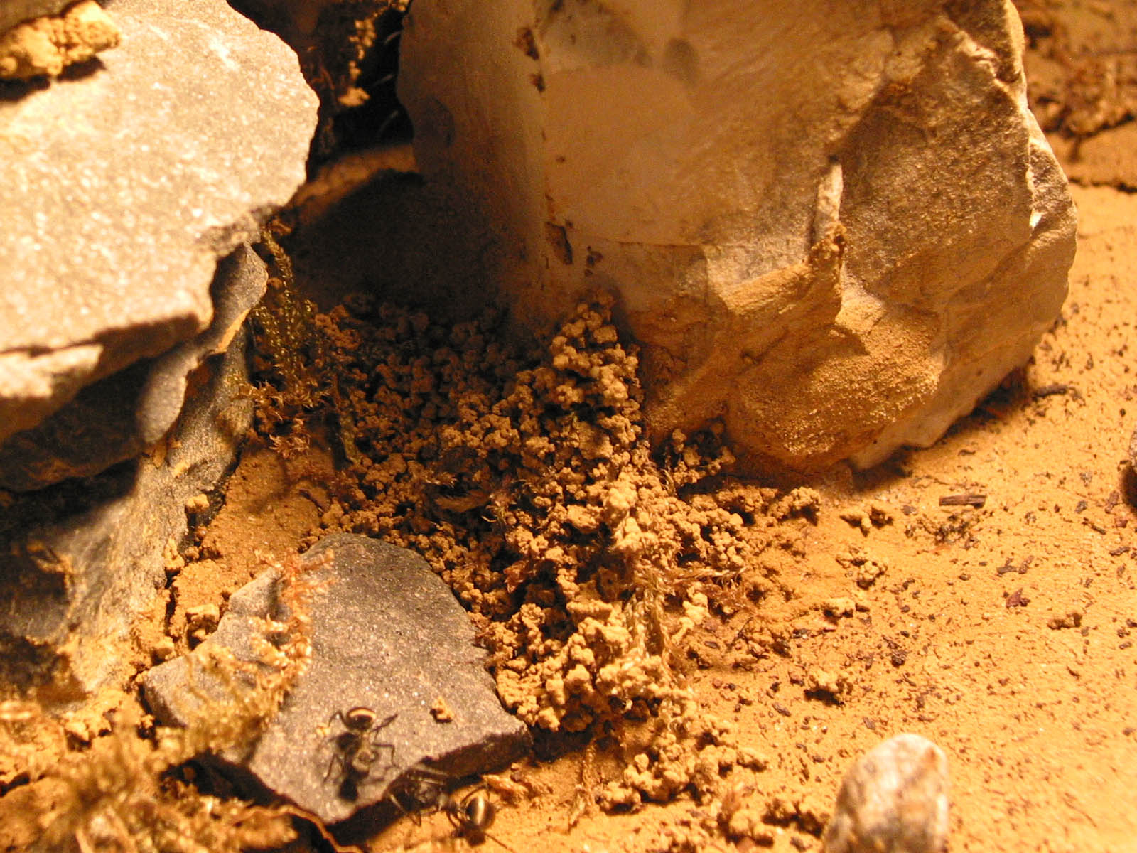 Hier mal ein Bild von den Lehmbauten (bei der Ansiedlung im Formicarium stand das Reagenzglas mit der Kolonie schräg über den Aufgetürmten Lehmklümpchen - diese stellten also ein Art wand zwischen Boden, Reagenzglas und den angrenzenden Steinen dar):