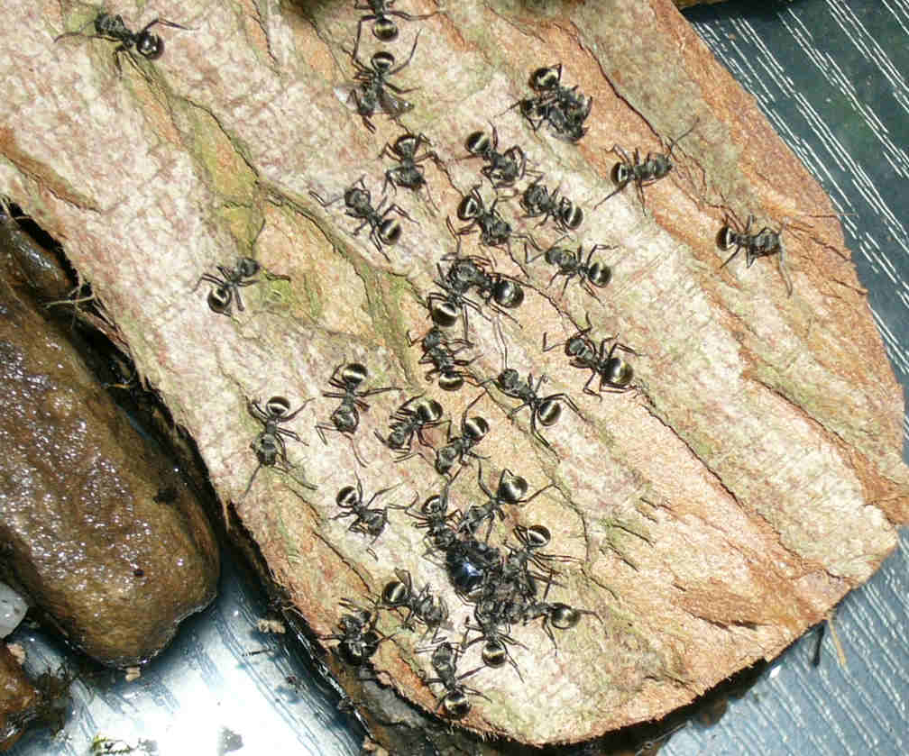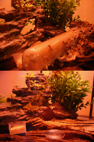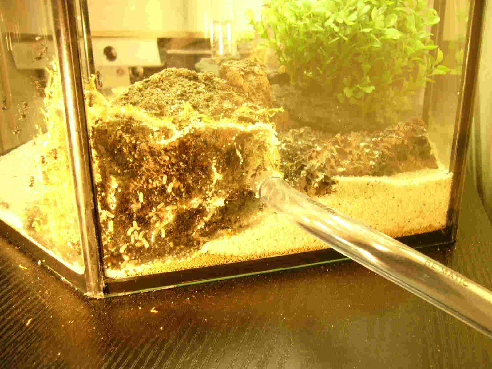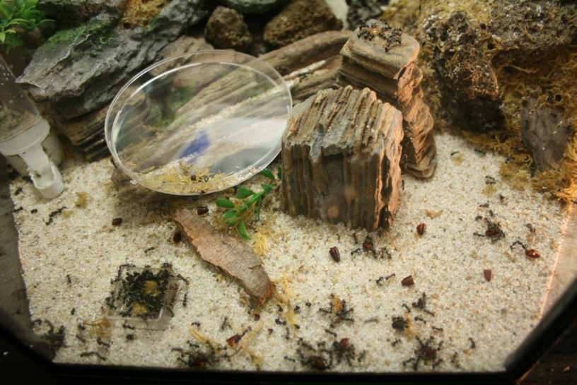 Bekommen hab ich die Ants im Antstore in Berlin und hab somit auch gut an Wissen und allem was man so braucht mit eingepackt. Insgesamt ca. 200 Arbeiter und mind. 3 Queen, allesamt in einer Vogeltränke im Transportbehälter zurückgezogen. Als Behälter hab ich mein altes 8eck Aquarium mit Wassergraben hergerichtet, ca. 50x50x50cm. In der Mitte Steine um über die Wasserhöhe zu kommen, und darauf eine Kunststoffhöhle mit großem Hohlraum innen, und eine weitere mit einer Pflanze (naja auch Kunststoff) mit vielen Verzweigungen, sowie ein paar weitere Steine und Holzbrücken.