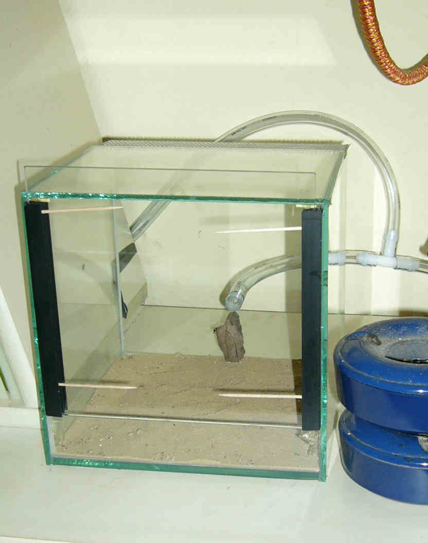 Nun zum Nestbecken, leider muss ich bei vollem Besatz bohren, zur Bohrstelle kommt keine Ants, da ich ja noch Wasser ringsum habe. Nach 5min ist das Loch durchgeschabt, und die Ants scheinen recht unbeeindruckt davon, gut so. Plexiglasrohrstück durch und Schlauch aussen rauf, drinnen nur ein kleines stück Schlauch was als Verbinder zum 90° Winkel dient. Den 90° Winkel hab ich aus einem T-Stück gemacht, ein Teil abgesägt und Loch zugeklebt, benutz immer 5min 2komponenten Epoxid Harz, welcher ausgehärtet unschädlich ist. Auf das Winkelstück kommt nun ein 15cm Schlauchende was ich nach unten drehe, somit liegt der Schlauch 2cm unter Wasser und es kann keiner über ihn nach aussen ausbrechen. Nach den 15cm wieder ein Winkelstück hochgedreht um das nächste Schlauchende auf den Steinaufbauten enden zu lassen. Der durchsichtige 10/12mm Schlauch fällt im Wasser kaum auf, somit haben die Ants nun auch einen schönen Unterwassertunnel :) außen noch gut 2m Schlauch rauf als Verbindung zum Abfallbecken. Der Schlauch wird auch recht schnell erkundet incl. dem 2. Becken.