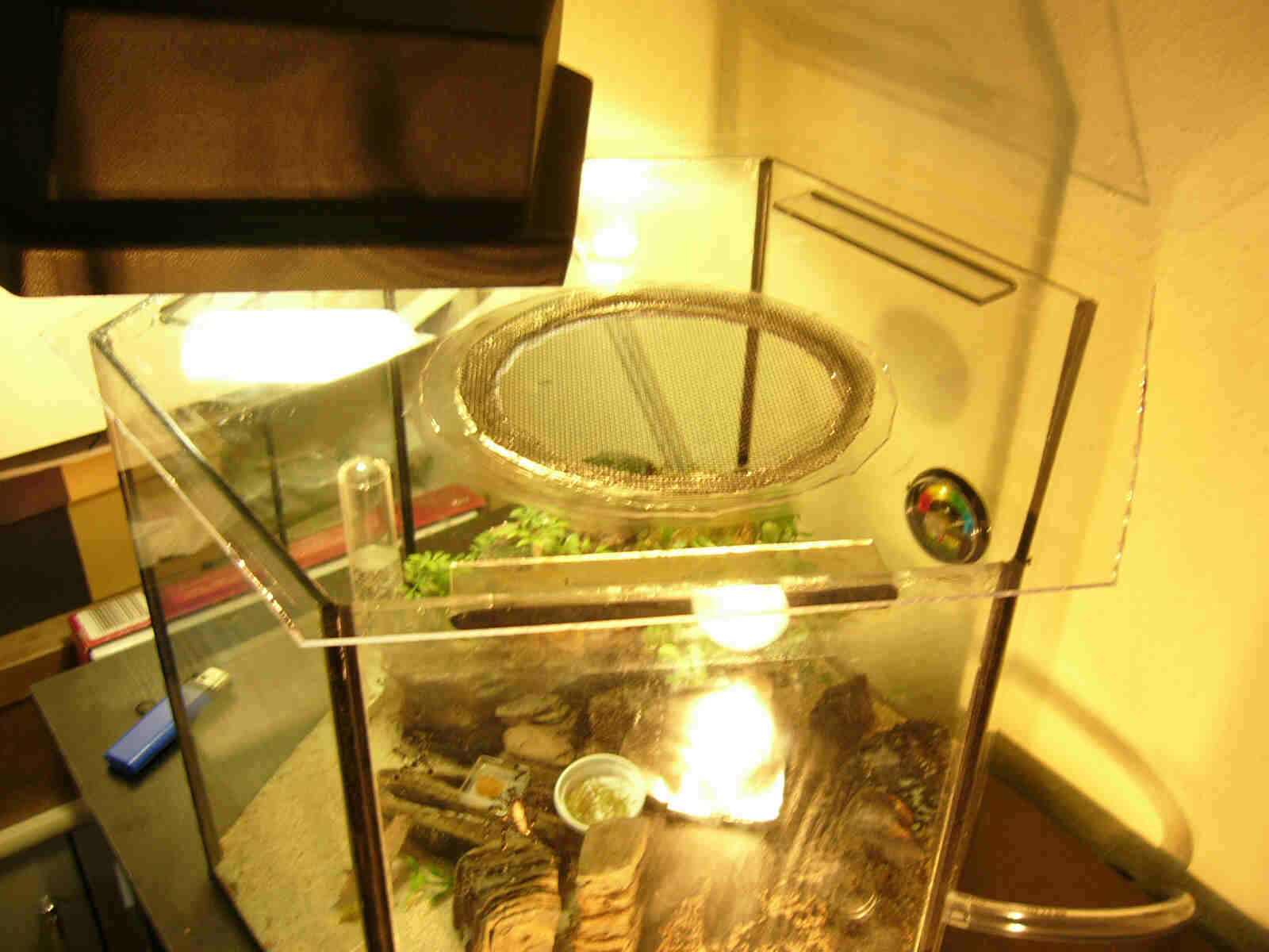 Der Deckel des Beckens ist trotz Kunststoff sehr dicht und liegt gut auf, nur wo das Lampenkabel rausgeht klebe ich mit Drahtgitter aus dem Antstore alles gut ab, die Lam pe selber ist so eine Art Energiesparleuchte im Deckel, die vollkommen in einem Glaszylinder ist, war ja vorher fürn Aquarium gedacht. Die Lampe hab ich außen mit roter Folie beklebt, damit sich die Ants nich zu sehr stören, und die Lampe aussen nur 50° warm wird.