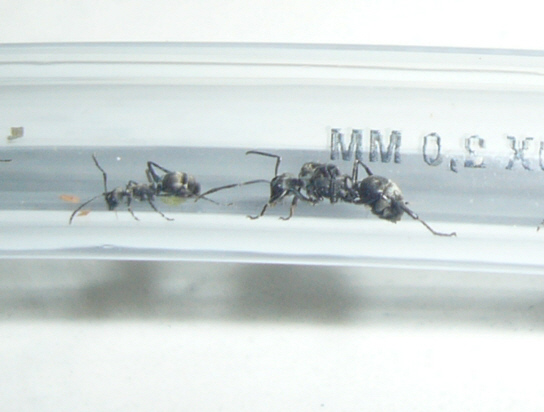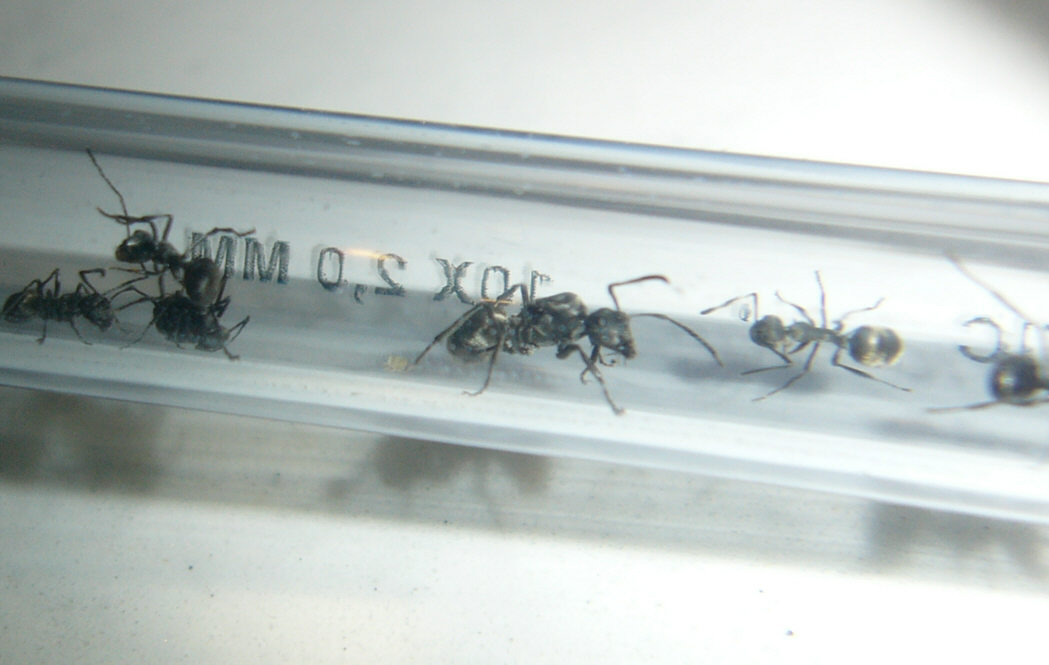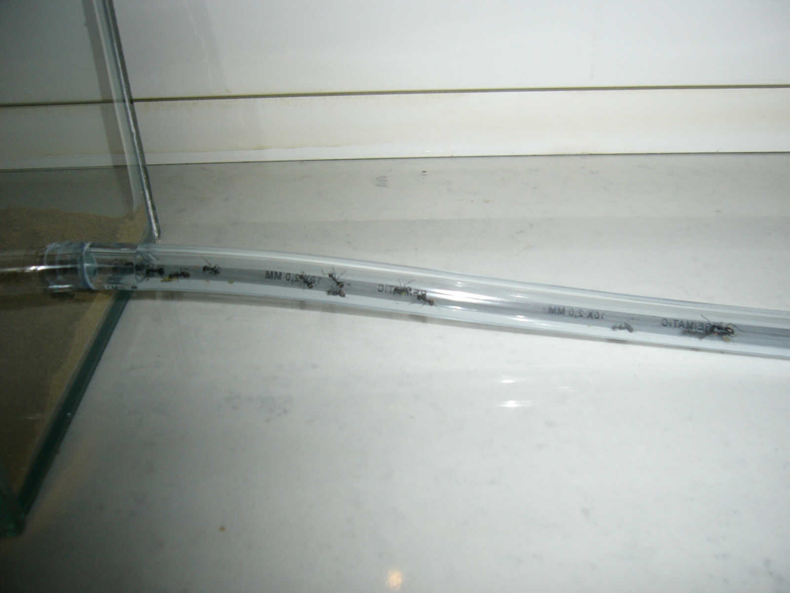 Als ich wieder kam war auch alles in Ordnung. Da das Futter im Nestbecken komplett alle war, waren recht viele Ants im Schlauch und im Futterbecken unterwegs, incl. 3 Königinnen, die ich zum ersten mal alle 3 im Schlauch sehen und gut beobachten konnte, hoffe man kann es auf dem Foto erkennen, also 50% größer als Arbeiter sind sie schon, auch wenn mancher sagt, man sieht es kaum.