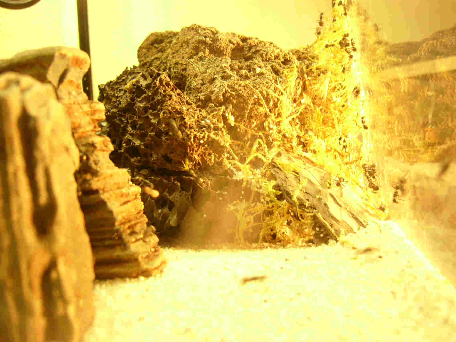Als zusätzliche Wärmequelle hab ich einen Sun-Glow 50W Strahler auf 2 der 8 Ecken des Beckens gerichtet, ca. 30cm Abstand. Daraufhin haben die Ants auch Ihr zweites Nest in dieser Ecke eingerichtet. Binnen 2 Tagen haben sie dort ein komplettes Nest gebaut, verwoben und sind mit ca. 150 von ca. 450 Tieren dort eingezogen. Jetzt stapeln sie dort die Brut mal an der einen Wand, mal an der anderen, ja nach Temperatur, 32° scheinen sie zu mögen, betrifft natürlich nur diesen Teil der Glaswand, das restlich Becken hat 28°.