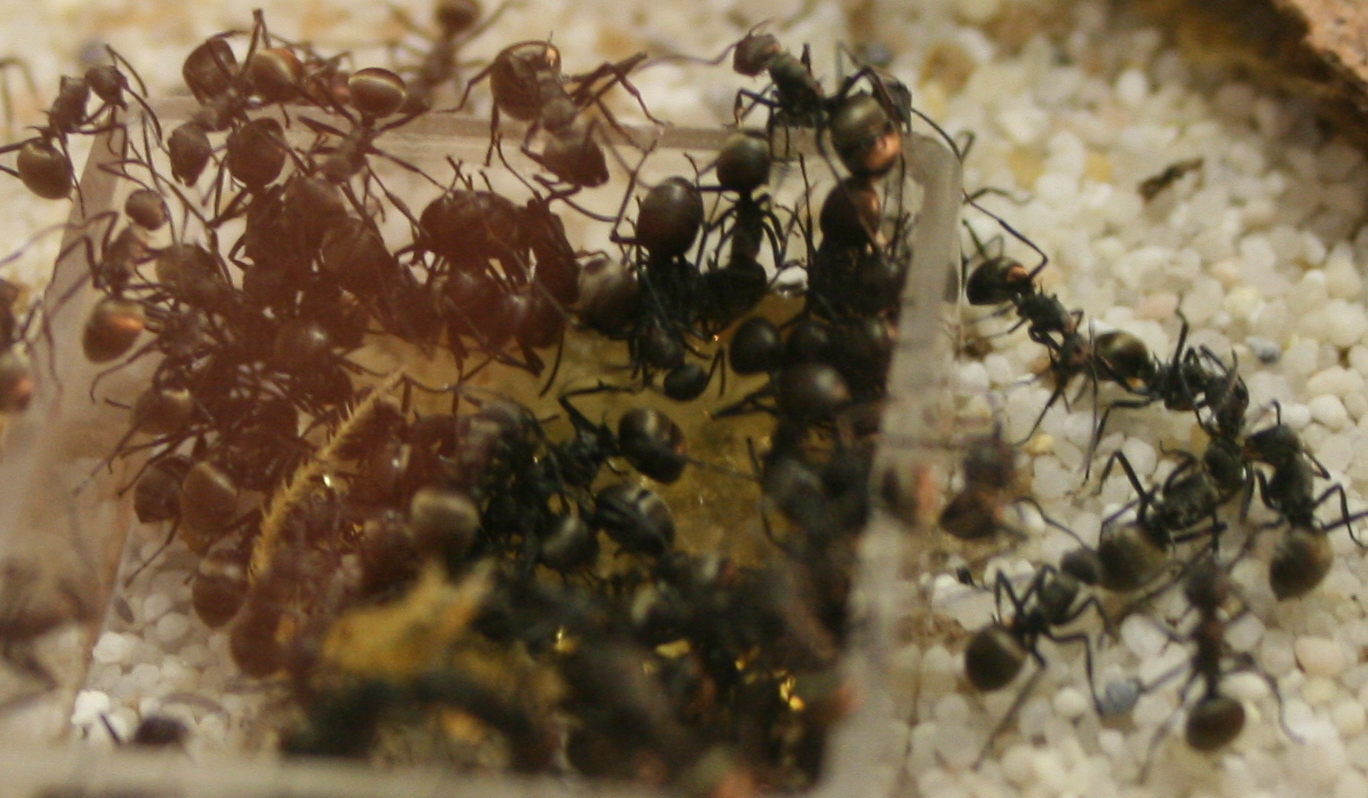 Füttern tu ich weiterhin mit Fliegenmaden, durchgeschnittene Fliegenpuppen, Honigwasser, JBL-Fischfutterflocken (werden sehr gern gefressen und in langen Ketten von den Ants durch den Schlauch transportiert), auch Melone wenn reif, wird gern genommen. Weißer Zucker gar nicht, Wachsmottenraupen und kleine Regenwürmer nur bedingt . Brauner Rohrzucker (kein Kandis) wiederum wird so gern wie Honig/Zuckermischung angenommen. Süße Weintrauben mittelmäßig.