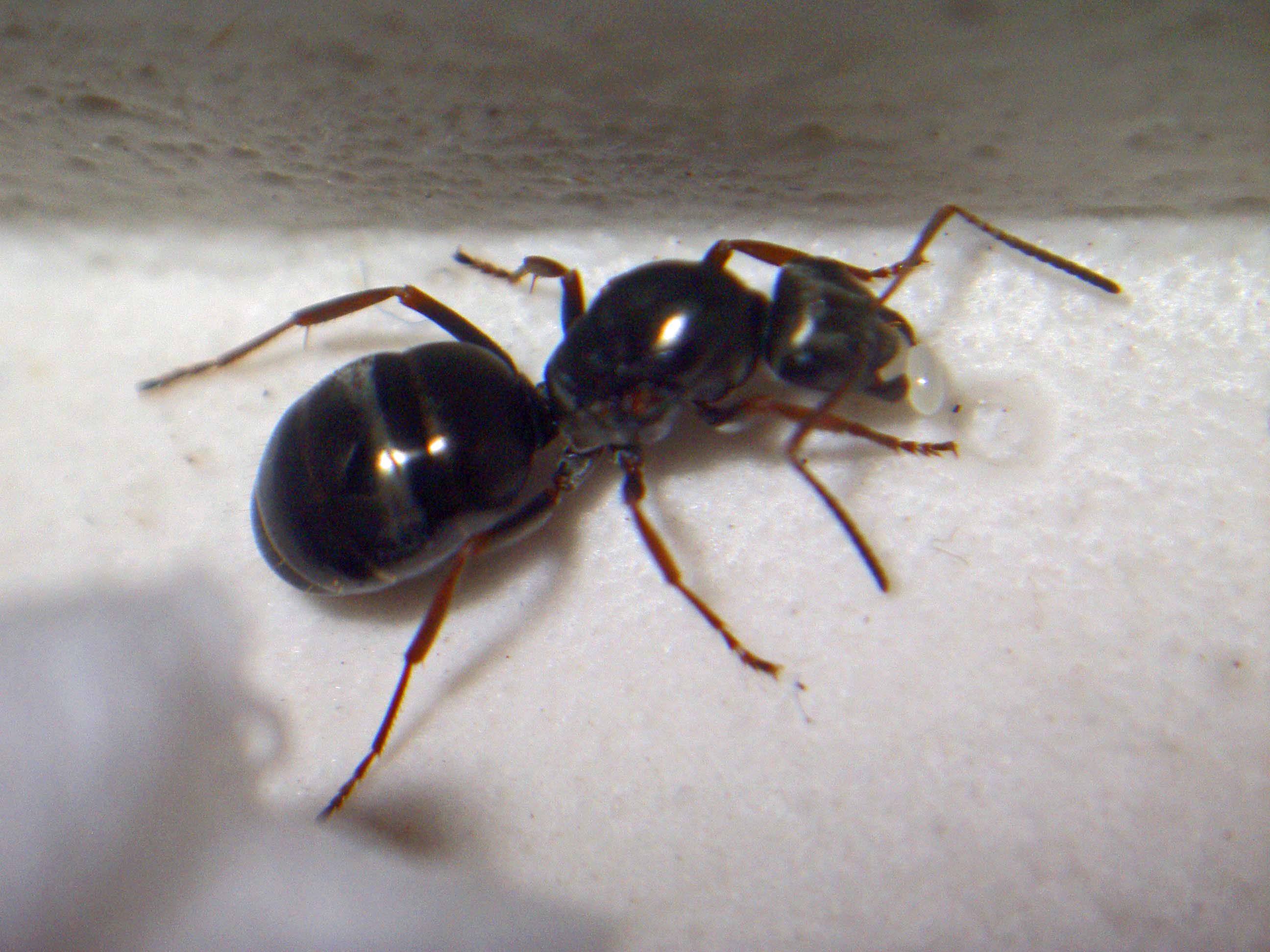 Exemplar1: habe ich im Gras in einem Wald gefunden, der sowohl aus Laub- wie auch Nadelbäumen besteht. Die Königin sieht durchaus robust und wenn man den Ausdruck wählen kann "athletisch" aus. Sie ist sehr schnell und schwarz glänzend. Ich konnte sie auf 1,1-1,2cm messen. Sie hat schon ein Eierpacket gelegt,auf dem Foto in den Mandibeln zum Teil zu sehen.