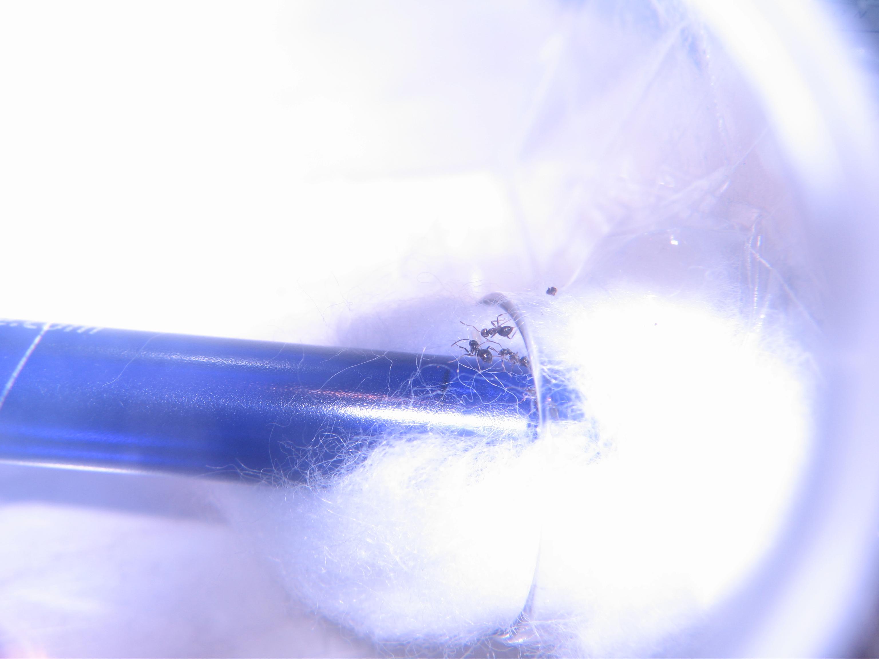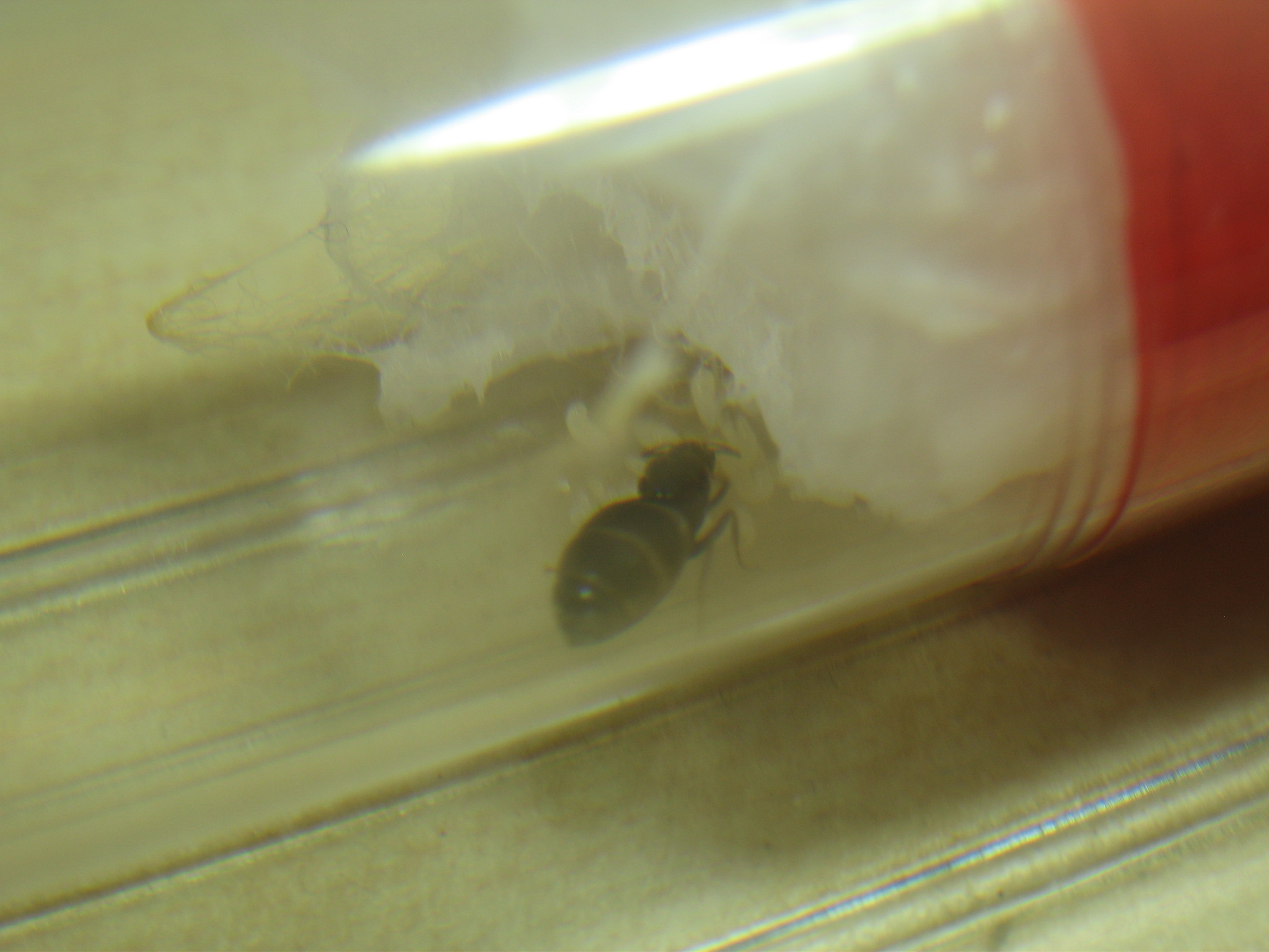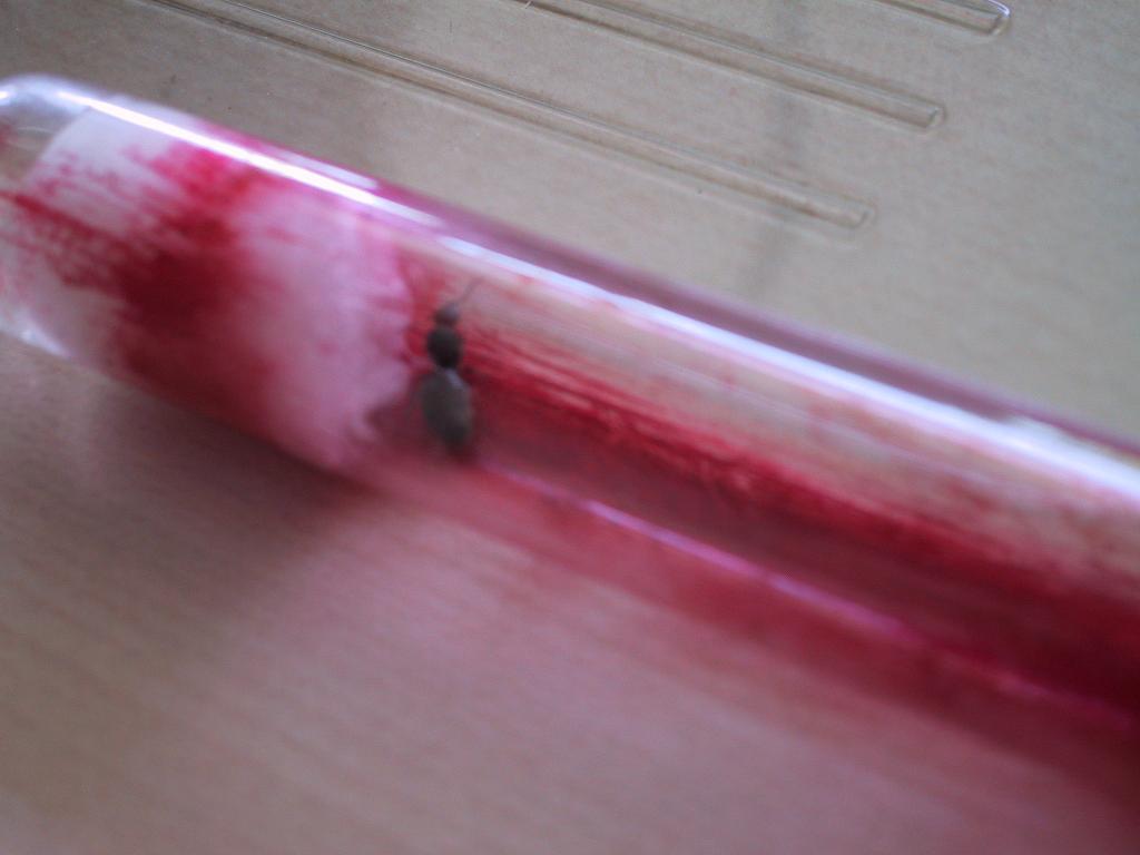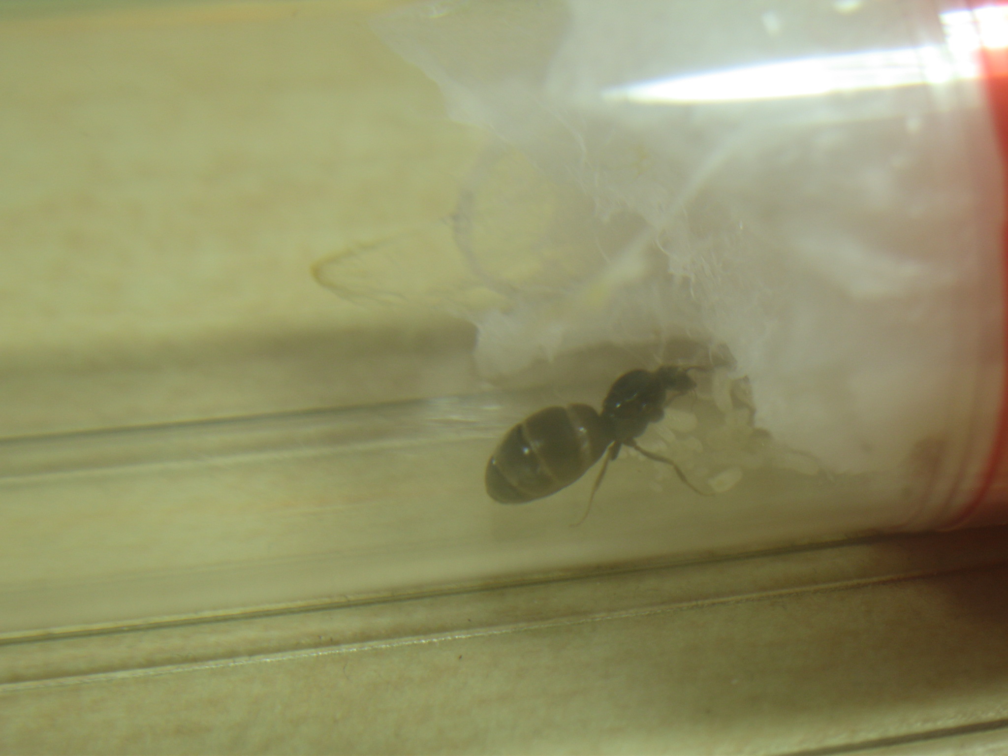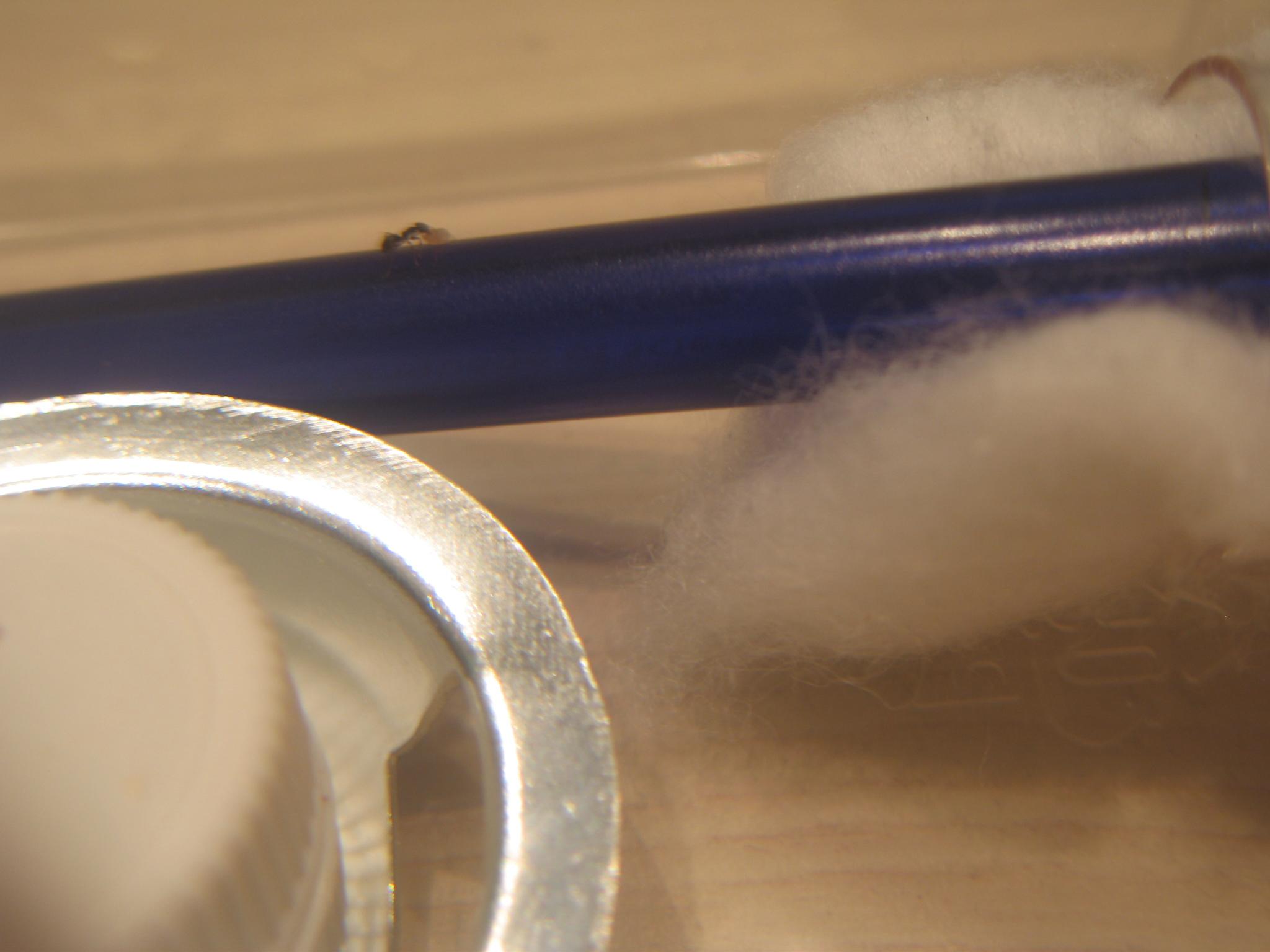 Die Ameise wollte zuerst nicht rein zu ihr ... hab sie aber gezwungen. Sie hat an nem Wattebausch mit Zuckerlösung getrunken, soweit so gut. Die Königin war ruhig und hat nichts bemerkt, die is eh immer sehr friedlich. naja, die Arbeiterin erkundet langsam die Röhre (anscheinend sieht sie wirklich ncihts, war ganz langsam)