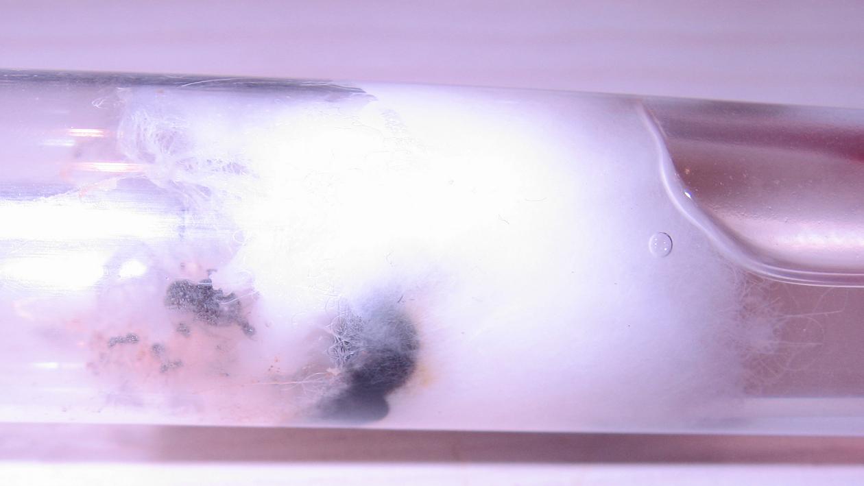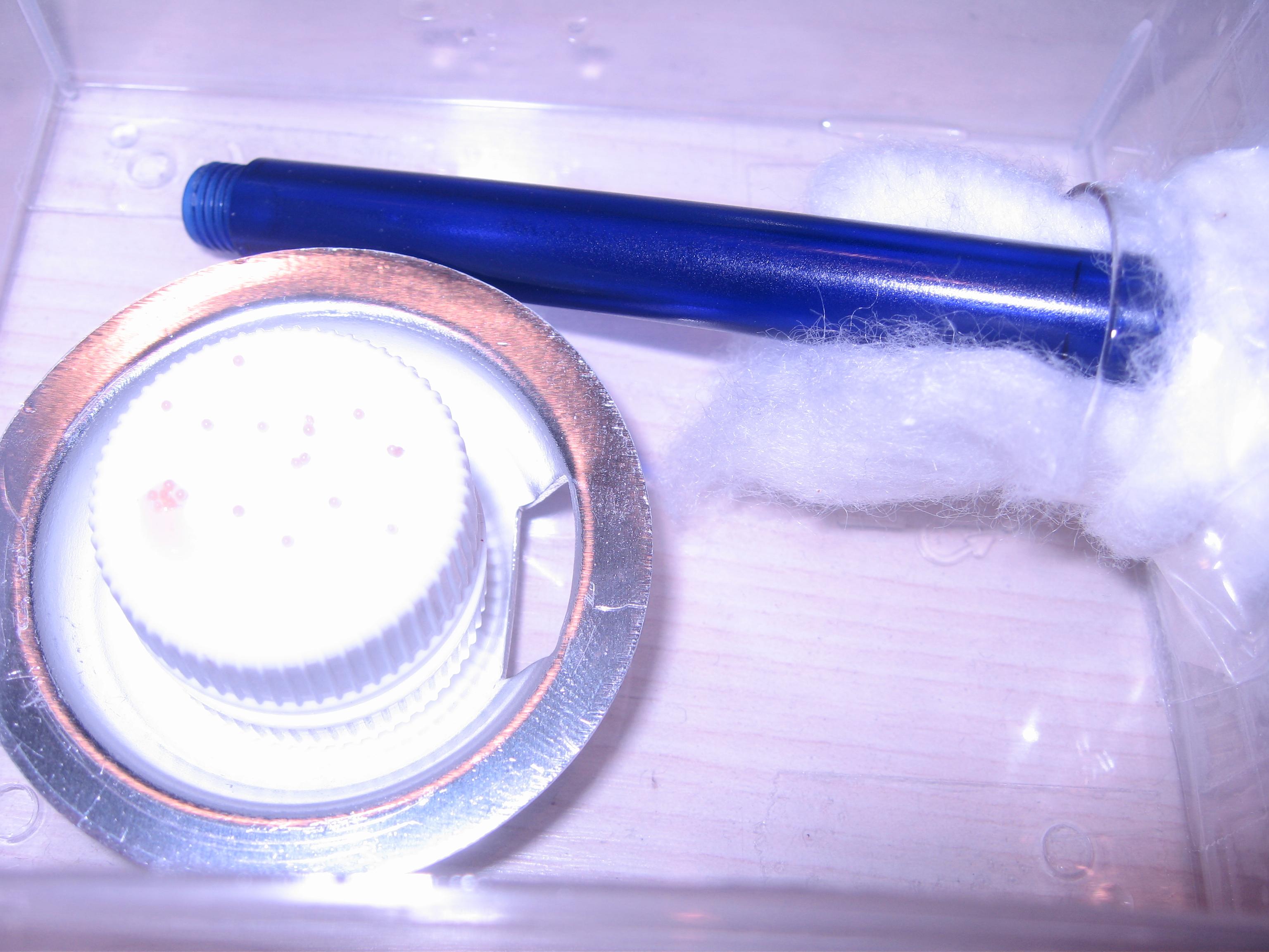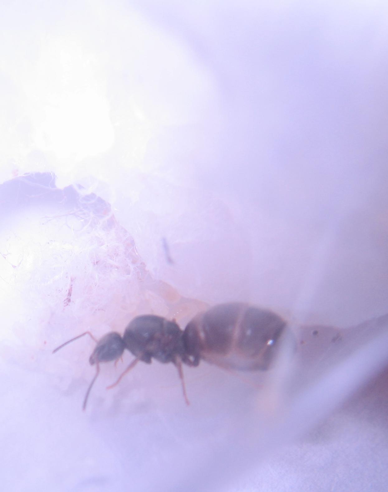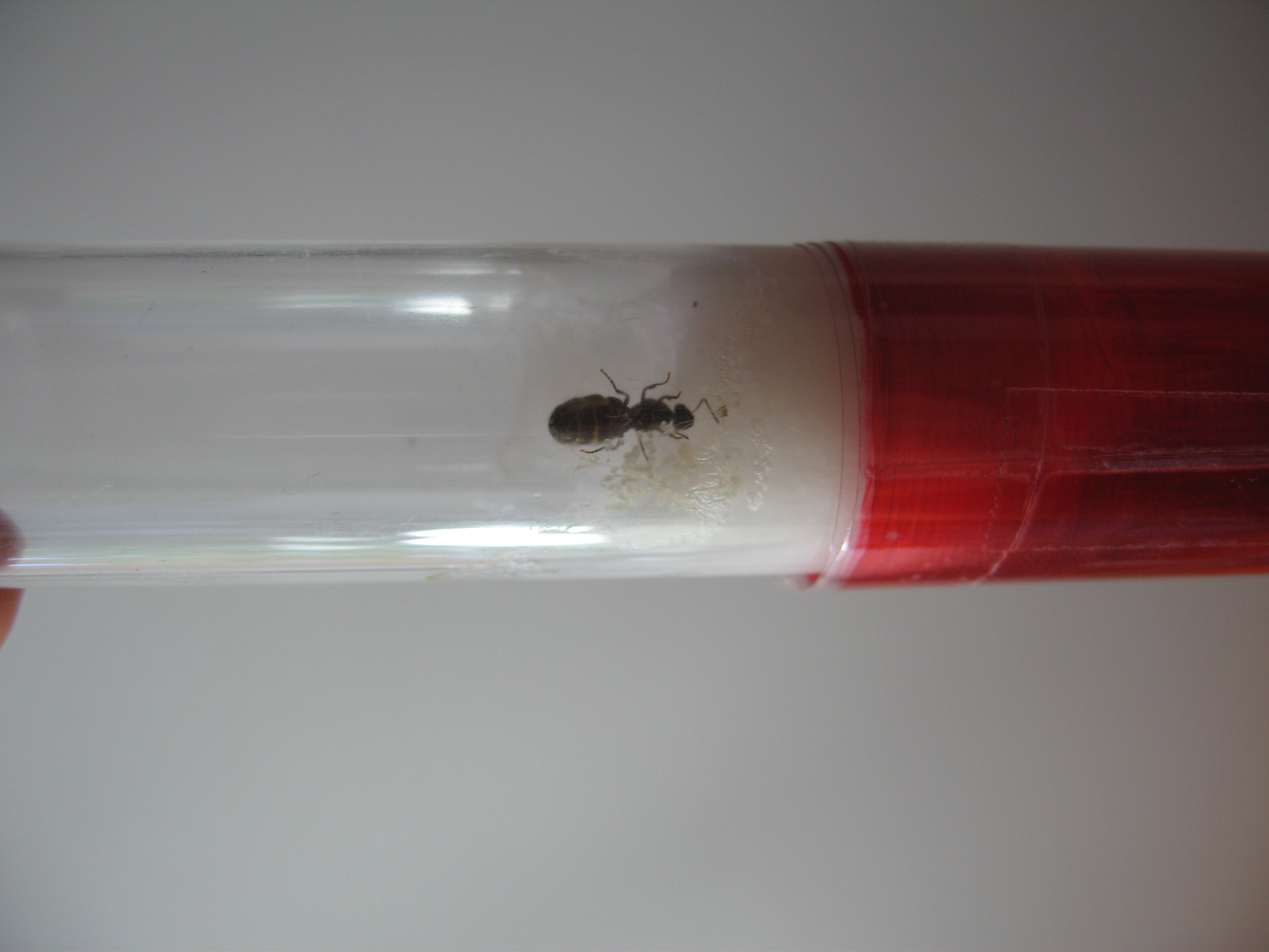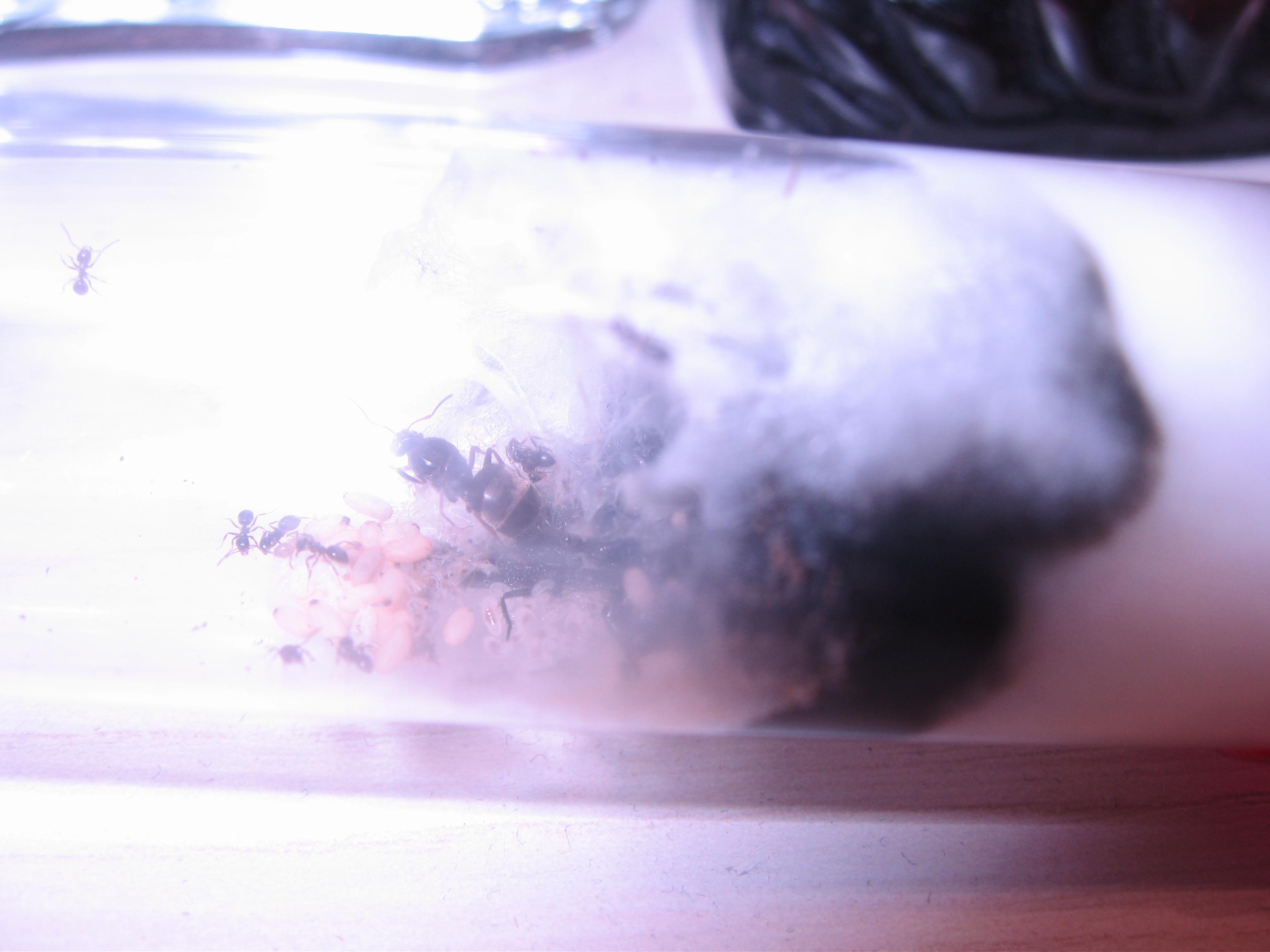 Die Ameise wollte zuerst nicht rein zu ihr ... hab sie aber gezwungen. Sie hat an nem Wattebausch mit Zuckerlösung getrunken, soweit so gut. Die Königin war ruhig und hat nichts bemerkt, die is eh immer sehr friedlich. naja, die Arbeiterin erkundet langsam die Röhre (anscheinend sieht sie wirklich ncihts, war ganz langsam)