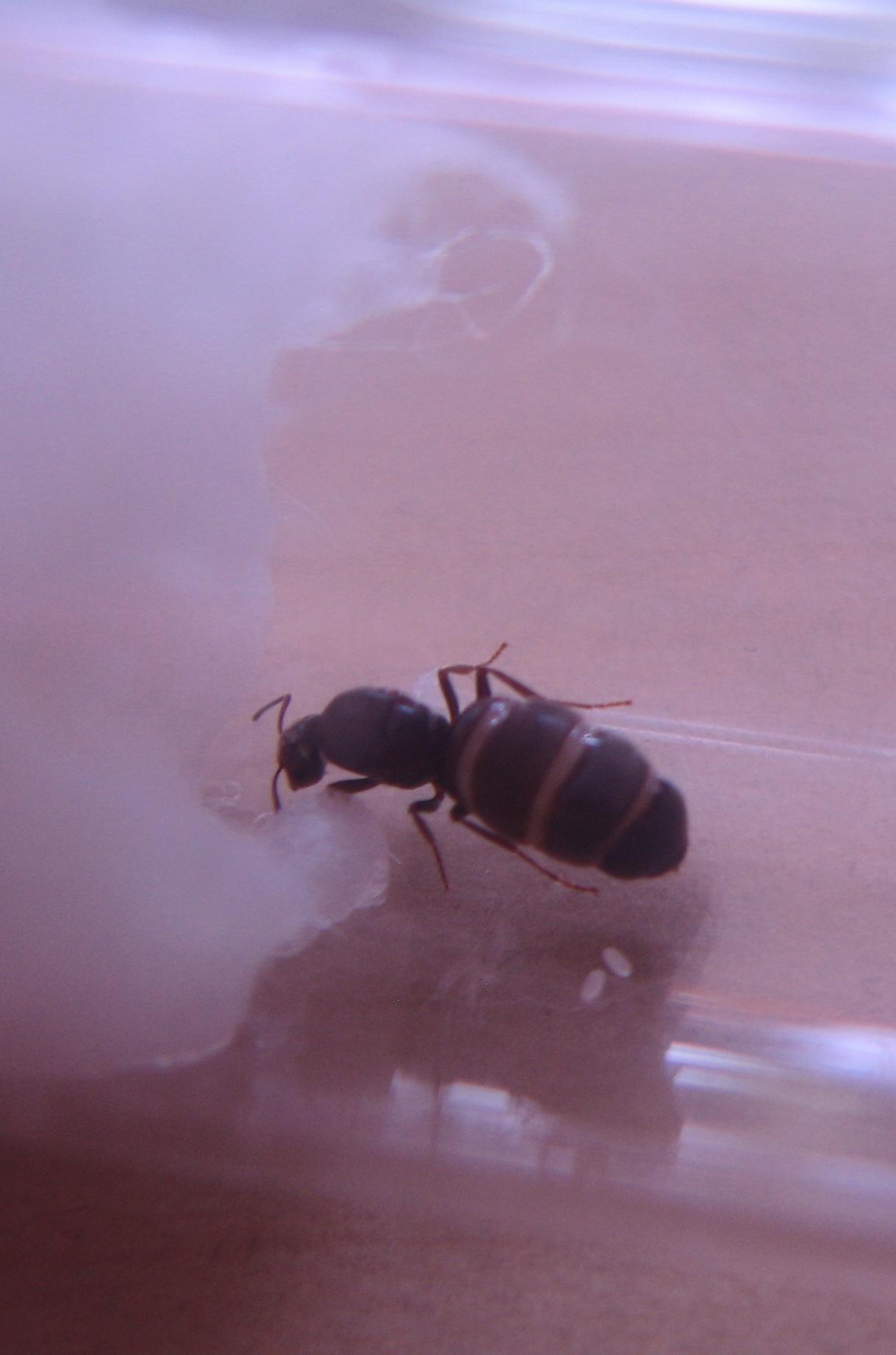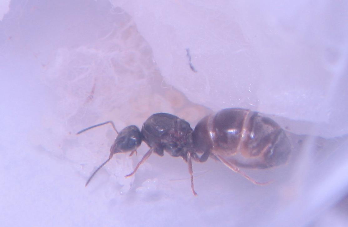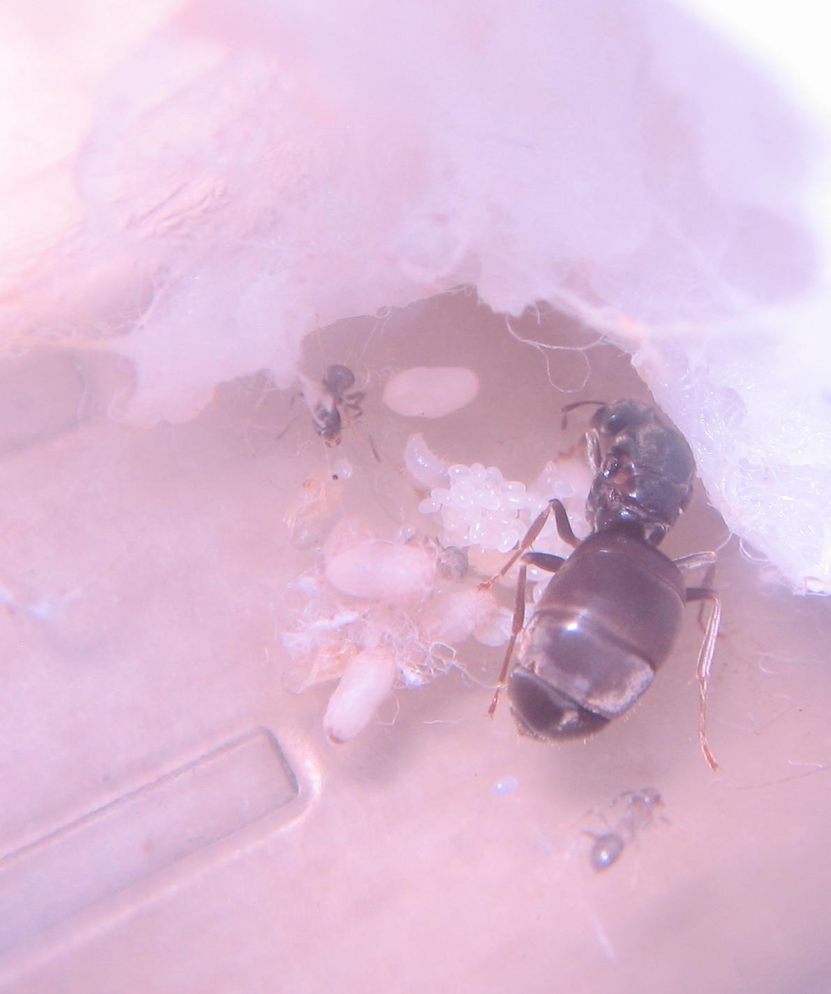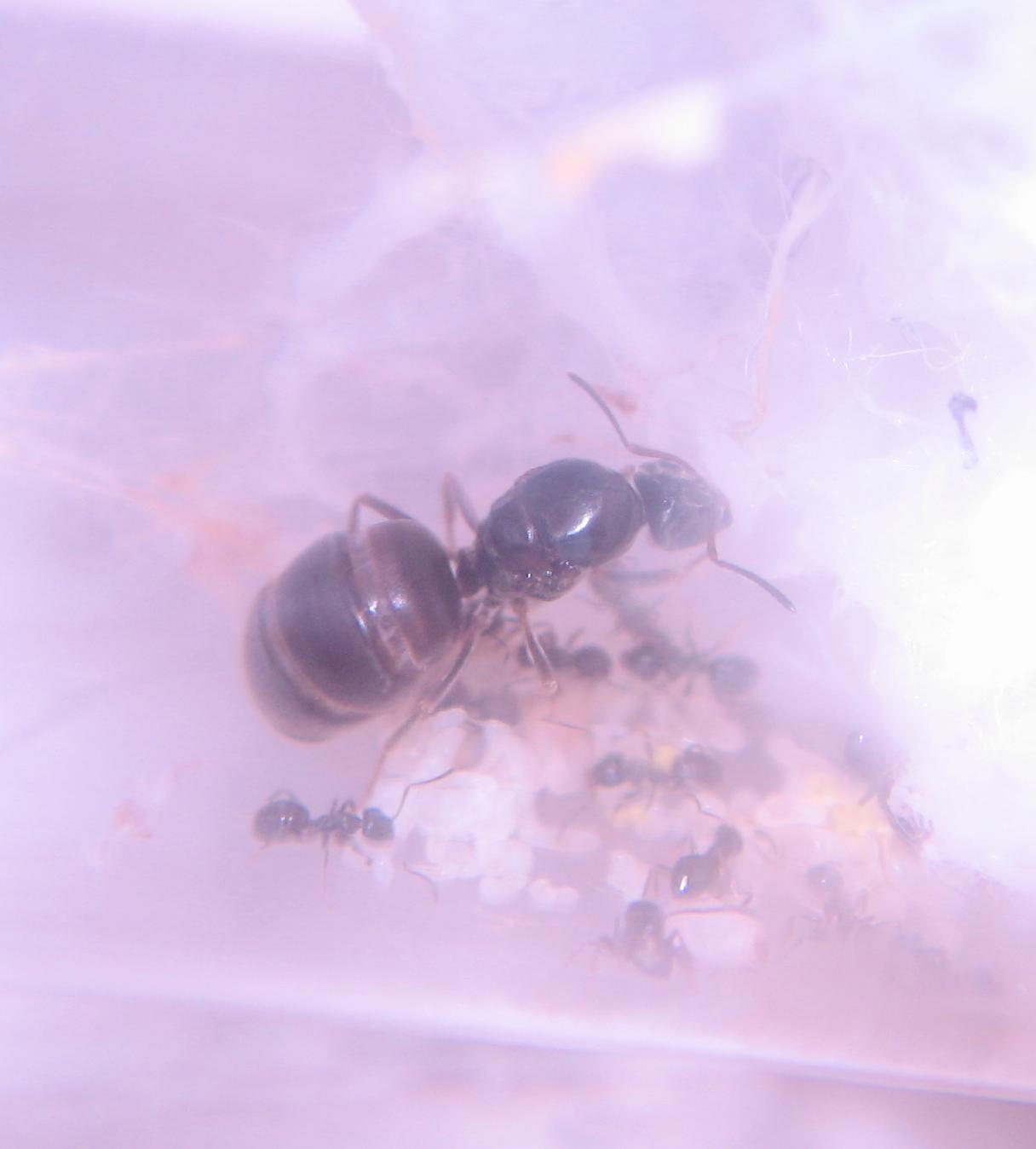 Da ich mitten in ner Betonwüste bin und die Königin genau hier auftauchte und ich auch ne Lasius Kolonie hab die meine Blattläuse melkt, dachte ich, die gehören sicher zusammen und hab mir ne Arbeiterin geschnappt um sie zur Königin zu setzen.