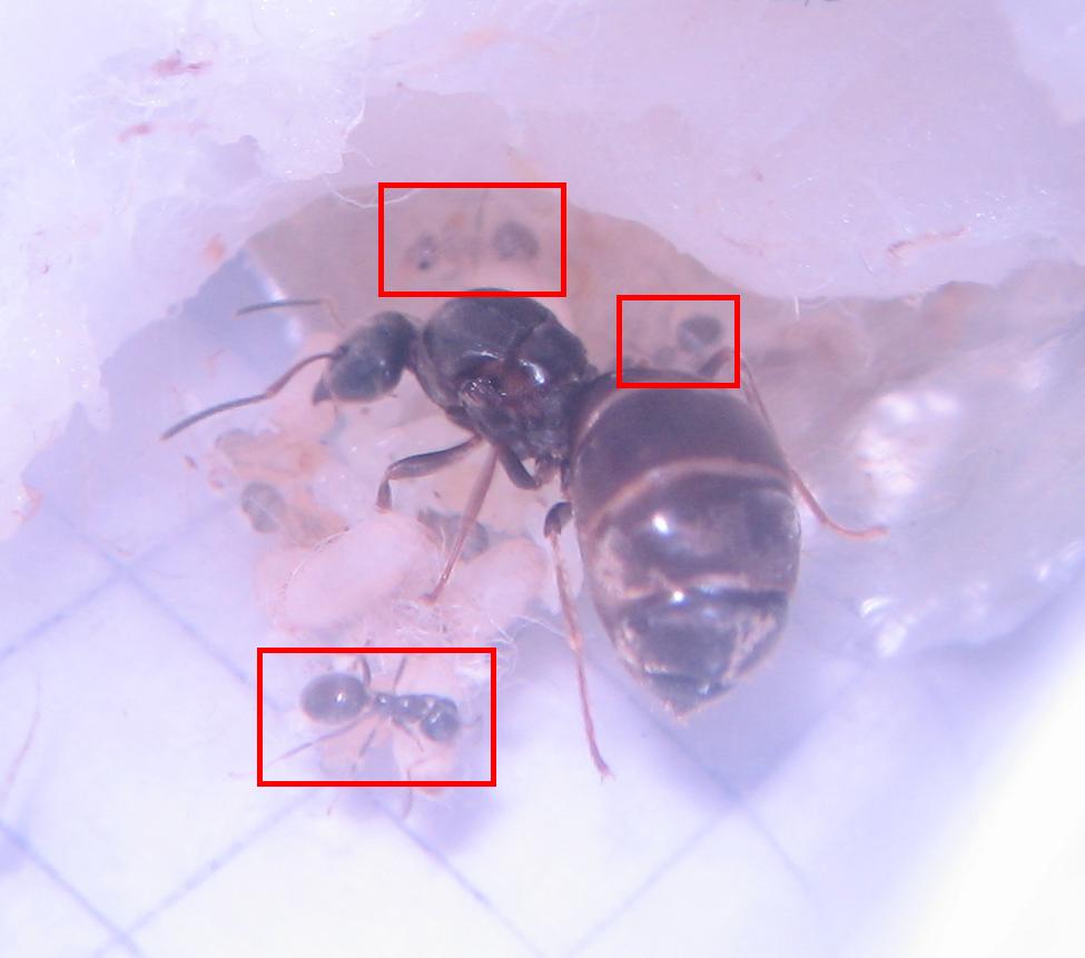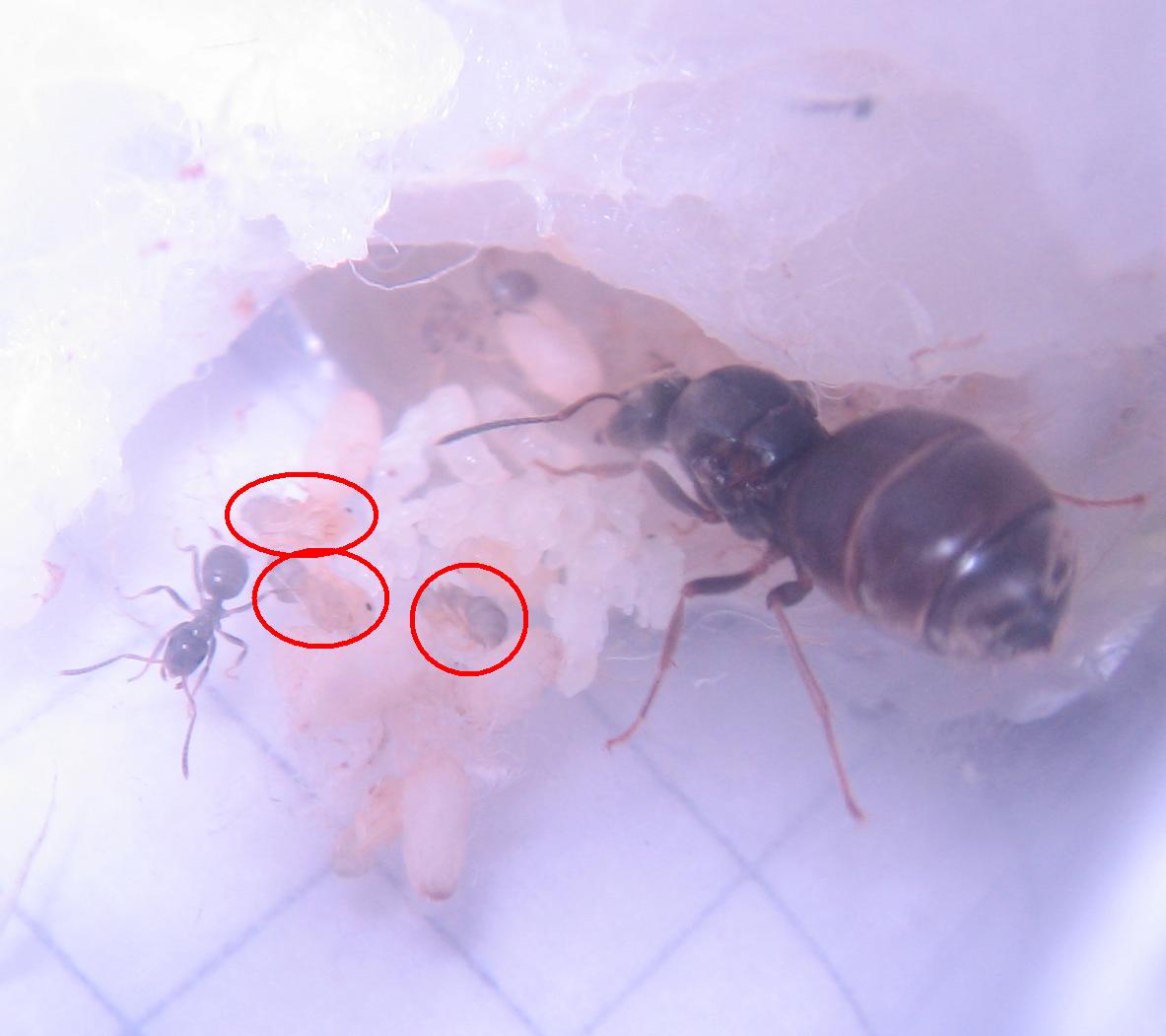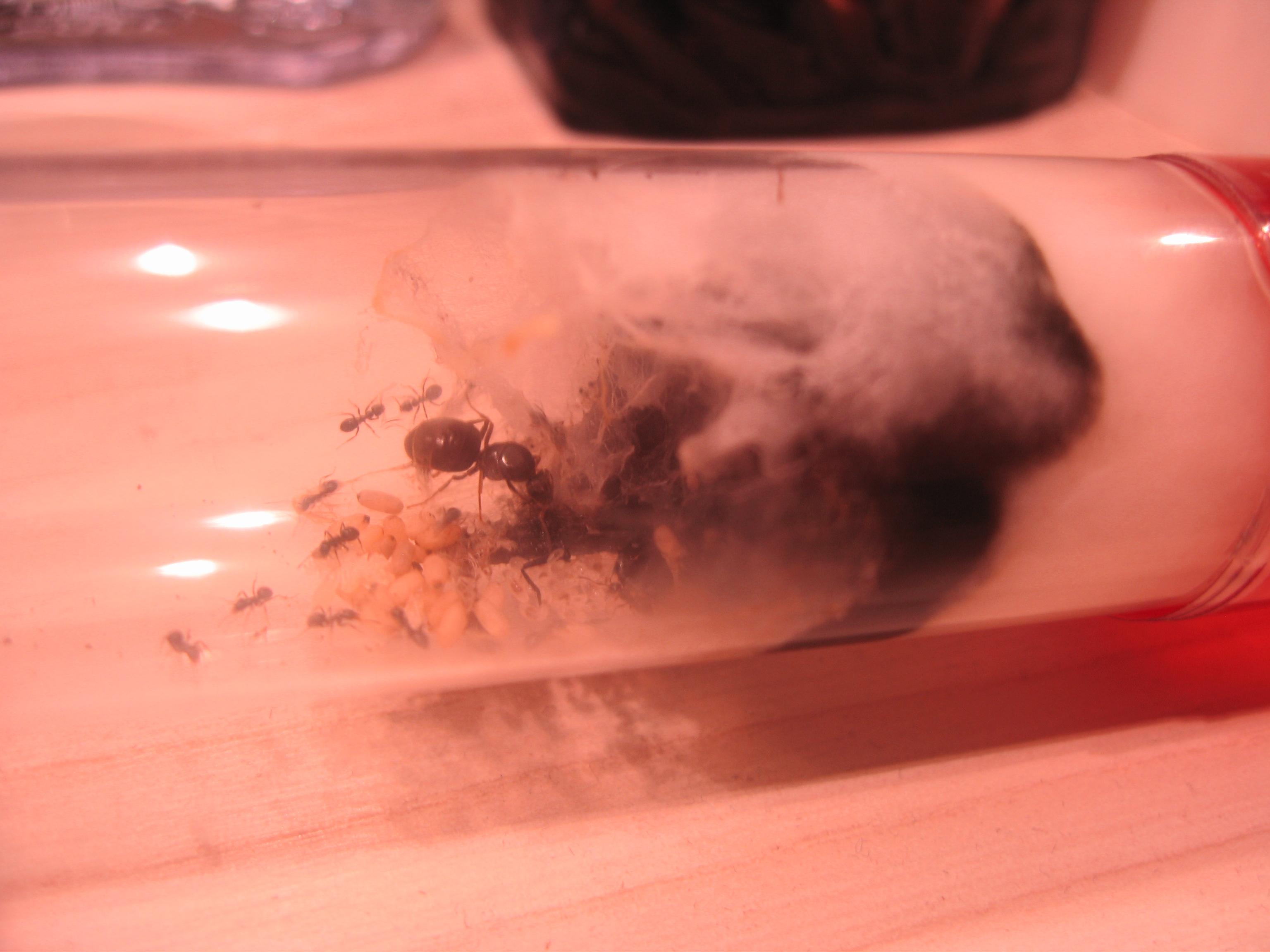 Da ich mitten in ner Betonwüste bin und die Königin genau hier auftauchte und ich auch ne Lasius Kolonie hab die meine Blattläuse melkt, dachte ich, die gehören sicher zusammen und hab mir ne Arbeiterin geschnappt um sie zur Königin zu setzen.