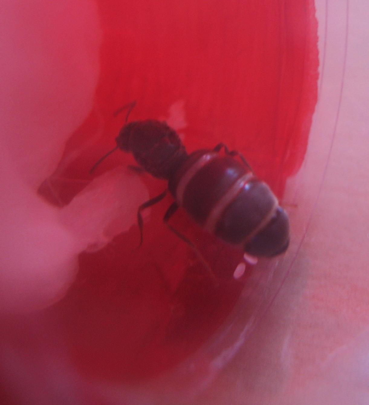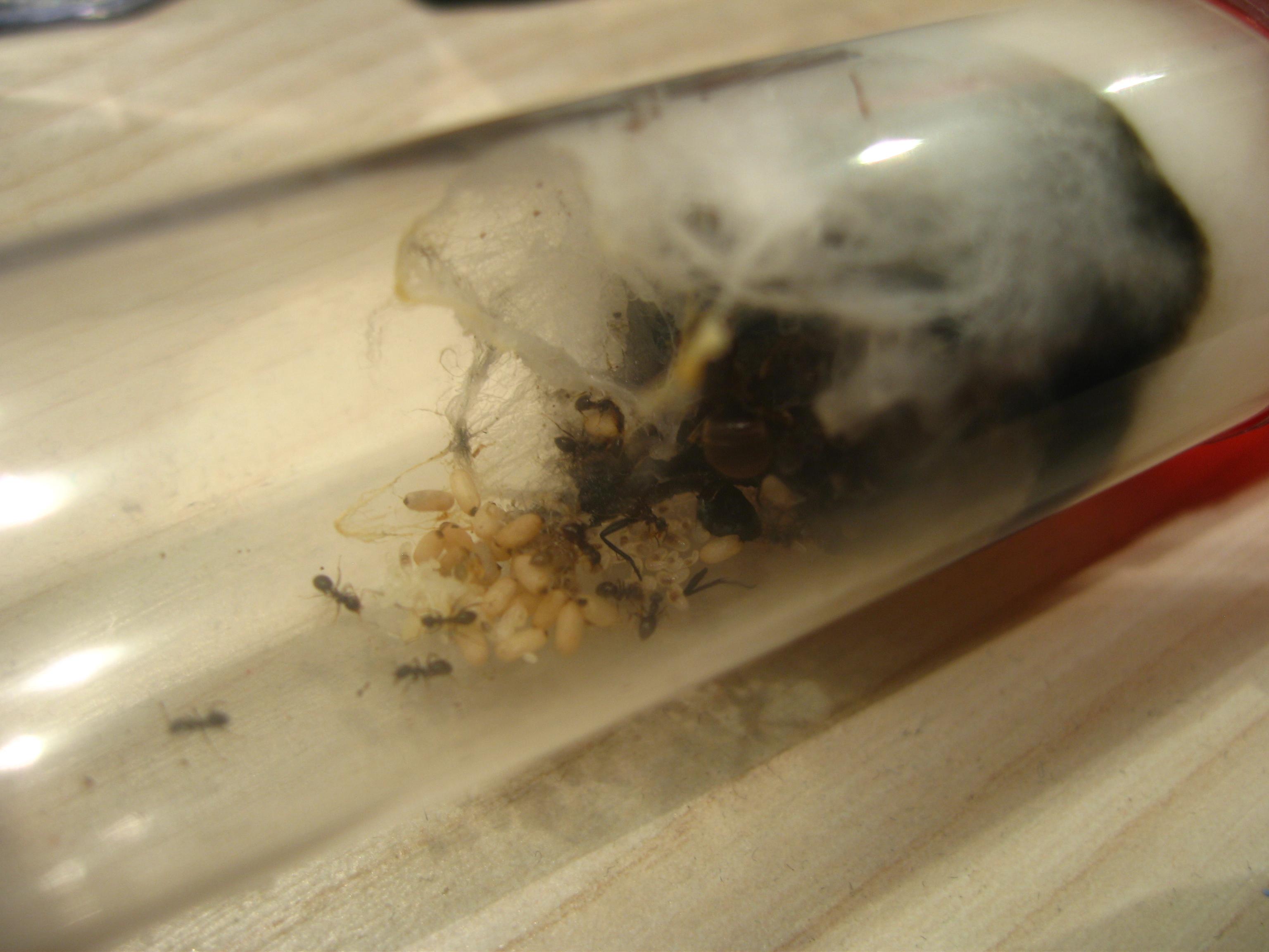 Dann berührt sie die Queen und es passierte. Die Arbeiterin attackierte sie wie irre ... die war so flink, dass meine Queen sich nichtmal drehen konnte während die Arbeiterin schon 5mal um sie rum ist. Ich konnte nichts anderes machen als die Arbeiterin so schnell wie möglich mit nem Holzstäbchen töten. Das ganze dauerte keine 30sec. aber meine Queen war total aufgebracht. lief im Reagenzglas hin und her und hat alle Ausgänge inspiziert. Da wo ich die Arbeiterin rein hab, hat sie besonders aufmerksam kontrolliert. naja, sie beruhigte sich nach etwa 10min wieder und ging erstmal zum Wasserspender.