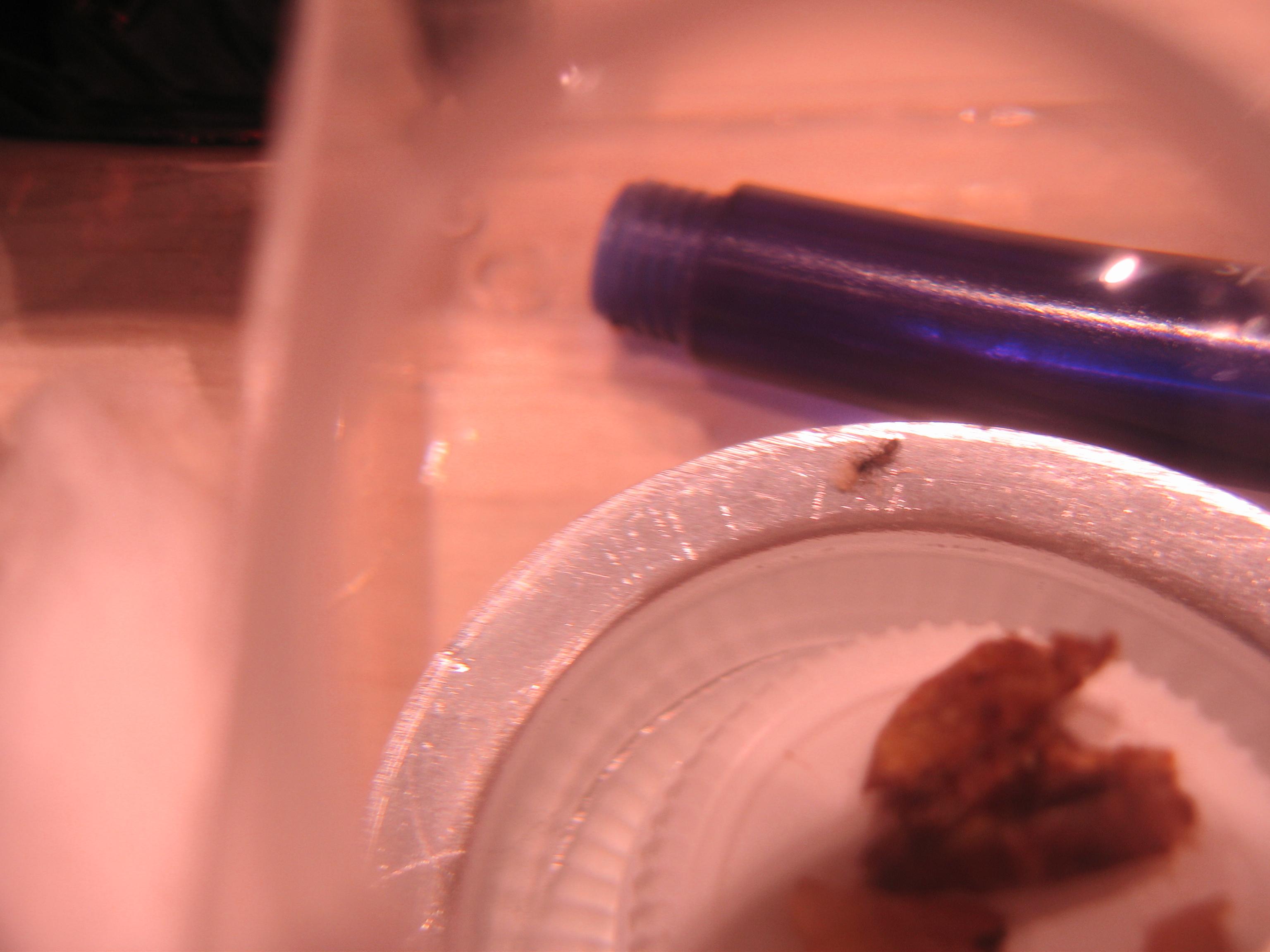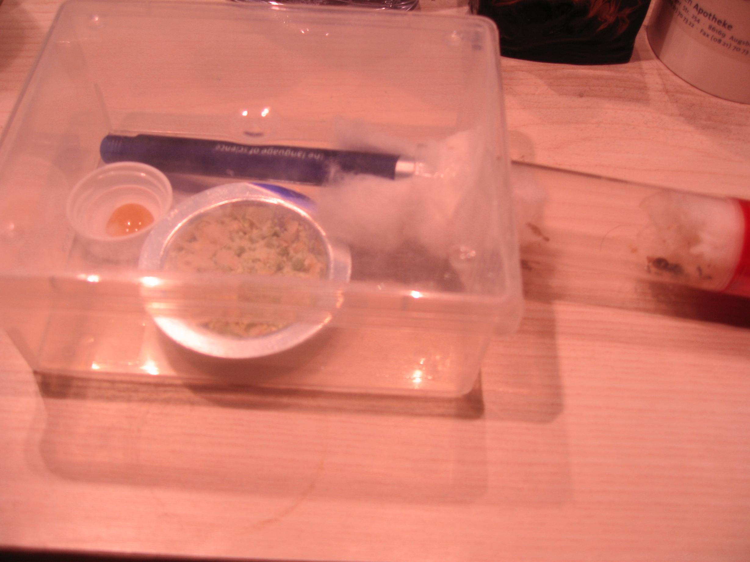 nun ist die in einem Reagenzglas (ein halbes sog. Zentrifugenglas) und hab es mit Eding rot angemalt. Klappte super, sie merkt nichtmal wenn ich sie unter Halogen halte etc. ... bzw. sie reagiert nicht darauf. Anonsten ist Wasser drin und einige Blattläuse ... größeres wollte ich nicht mit reinpacken.