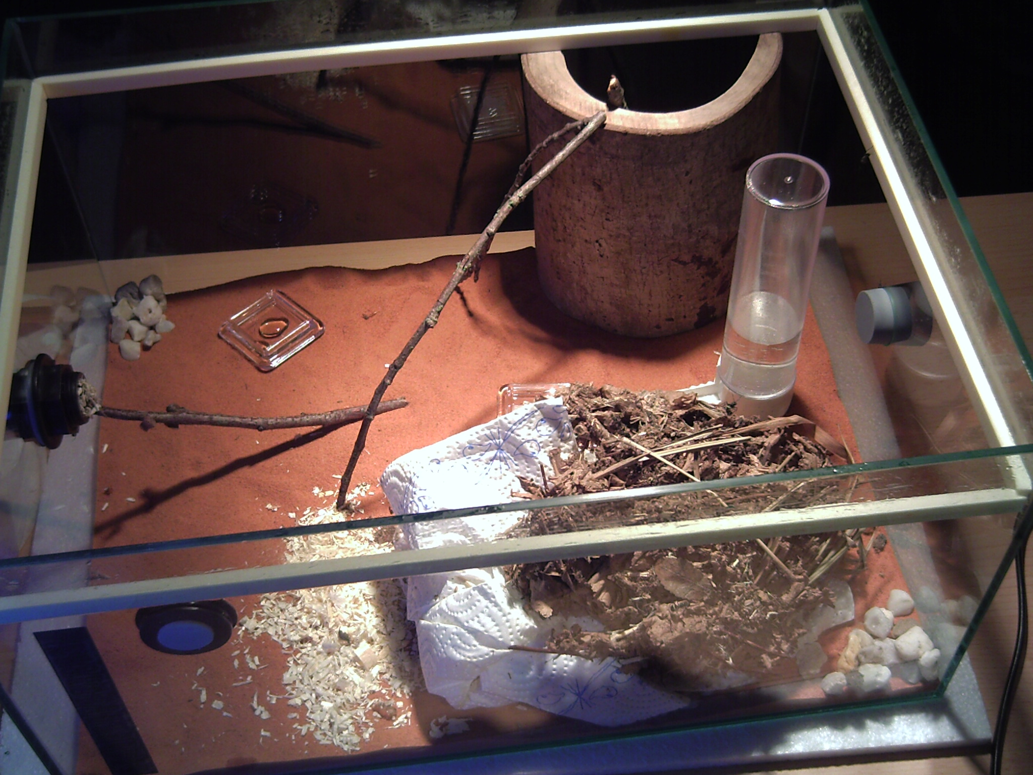 Vor ein paar Tagen hatte ich Zuckerwasser in das Becken gestellt und heute musste ich feststellen, dass das Wasser daraus verdunstet ist und 3 Ameisen im Zucker klebten.