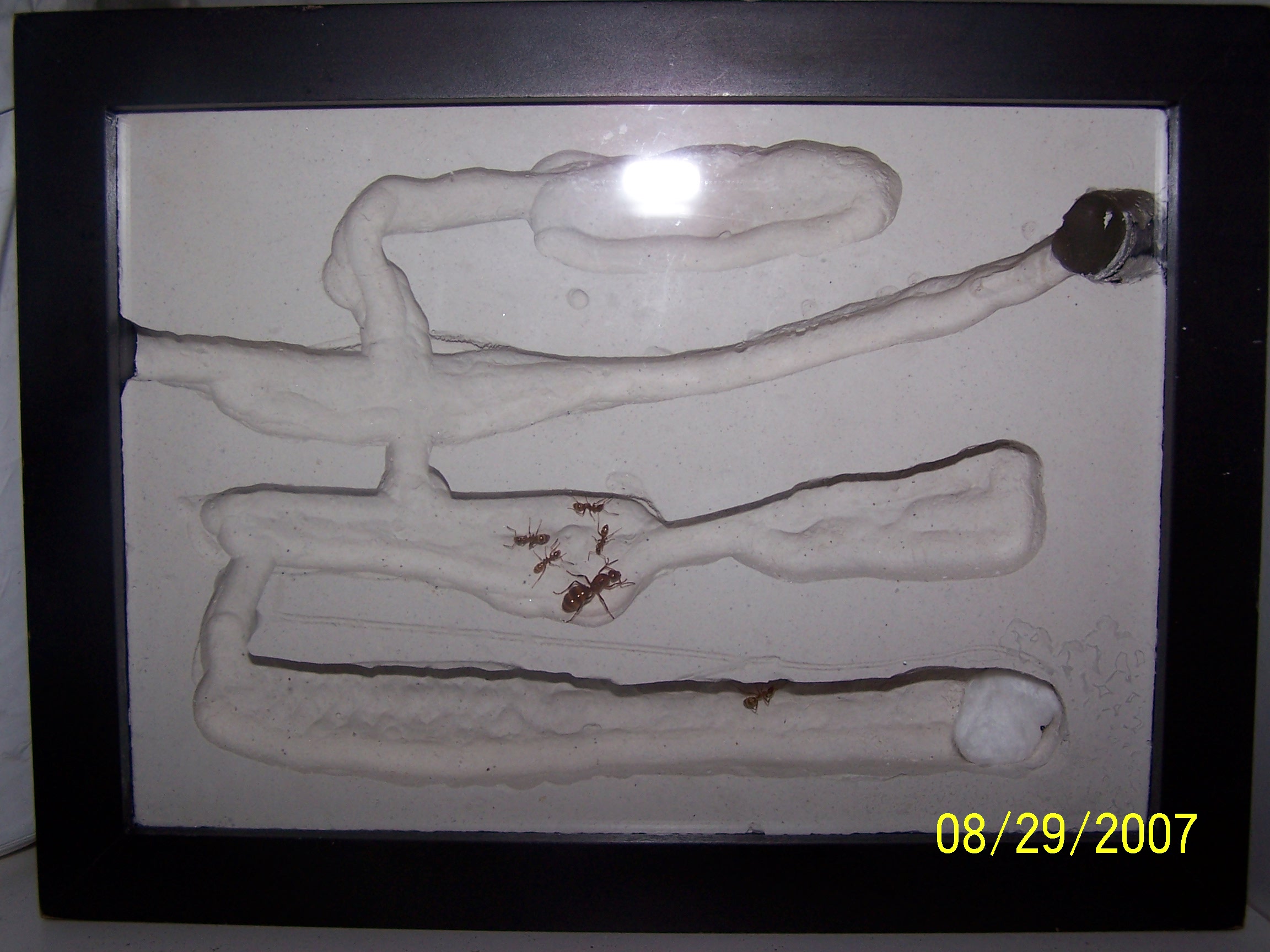 She only has 5 workers. This is a 4 inch picture fram I am using and you'll notice on the bottom right I have a few cotton balls stuffed in a hole that I keep moist from the back. You'll notice on the top right is where it leads to the hony water and soon to be feeding area.