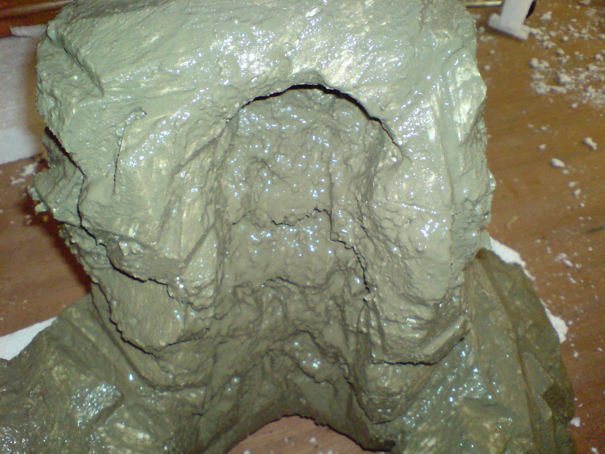 Deswegen habe ich jetzt eine große Rückwand mit mehreren ebenen Eingebaut. Die habe ich Auch aus Styropor geschnitzt und sie mit Fliesenkleber bestrichen aber ohne Epoxydharz bestrichen. :grin: