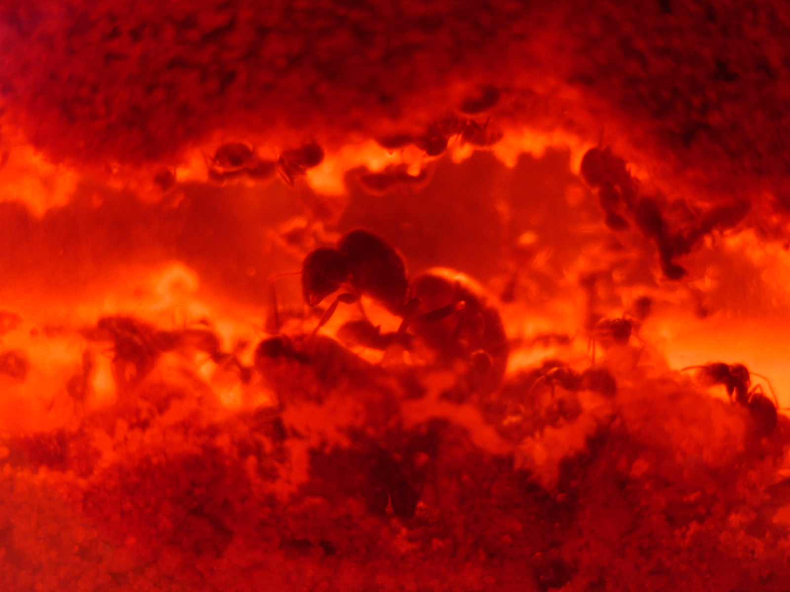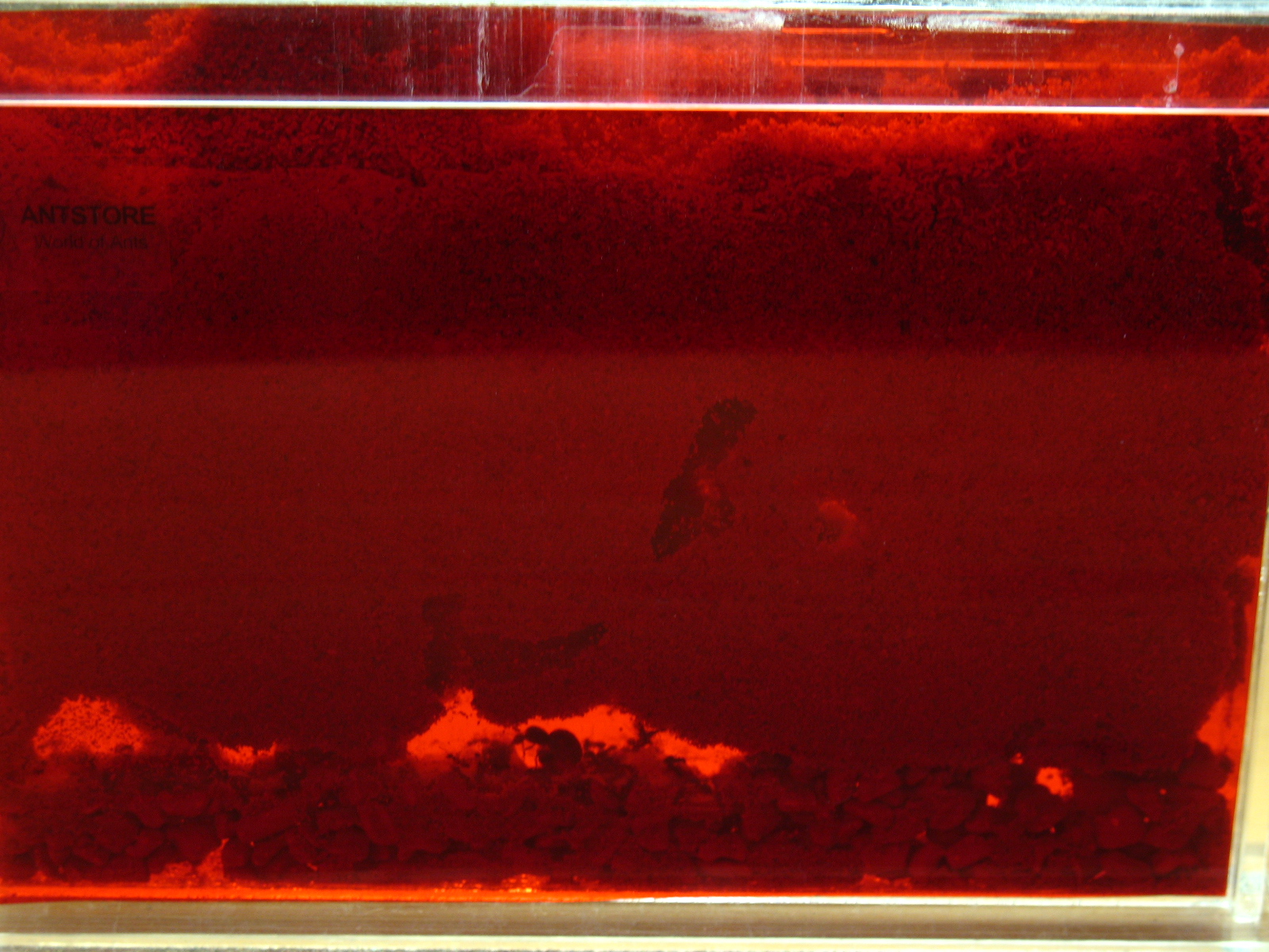Ab und zu richte ich jetzt auch eine 40W Birne auf die Arena um den Ameisen ein bisschen "aufzuheizen" und sie kommen immer in die neue Arena um ein Sonnenbad zu nehmen.