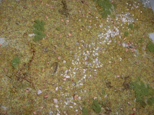 Auf dem Bild unten ist auf Pappe Holzleim aufgetragen, kleine Steinchen/Korkstücke drauf, die feinen Grashaarchen und ein paar dickere Flocken, dazu noch ein bisschen getrocknetes Moos.