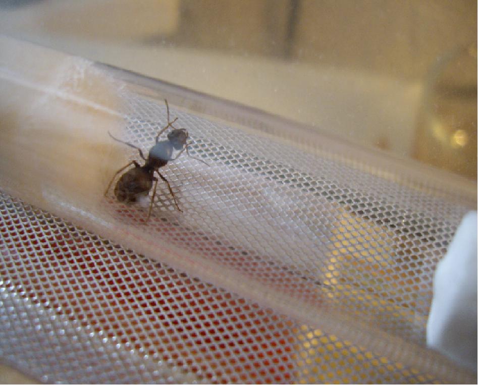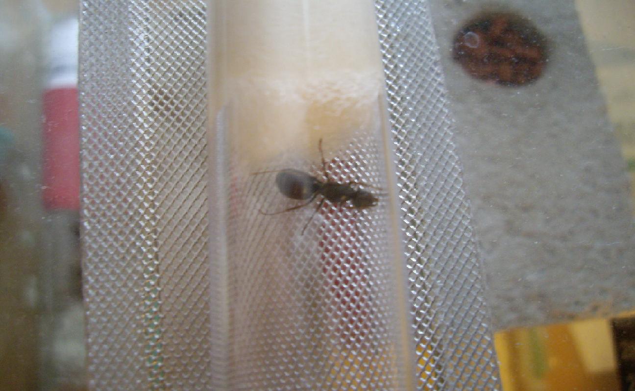 Sie ist etwa 1,2-1,4 cm groß, hat rotbraune Beine und gräuliche Streifen auf dem Gaster. Der "Körperbau" erinnert an Lasius niger, aber Lasius niger kann ich ausschließen. Ich tippe auf Formica (warscheinlich serviformica) spec.