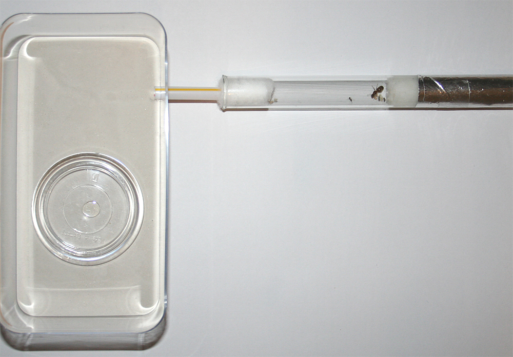 hier die Rocher-Box mit angeschlossenem Reagenzglas. Verbunden wurde beides mit einem Trinkhalm.