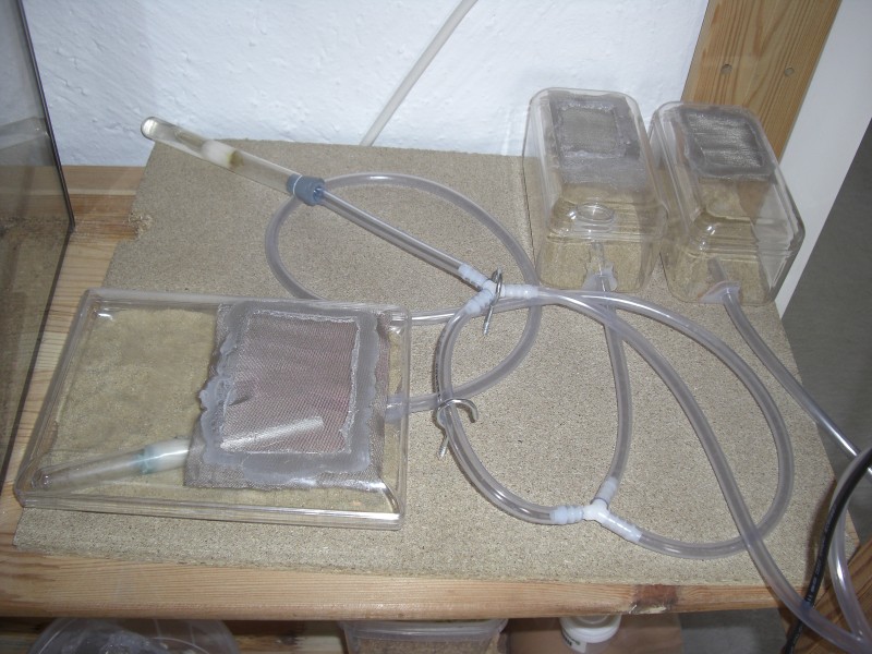 Da sie echt Ausbruchskünstler sind und mittlerweile sogar die allerbesten PTFE Schichten einfach überwandern hilft nur ein Formicarium, was 100%ig Ausbruchssicher ist. Bei einem normalen Aquarium schaffe ich das irgendwie nicht. Also musste Ferrero herhalten. Eine etwas größere Arena in der momentan noch das RG liegt. 1 Meter Schlauch führt zu einer weiteren Arena. Von da gibts noch nen Anschluß, an dem momentan ein weiteres RG hängt und noch 1 Meter Schlauch für eine weitere Arena. Da auf den Schläuchen etwas Zug liegt, habe ich die Miniarenen mit doppelseitigem Klebeband auf eine Holzplatte geklebt. Sieht alles leider nicht so toll aus ... und bei näherer Betrachtung erkennt man, dass ich auch ordentlich mit Silikon rumgesaut habe ... aber mittlerweile ist mir das Aussehen des Formicariums ziemlich egal ... hauptsache da kommt niemand raus.