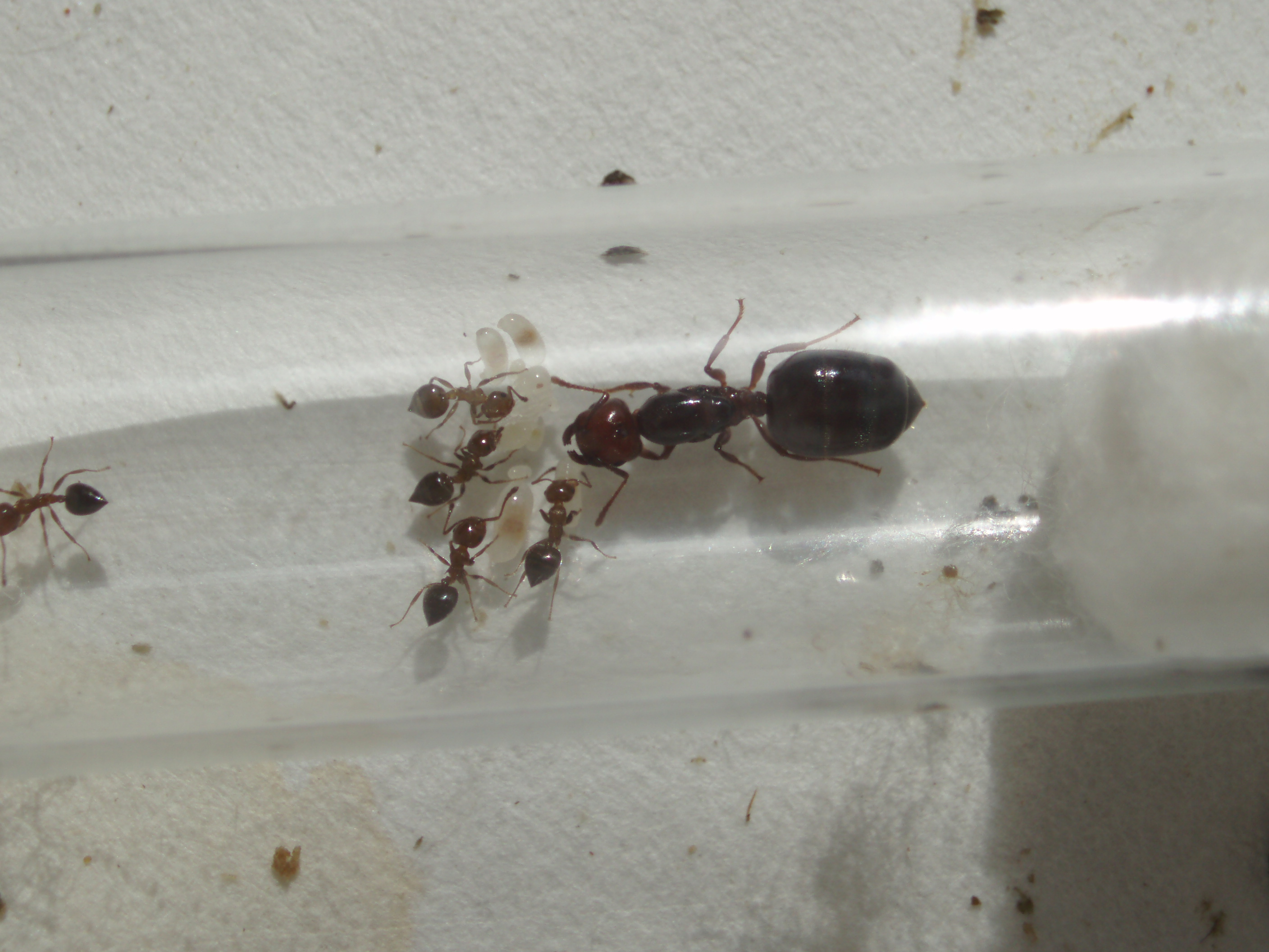 This queen came in flying through the window, in a raining day some days ago. Does anybody knows what ant is this? What it eats? It needs humidity? How much? As you can see the queen has lots of eggs already.