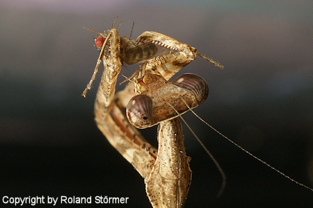 Wir halten auch einige Mantiden. P. pinnavonis wird bald noch dazukommen. Zur Zeit besteht unser Bestand aus einem subadulten Orchideenmantis Weiblein, einem l2 oder l3 Rindenmantis und einer adulten H. membranacea Weib. Angafangen hat Alles letztes Jahr mit einem Blütenmantis und P. paradoxa.