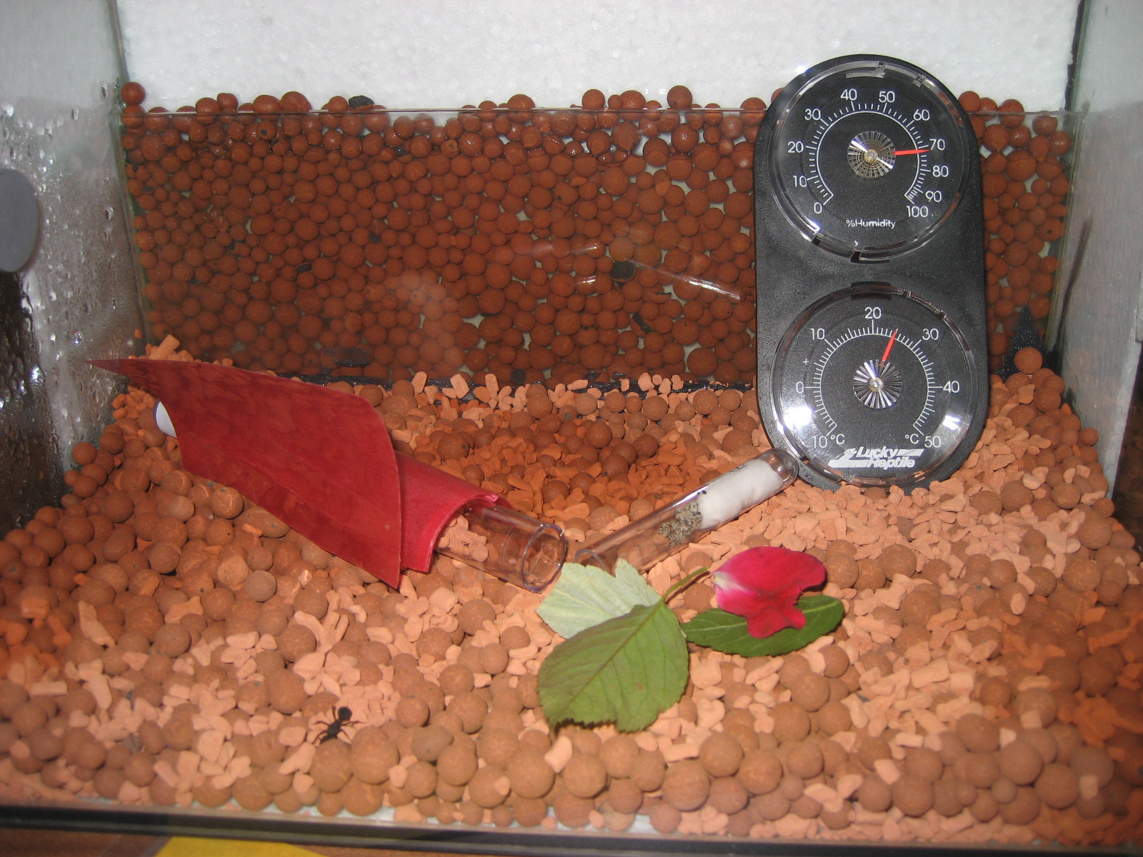 Meine Luftfeuchte hält sich am Analogen Anzeigegerät bei 75% und beim Digitalen bei 85-87% wobei ich mit einem 2ten analogen Gerät die 75% bestätigen konnte.Mein Becken ist eigentlich eine Farm von Anstore welche (wie im ersten Bild zu sehen ist) mit Tonkügelchen gefüllt ist. Alle 5-7 Tage fülle ich so ca. 50ml Wasser nach und beheize das Becken von hinten mit einer 7 Watt Heizmatte.Raumtemp. liegt bei 22-23°.Temp. im Becken konst.26°.