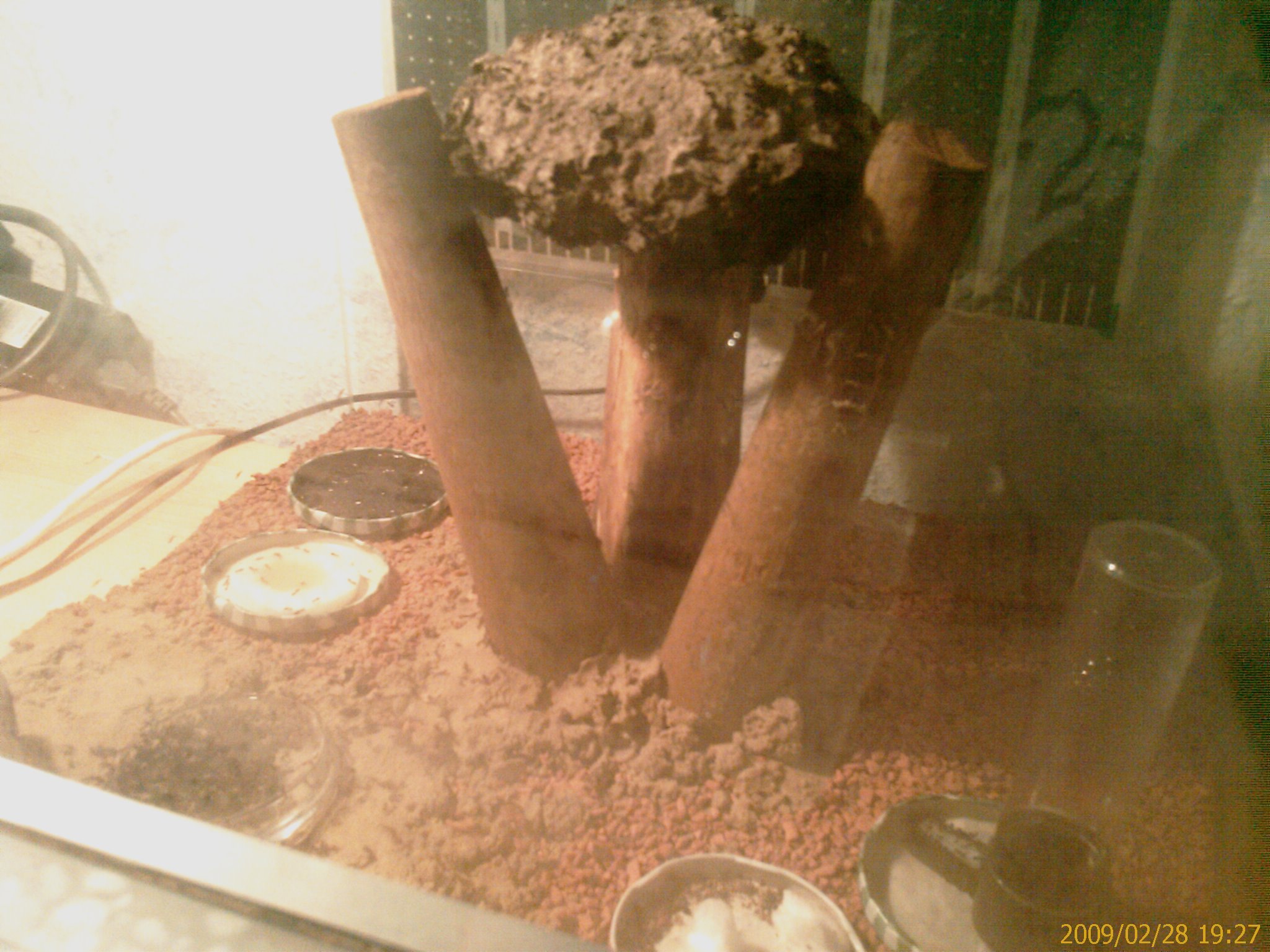 Das Futterbecken sieht man nicht steht genau da wo ich das Foto mache.....Das war ganz am Anfang da hatte ich noch Probleme mit der Luftfeuchtigkeit aber habe jetzt Ventilatoren drinne......