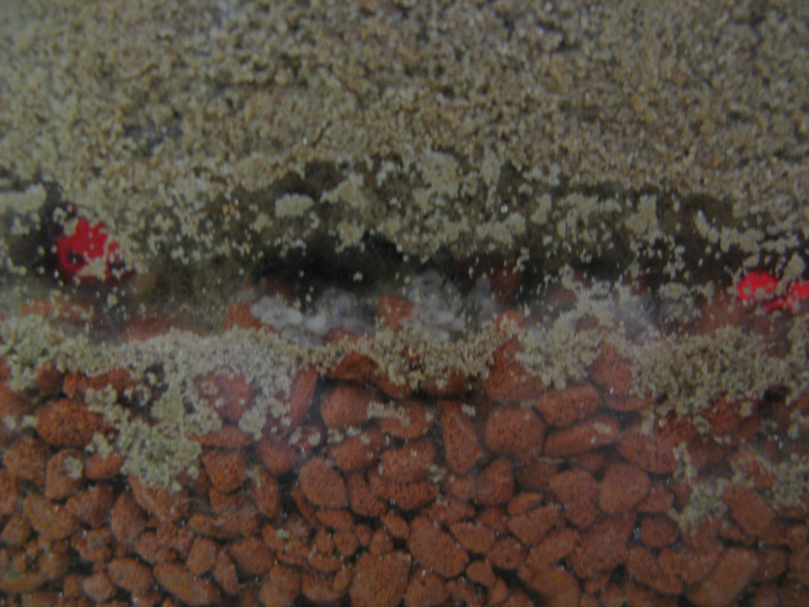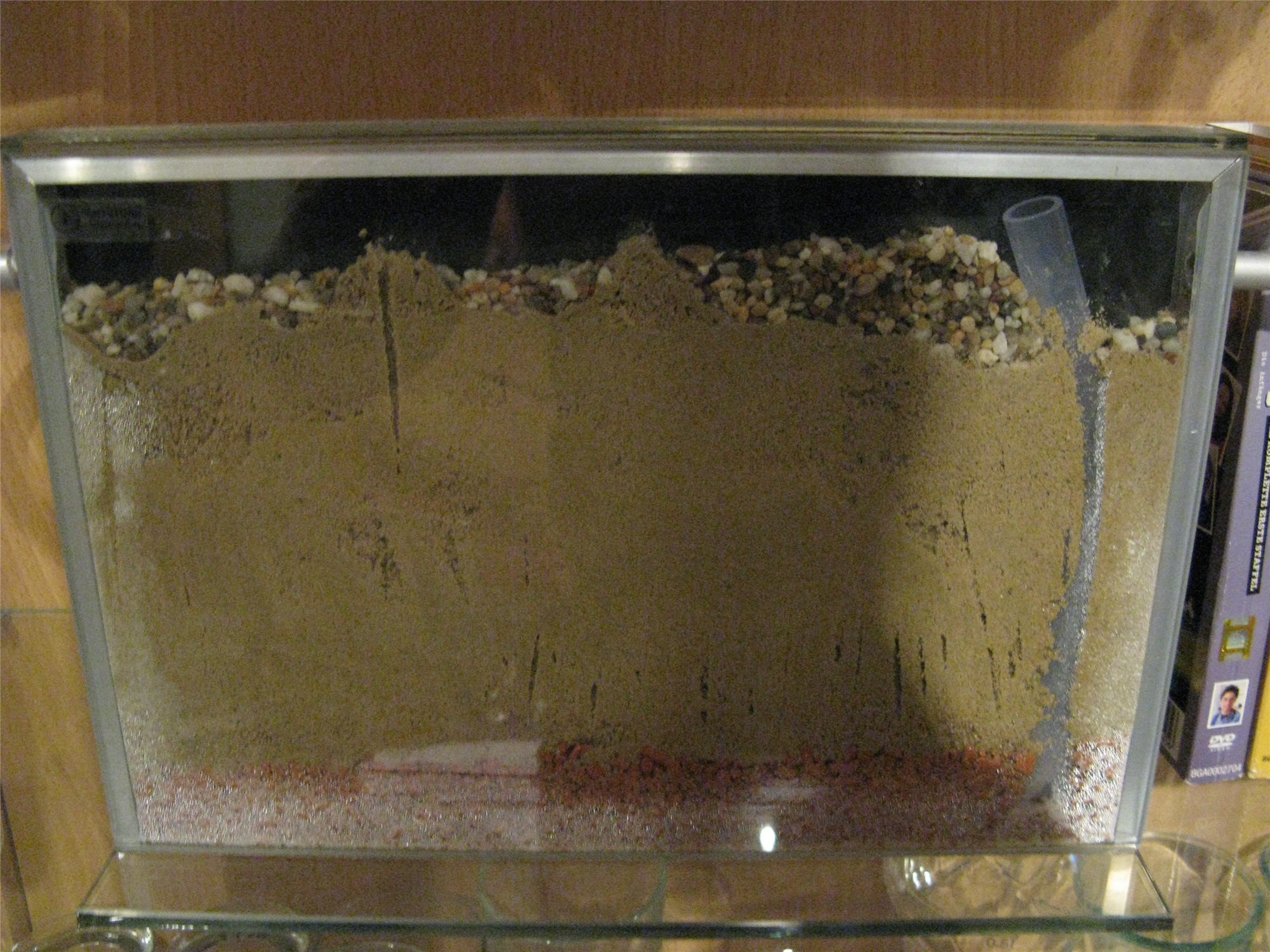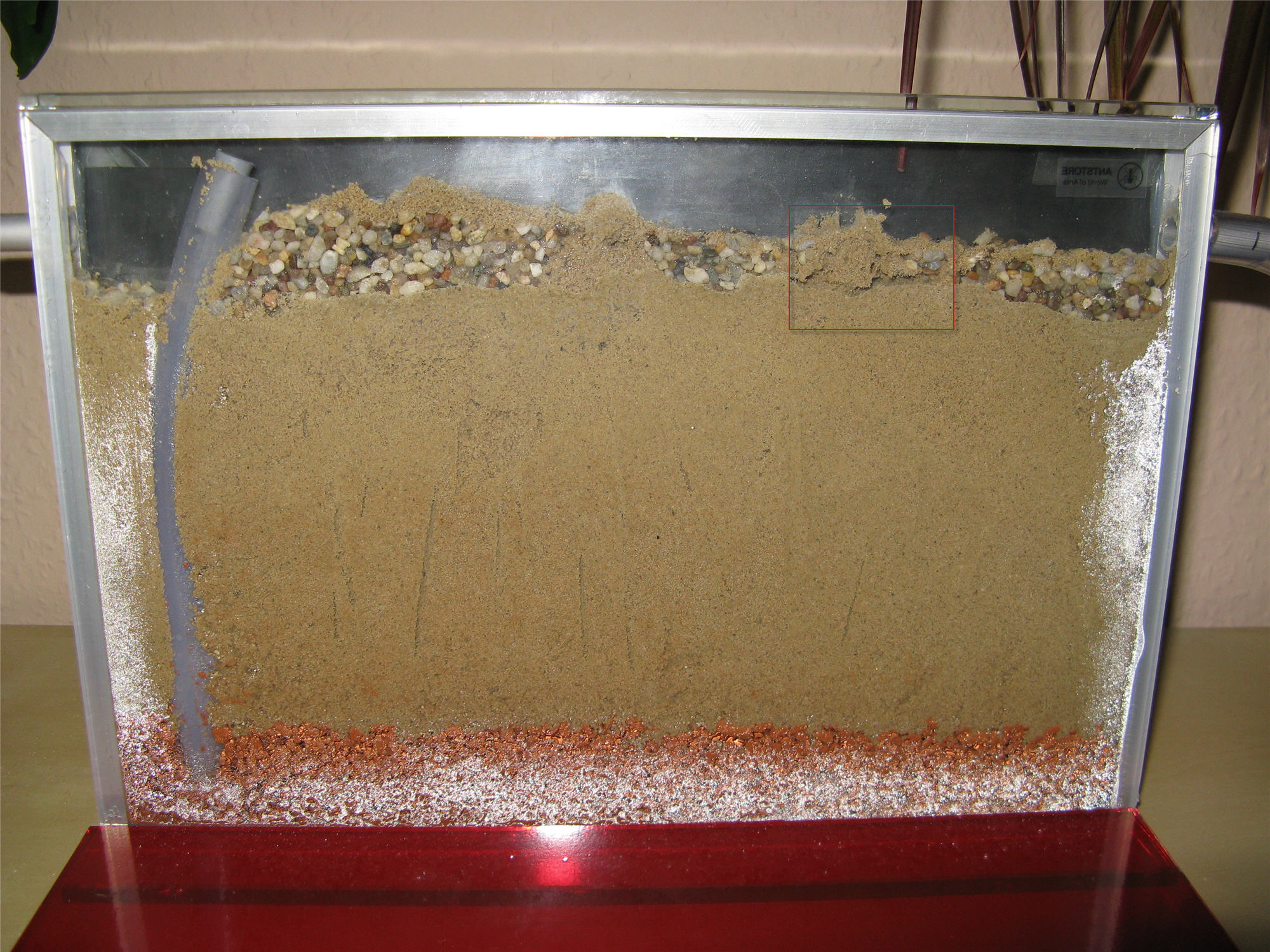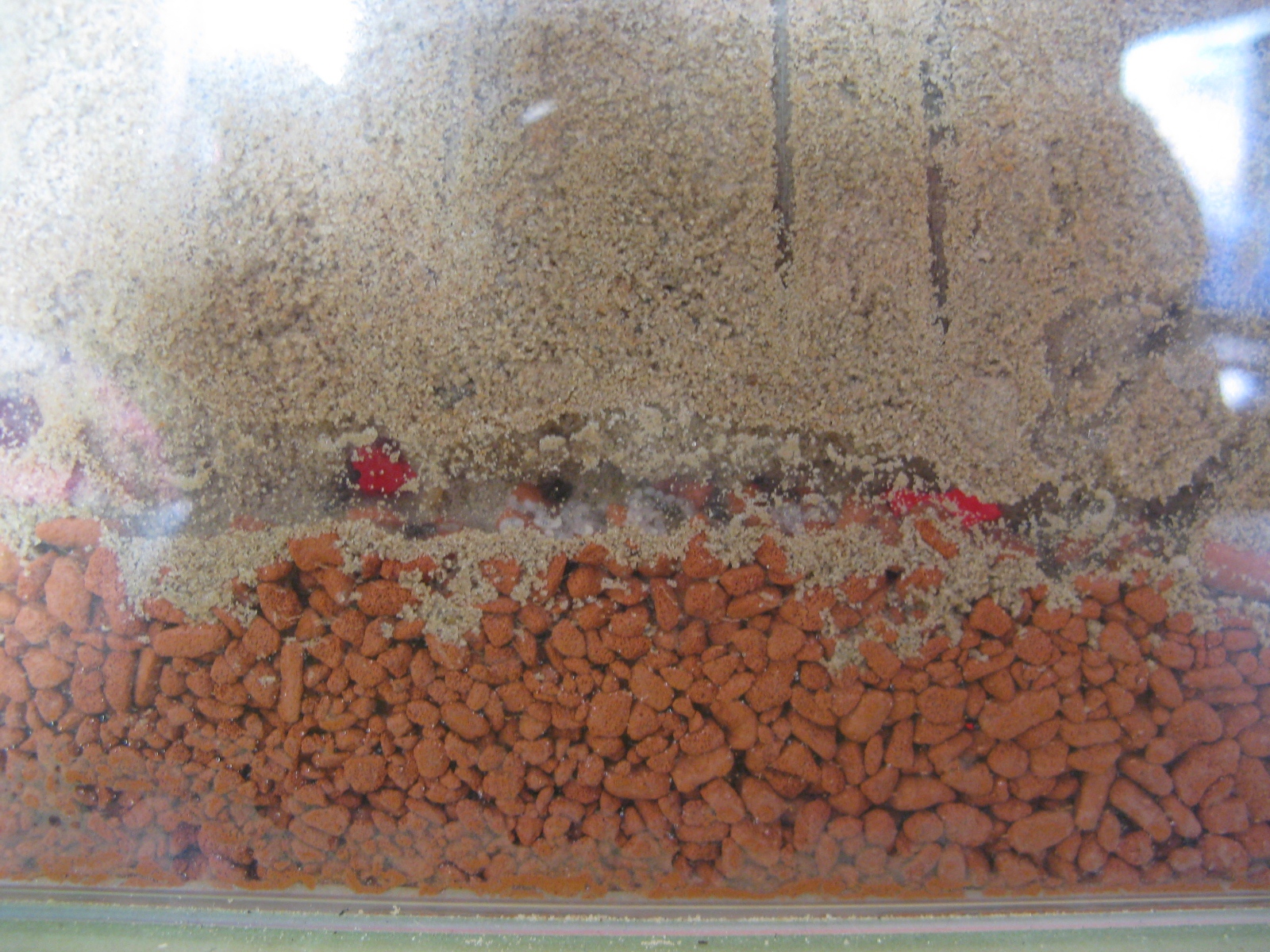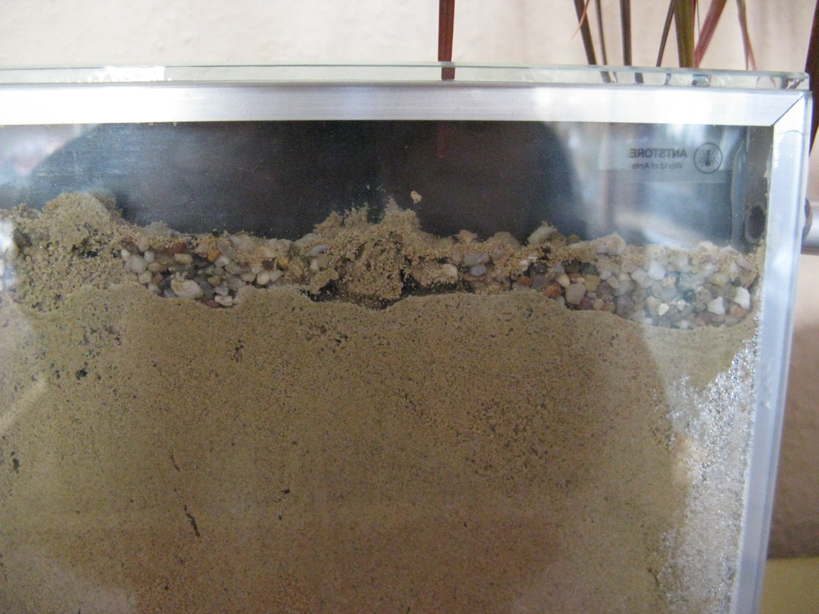 Danach machte ich mich dran um alles vorzubereiten und das Material zu verbauen. Die Farm habe ich wie üblich mit einer geringen lage Granulat und einem Sand/Lehm gemisch 1:1 befüllt, ganz zuletzt habe ich Kies verwendet was zur deko dienen soll. Die Drinage beutze ich wie üblich um Feuchtigkeit vom Deckel ins Granulat zu bekommen. Das Formi. habe ich mit dem Lehm befüllt gut befeuchtet und trocknen lassen damit dieser ungrabbar wird, um die enstehenden Risse zu kaschieren streute ich ein wenig Sand und Kies über den Lehmboden. Die Insel baute ich nahe dem Schlauchausgang um sie als Leiter zu nutzen, damit der aufstieg zum Schlauch vereinfacht werden kann. Der Ausbruchschutz wird durch einen Glaßdeckel mit Gitter und einer Schicht PTFE gewähleistet, wobei die Schicht PTFE selbst nach dem zweiten Versuch nicht den Schutz bietet den ich haben wollte.