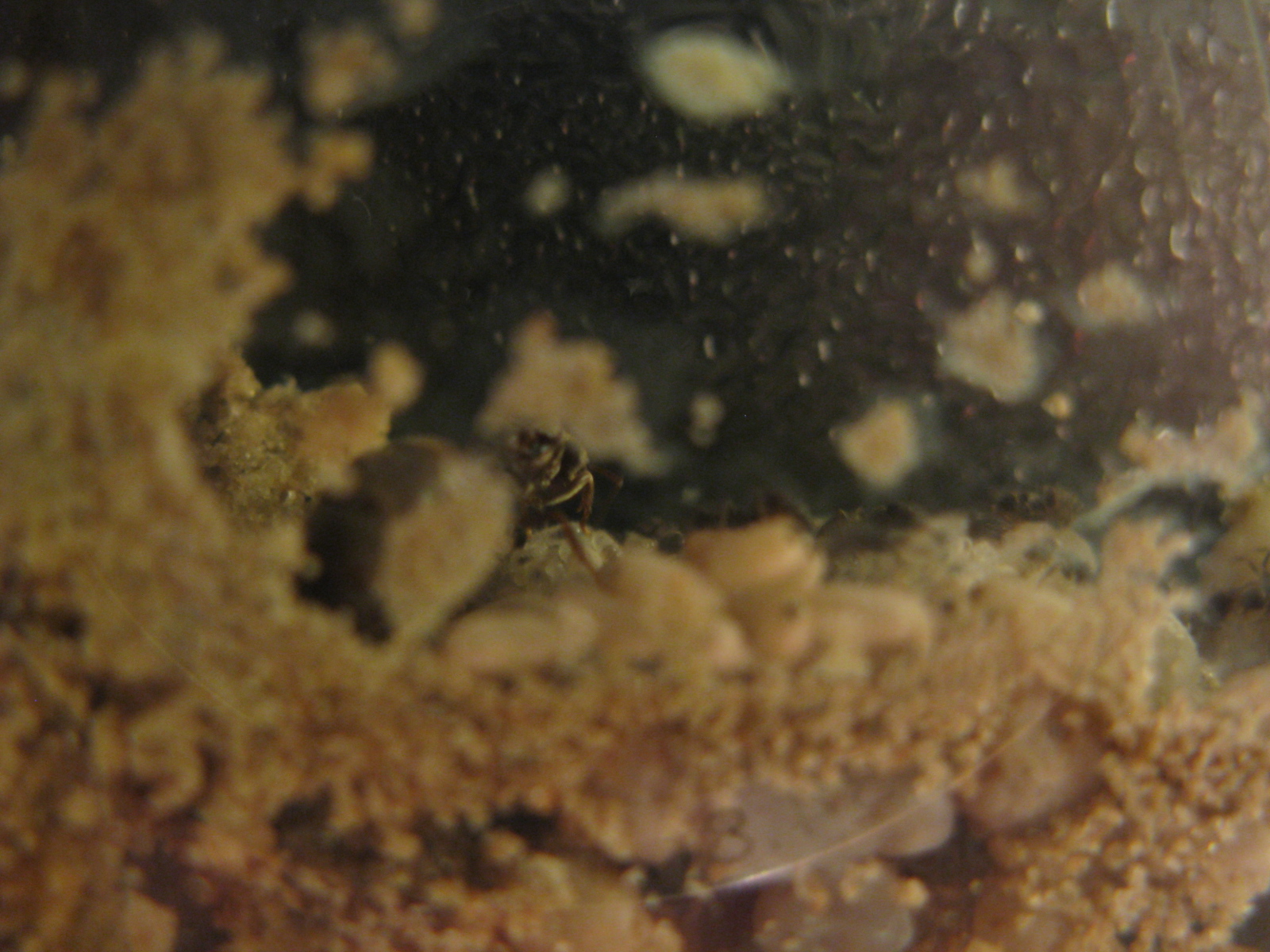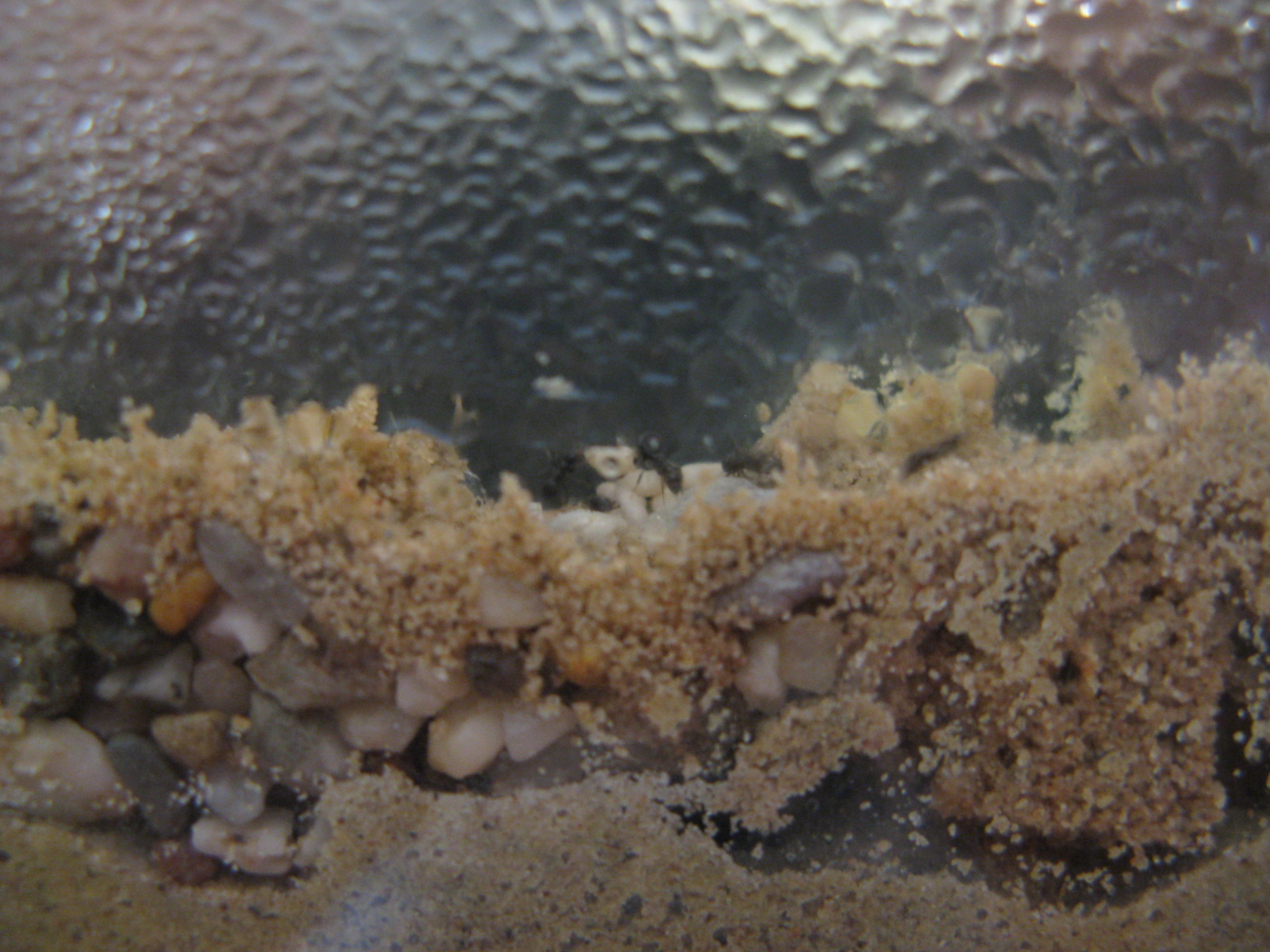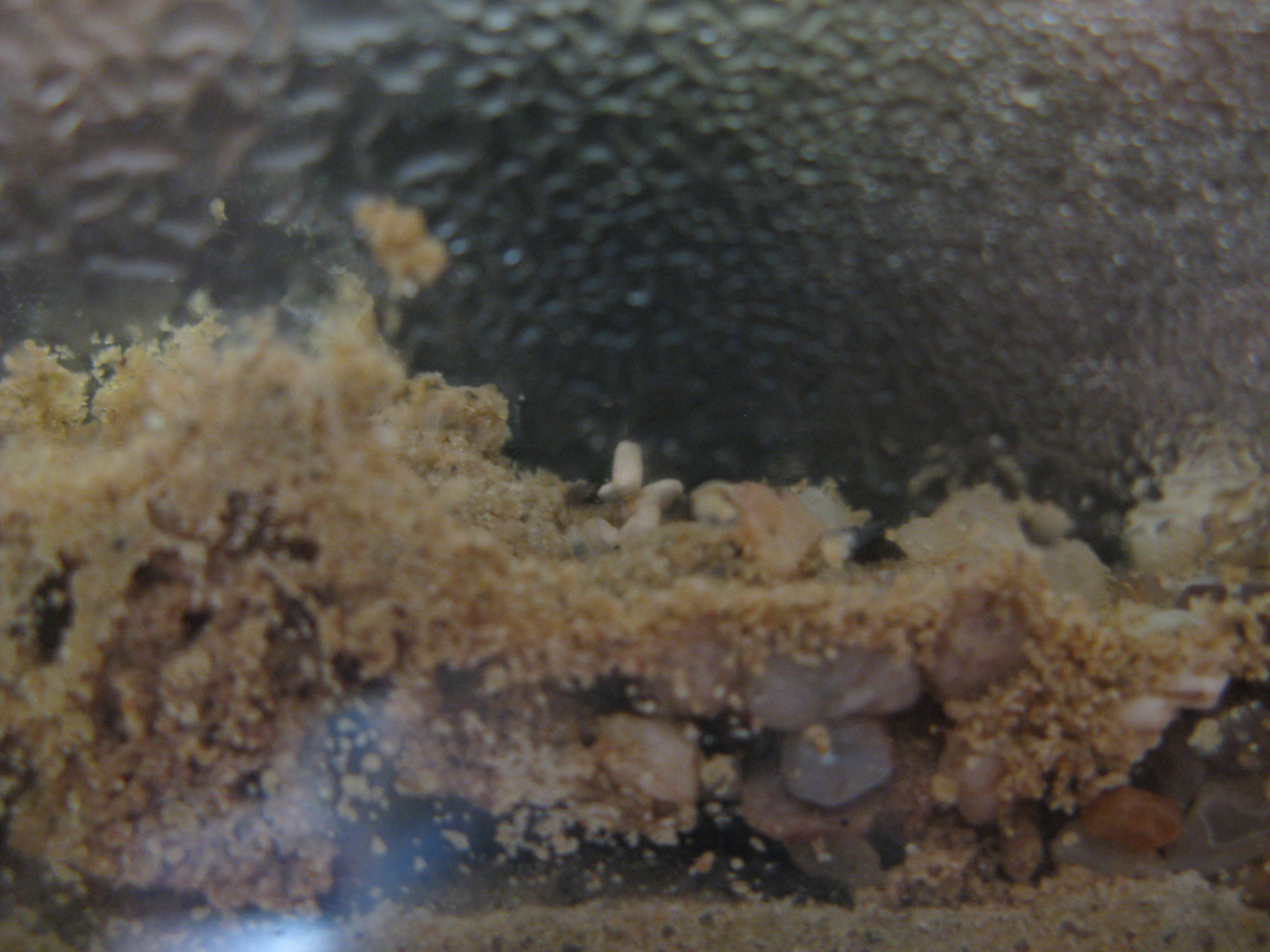 Also die Kammer in der Farm wird stätig größer, nur kann man noch nicht so wirklich erkenne, was sie später damit machen werden. Die kammer liegt fast unmittelbar unter der Oberfläche und damit eignet sie sich nicht so toll für die Brut/Königinnenkammer aber wie immer abwarten und Tee trinken :) . Aber wie gesagt, es wird dauernd daran gefeilt und gebastelt mit 4-6 Meisen zugleich, was vorallem Lustig ist, dass meine Dekokiesschicht fast komplett mit dem Aushub bedeckt ist :P .