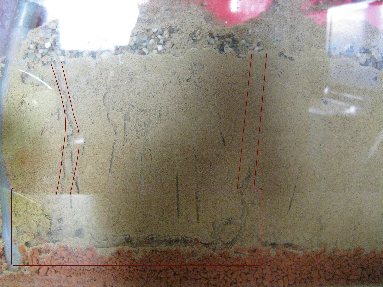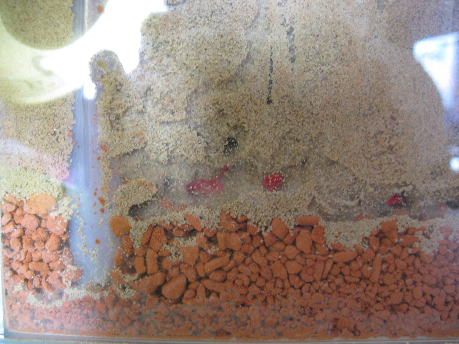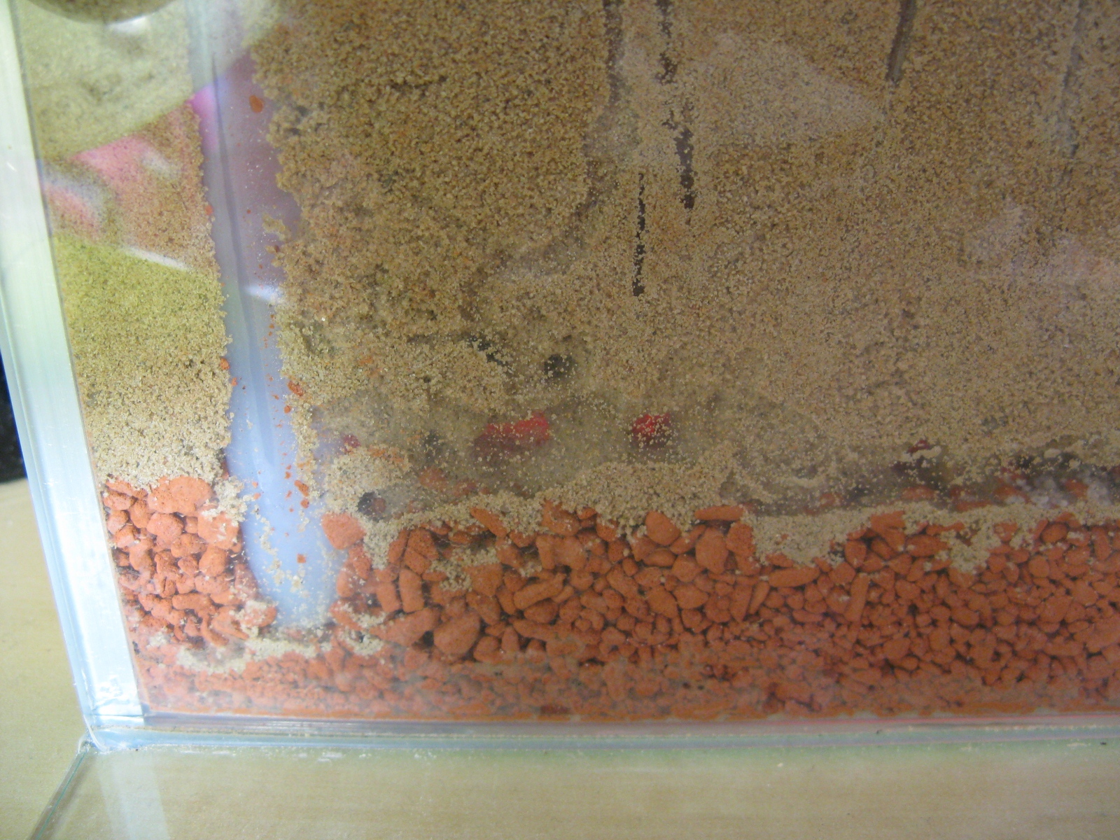 Also die Kammer in der Farm wird stätig größer, nur kann man noch nicht so wirklich erkenne, was sie später damit machen werden. Die kammer liegt fast unmittelbar unter der Oberfläche und damit eignet sie sich nicht so toll für die Brut/Königinnenkammer aber wie immer abwarten und Tee trinken :) . Aber wie gesagt, es wird dauernd daran gefeilt und gebastelt mit 4-6 Meisen zugleich, was vorallem Lustig ist, dass meine Dekokiesschicht fast komplett mit dem Aushub bedeckt ist :P .
