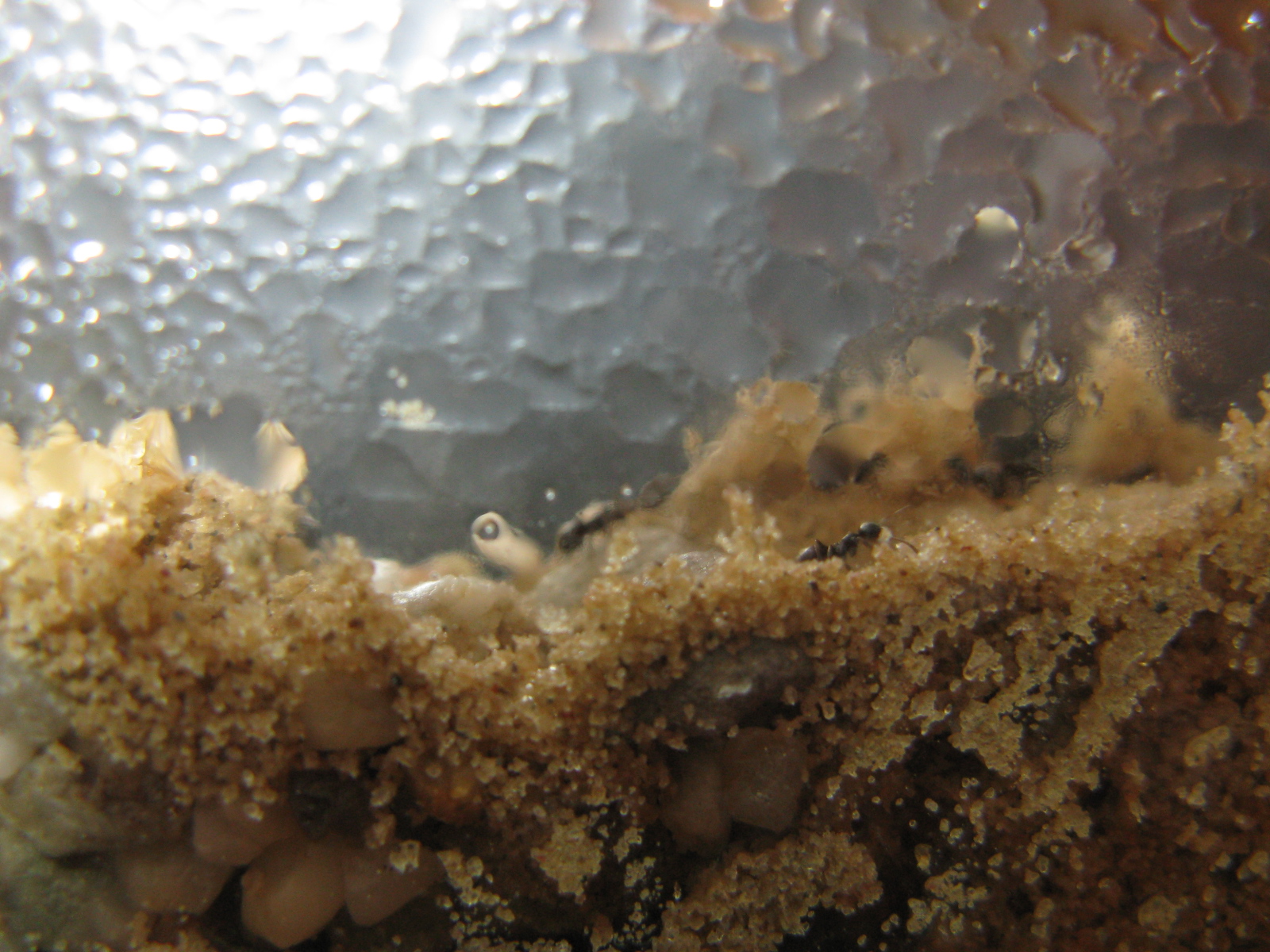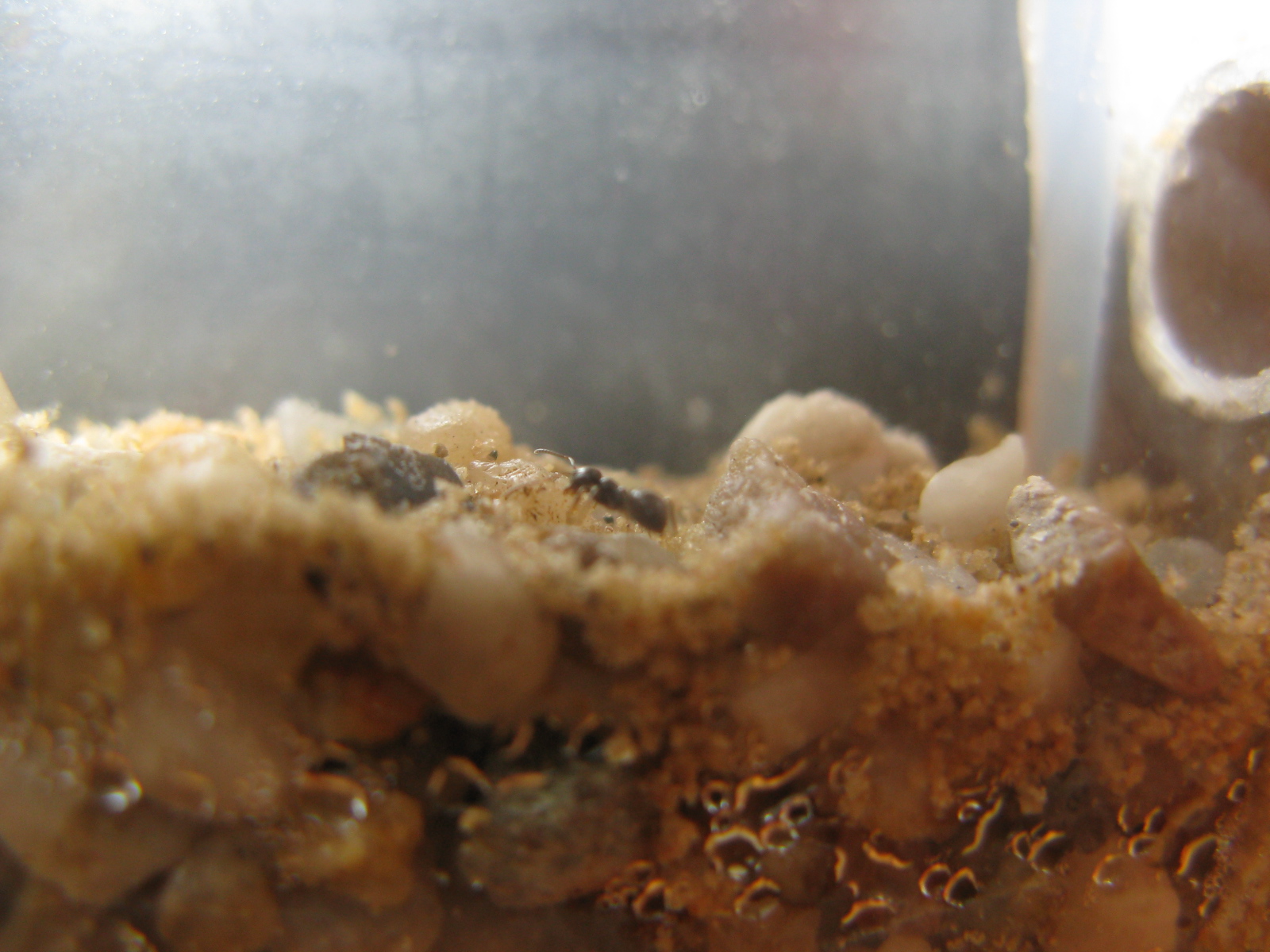 Also der Einzug in die Farm ist mittlerweile komplettiert die Königin scheint wohlbesonnen in ihrer neuen Kammer angekommen zu sein, da sie an der Oberfläche nicht mehr zu sehen ist. Die Brut macht auch einen guten Eindruck, besonders zu erwähnen ist, dass ich heute morgen eine ganz frische :sign_welcome: heißen durfte. Das meine Ants die Brut oben lagern ist doch ansich ein natürliches Verhalten, oder? Ich glaube mal gelesen zu haben das sie die Puppen an den Wärmsten stellen lagern und das ist bei mir an der Oberfläche.
