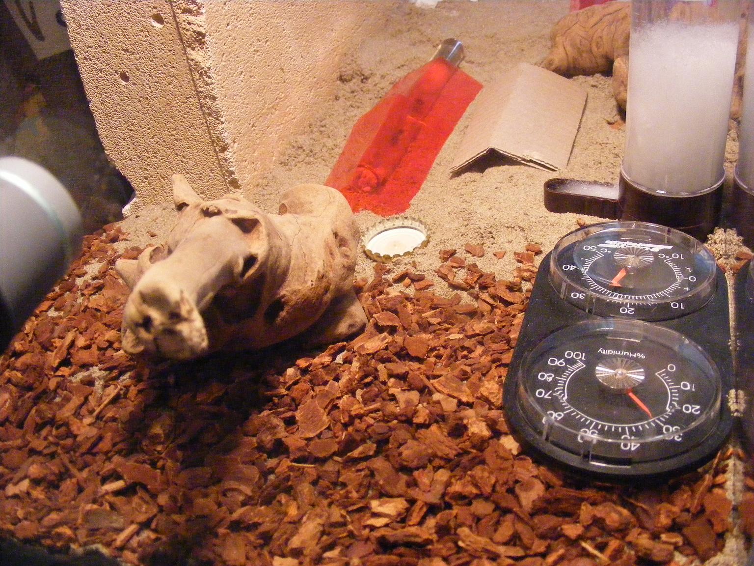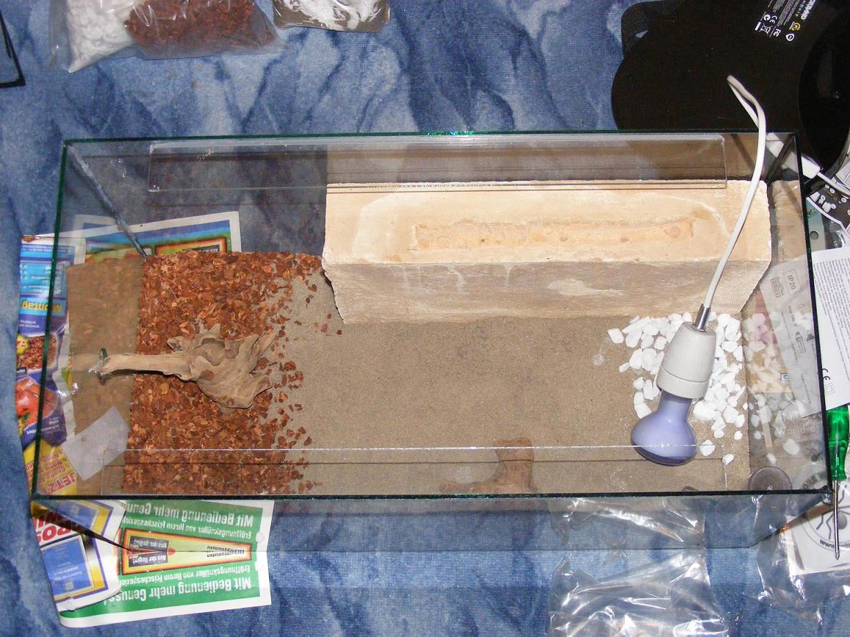 Habe heute meine kleinen in die neue Anlage verlegt welche die Maße 60 mal 30 mal 30 cm hat,mit einer kleinen sonnen von 50 Watt was ein schönen aufwärm bereich von 27 Grad macht bei einer Luftfeuchtigkeit von 35% ohne Befeuchtung des Ytong Nestes,die Art mag es lieber etwas zu Trocken als zu feucht,wichtig ist nur das immer Wasser zum Trinken vorhanden ist.