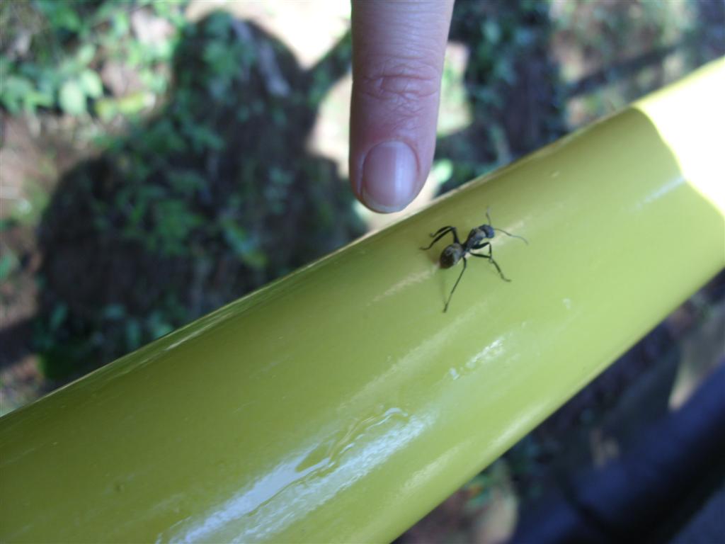 Diese Ameise war riesig! Ich habe sie bei den Wasserfällen von Iguacu an der argenitisch-brasilianischen Grenze gesehen. Der Finger auf dem Bild ist mein Zeigefinger und ich habe normal große Männerhände! Hier auch als Video: