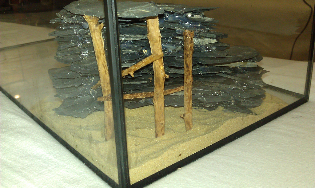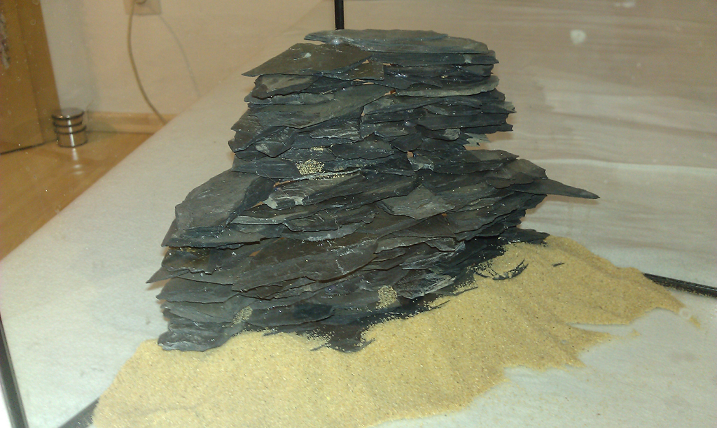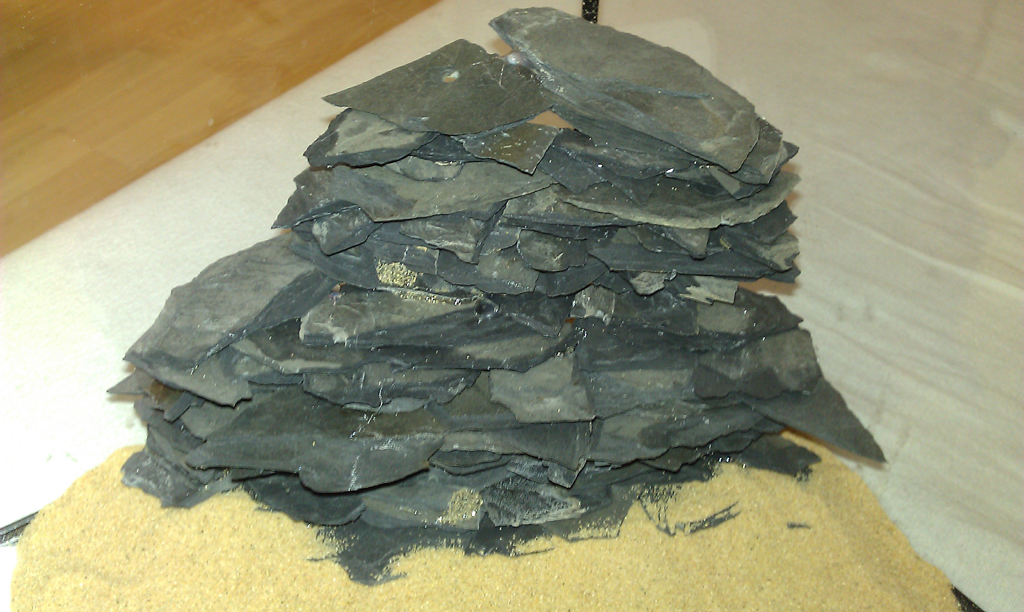 Zufälligerweise hatte ich noch ein paar alte Schiefersteine im Keller und so kam mir die Idee eines "Schieferstein Nestes". Dazu habe ich die Großen Platten zerkleinert und die Stücke nach dem Säubern mit Heißkleber (hab gelesen, dass dies nicht schädlich für Ameisen ist, oder?) aufeinandergeklebt. Nachdem ich angefangen habe zu kleben, bemerkte ich allerdings, dass dort ziehmlich viele Löcher enstehen, da die Stücke nicht so gut aufeinander passen. Allerdings habe ich weitergeklebt und zum Schluss noch einige Löcher (auch wegen der Stabilität) zugeklebt. Damit die Kontruktion auf der Innenseite nicht umkippt, verbaute ich noch Äste als Stützen. Denkt ihr, dass die Ameisen dort einziehen werden, oder soll ich lieber auf etwas anderes umsteigen? Auf den Bildern sieht man das momentane Stadium meines Formicariums.