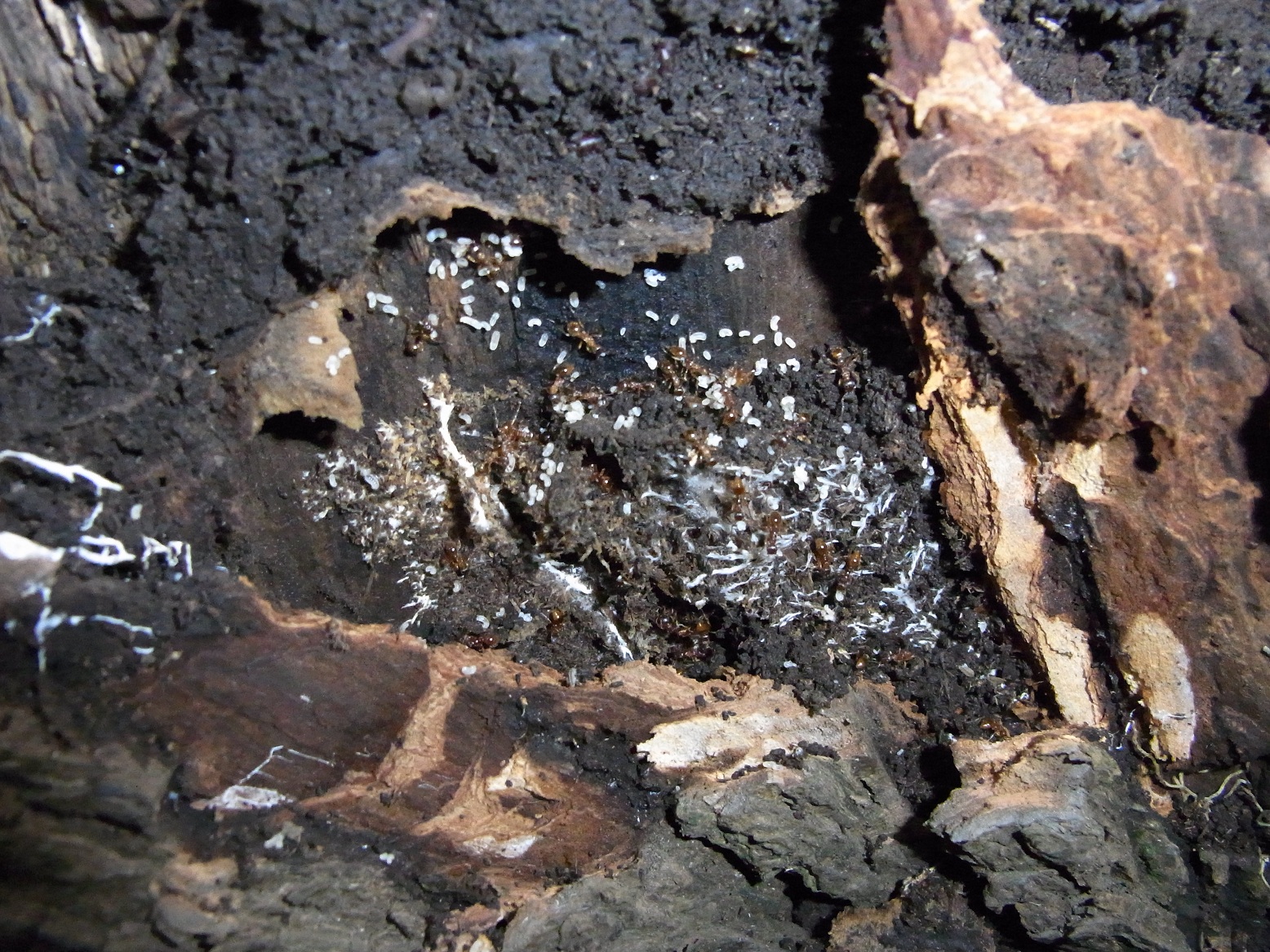 Ein Baumstamm voll durchzogen von Pilzen und dazwischen das Ameisennest, ob Pilz und Ameisen voneinander Nutzen ziehen?