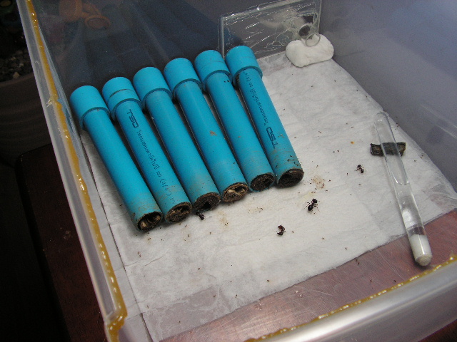 The colony have destressed and settled in again. I linked up two containers with a inche of plaster in the bottom to there temperory container , on waking this morning i am surprised to find they have moved from the test tubes and spread out in these. The queen is there and being fed and groomed aswell. There are only a few minor workers thou , i counted 3 looking in :( I will now leave them here , the colony consist of media , major workers and minor , media , major and mega major soldiers. Most have greatly extended gasters , but i will put in a few fruit flys tonight.