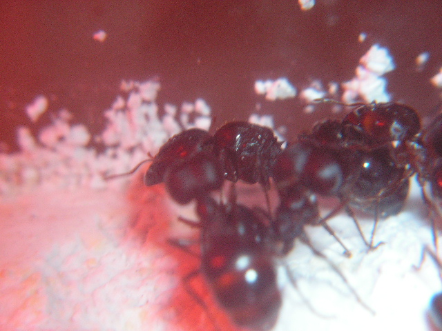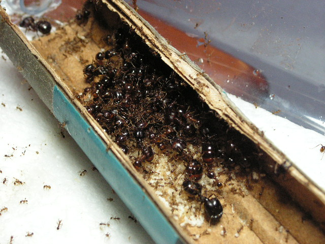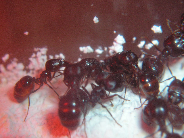 The colonys population of minor workers has been dropping very quick and yet i couldent see any bodys in the trash pile , i have made a shocking discovery , it was only while watering the nest last night i noticed a major soldier walking around in the bookcase , on closer inspection there was anouther dead between the heating cables, when i looked behind the nests i am shocked to find masses of dead workers and a hole in the back of the nest. they had chewed throu several inches of plaster. the workers that came out have died due to getting into contact with the heating cables , or maybe the lack of moisture outside the nest was the cause , i am really frustrated and upset with this , :evil: , i think maybe no success can be made with thses ants unless you just put them in a tank full of soil and let them get on with it.