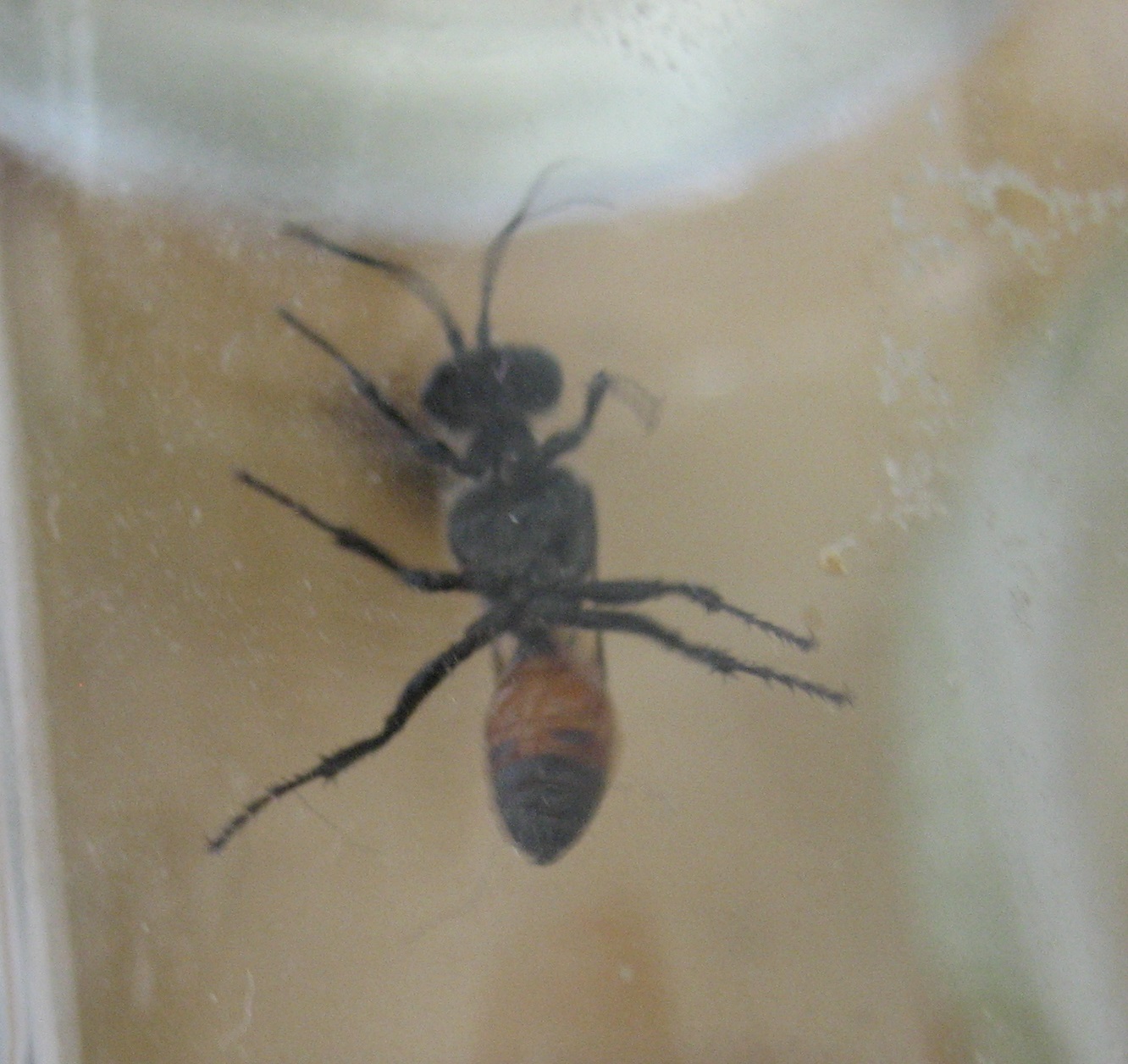Meine Vermutung: es ist eine Wegwespe. Allein wegen den ersten rötlichen Segmenten des Hinterleibs.