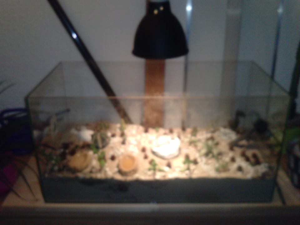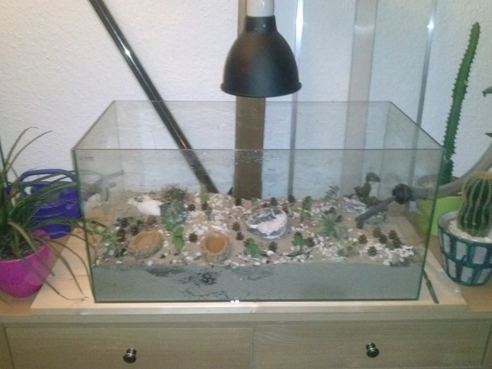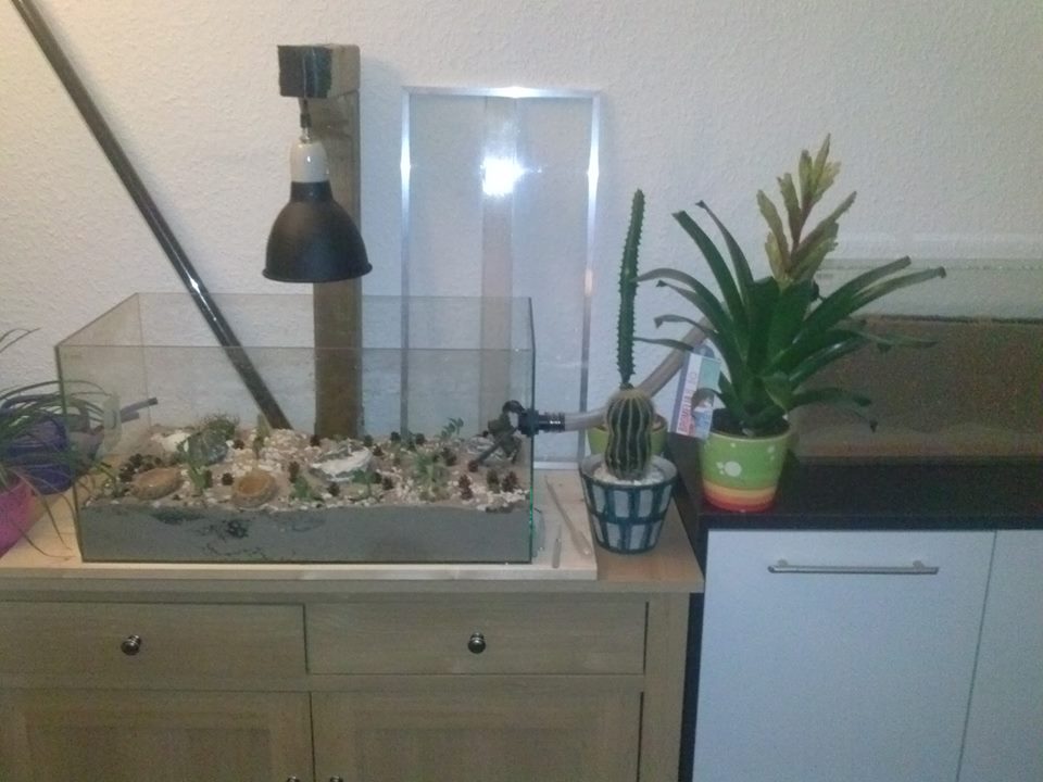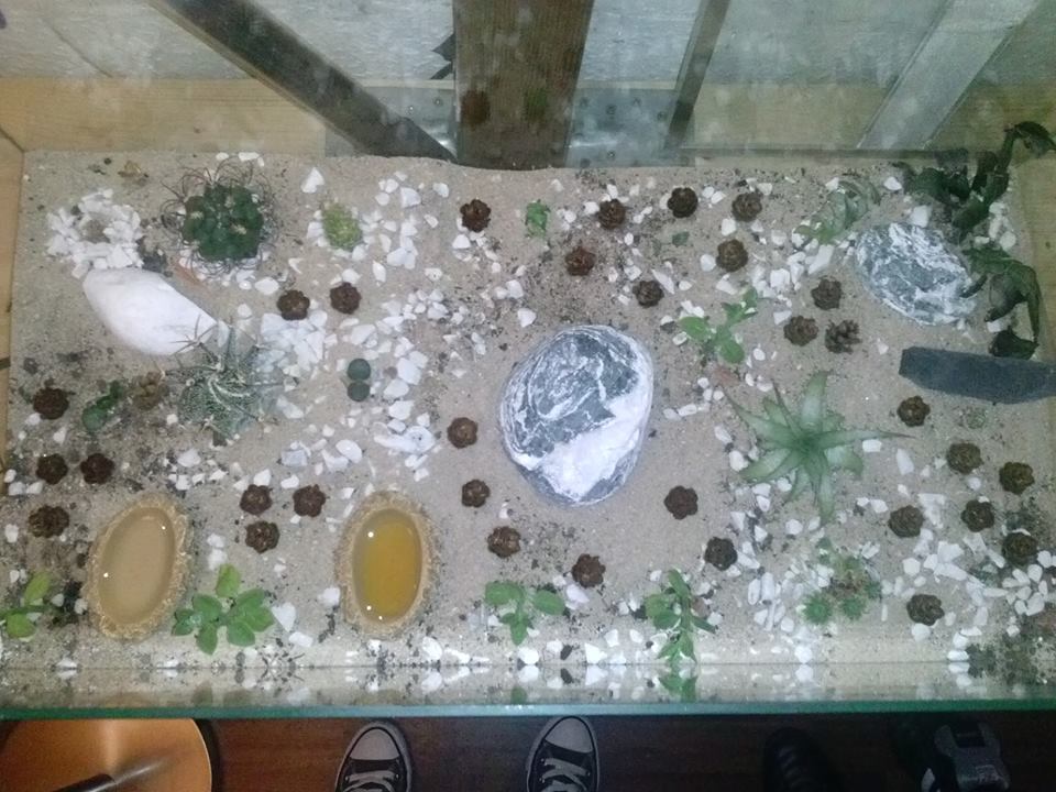 Die Arena habe ich mit ca. 18 kleinen Wüstengewächsen & Ähnlichen Pflanzen wie Kakteen, Sukkulenten, spanischen Steinpflanzen bepflanzt(Alle anderen Pflanzen sind immer eingegangen). Manche Pflanzen habe ich in kleine Tontöpfchen eingegraben.
