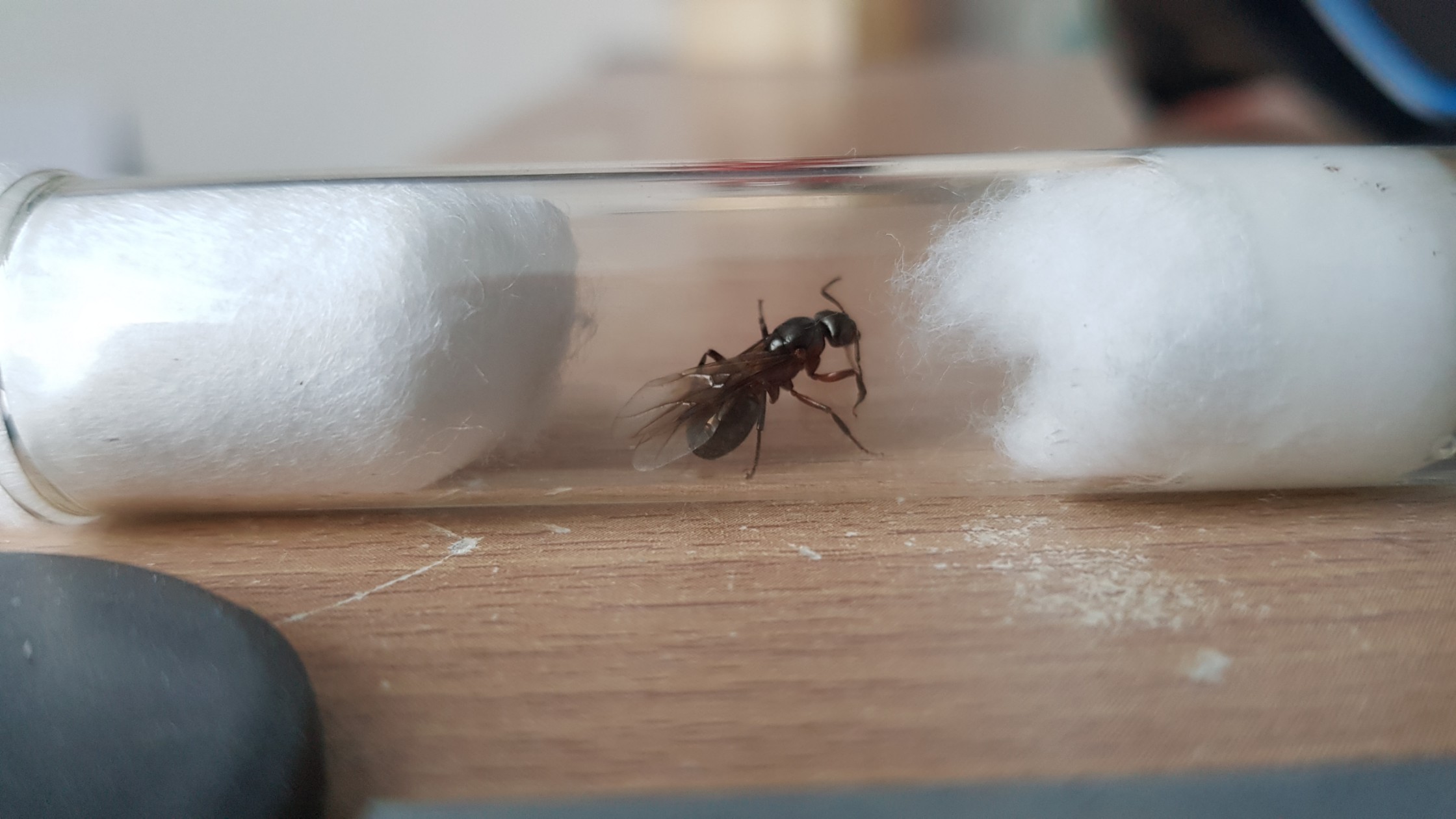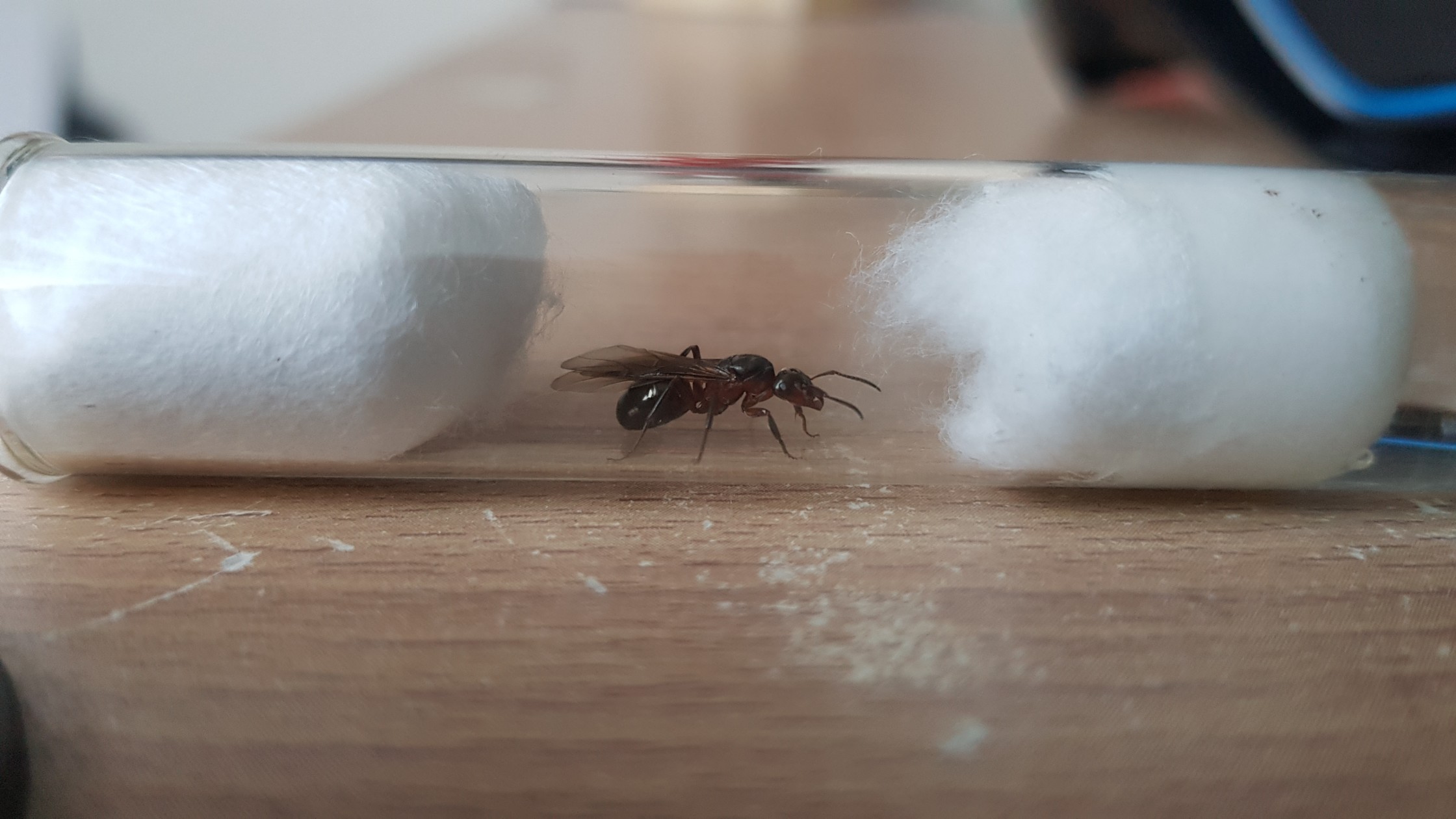 Ich habe heute an einem naheliegenden See (670,49 m+NN) in Baden Württemberg eine geflügelte Ameise aus dem Wasser gerettet. Sie ist ca 1cm lang oben schwarz, unten rot/Braun und an den Beinansätzen auch rot/braun (siehe Bilder). Sie hat noch Flügel dran, wäre ja aber möglich dass sie diese noch abwirft wenn sie Ruhe hat. Ich habe sie erstmal in einem Reagenzglas untergebracht. Kann mir jemand sagen ob ich eine Gyne erwischt habe oder ob es sich um ein Männchen haltet und ich es wieder aussetzten kann oder ob es eine Gyne ist (wenn es eine Gyne ist und sie die Flügel nicht abwirft setzt ich sie auch wieder aus damit sie eine Chance auf einen 2. Schwarmflug hat)? Bzw um welche Art handelt es sich überhaupt?