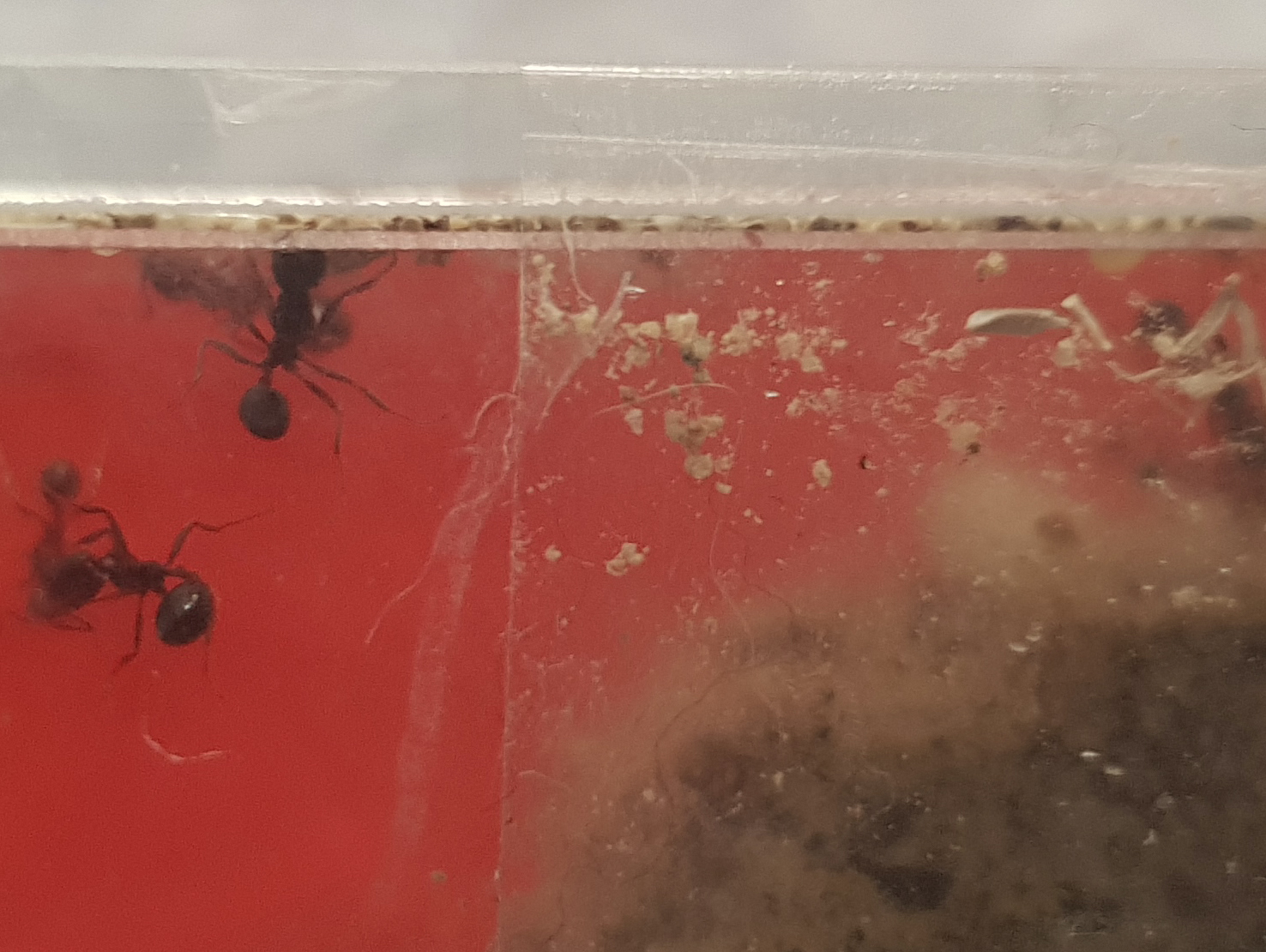 ich beobachte bei meinen Messor barbarus, dass sie permanent an den Nestern kleine Sandkörner oder Futterreste zwischen die Abdeckung und den Glaskörper des Nests schieben (siehe Bild) Und im Laufe der Zeit schaffen sie es so, kleine Lücken zu erschaffen, aus denen die Pygmäen ausbrechen können ... Im angehängten Bild ist es recht "leer" am Beckenrand - aber es gibt Tage, da gibt es keinen Millimeter, an dem nicht eine Ameise sitzt und da herumackert. Gibt es (ausser dem "Reviererweiterungsdrang" irgendeinen Grund, wieso sie das machen?