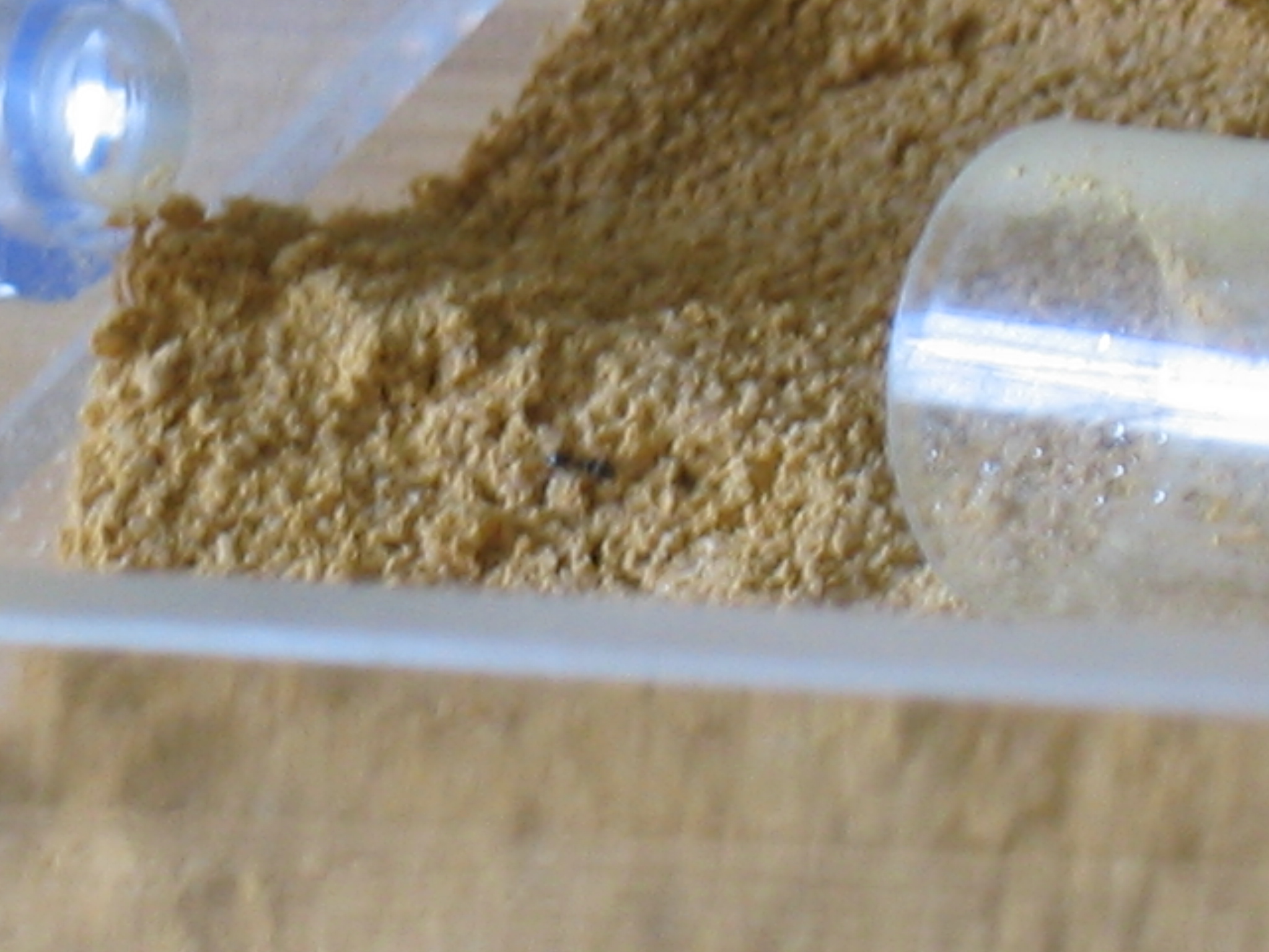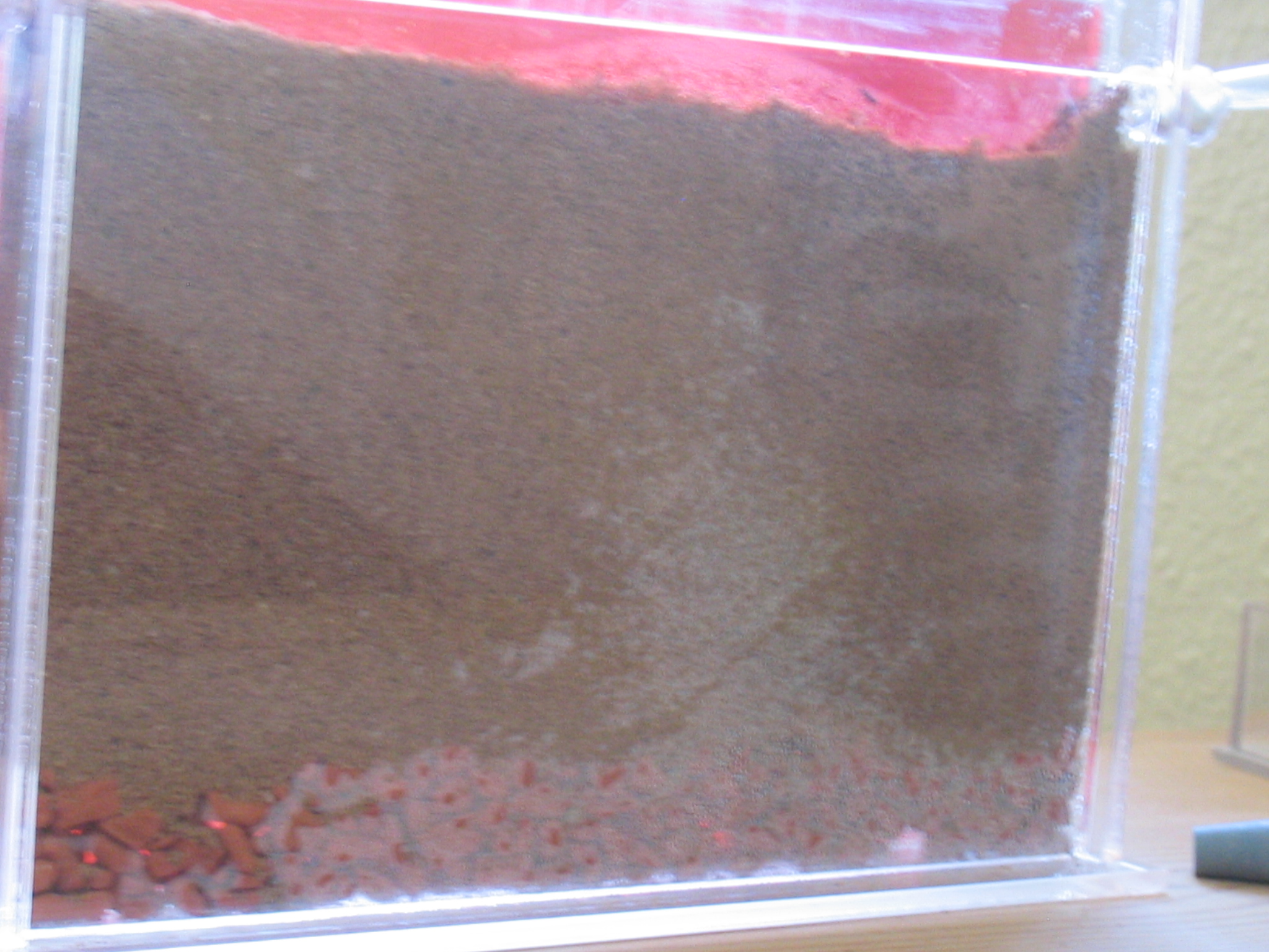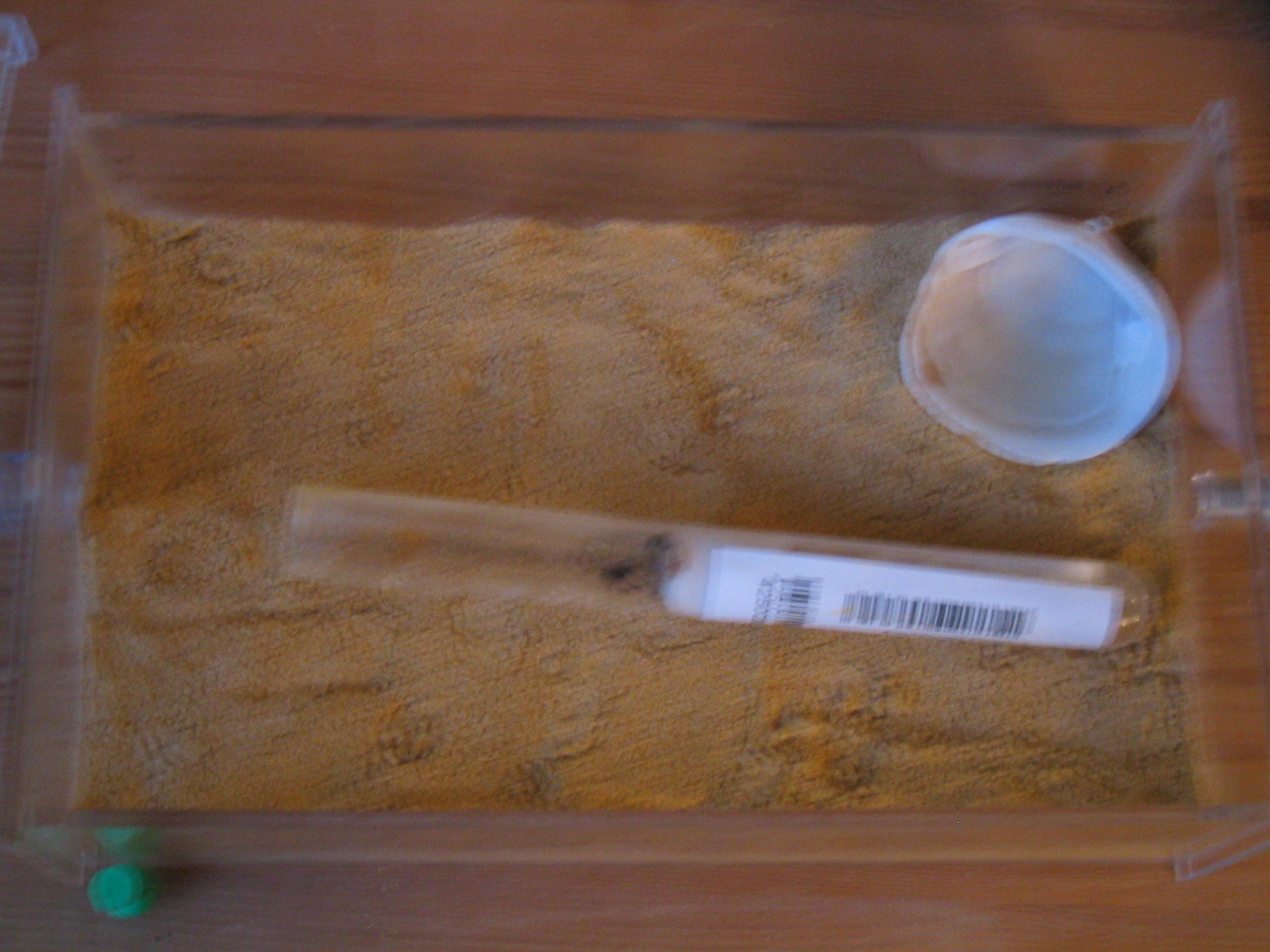 So jetzt die Farm mit dme Schlauch an die Arena angeschlossen.Diese war schon mit gelber Sand/Lehm Mischung gefüllt und mit Olivenöl vor dem Ausbruch der kleinen gesichert.In der Ecke der arena hatte ich den Mitgelieferten Futternapf stehen den ich mit Honig Zucker Lösong füllte und ein Wattepad damit die kleinen nicht ertrinken
