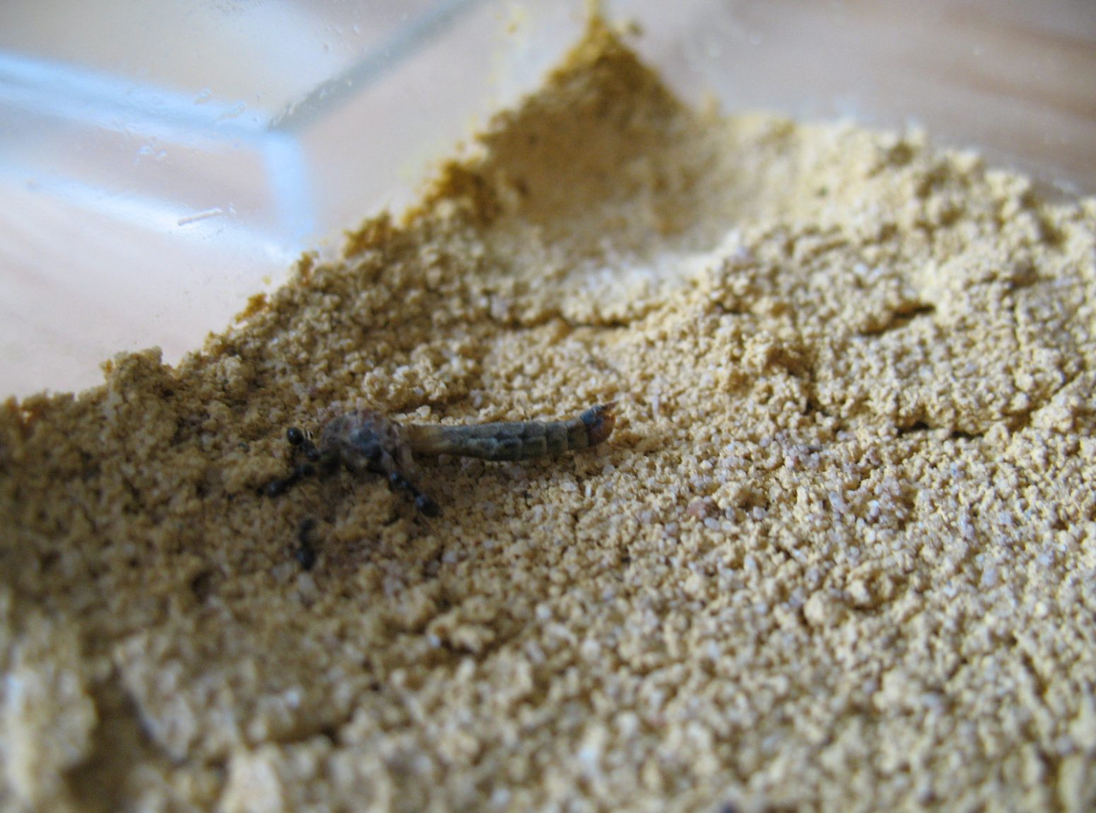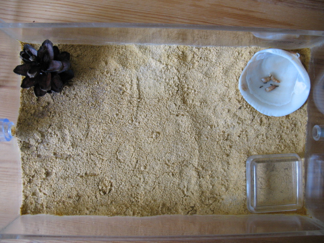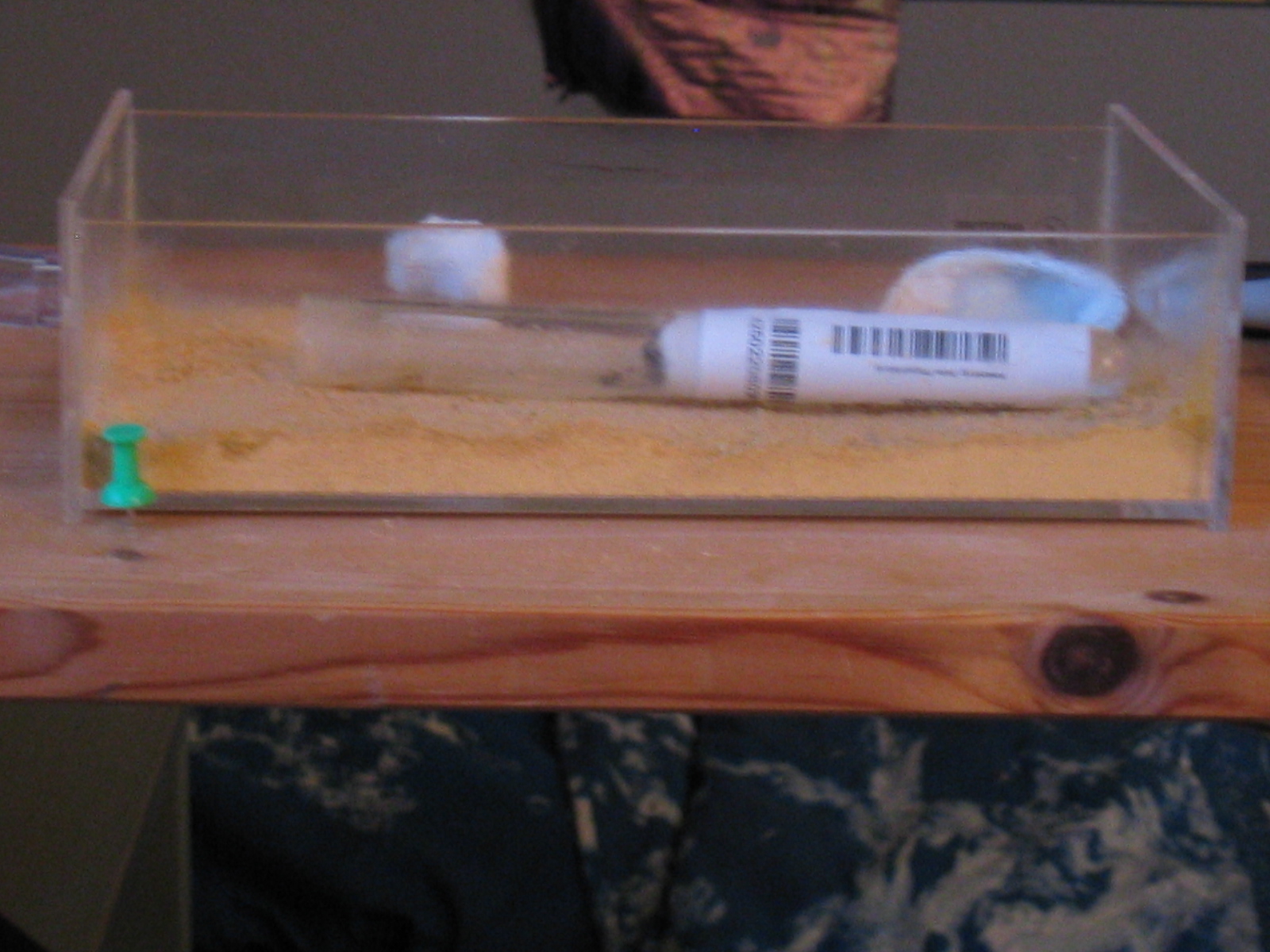 So jetzt die Farm mit dme Schlauch an die Arena angeschlossen.Diese war schon mit gelber Sand/Lehm Mischung gefüllt und mit Olivenöl vor dem Ausbruch der kleinen gesichert.In der Ecke der arena hatte ich den Mitgelieferten Futternapf stehen den ich mit Honig Zucker Lösong füllte und ein Wattepad damit die kleinen nicht ertrinken