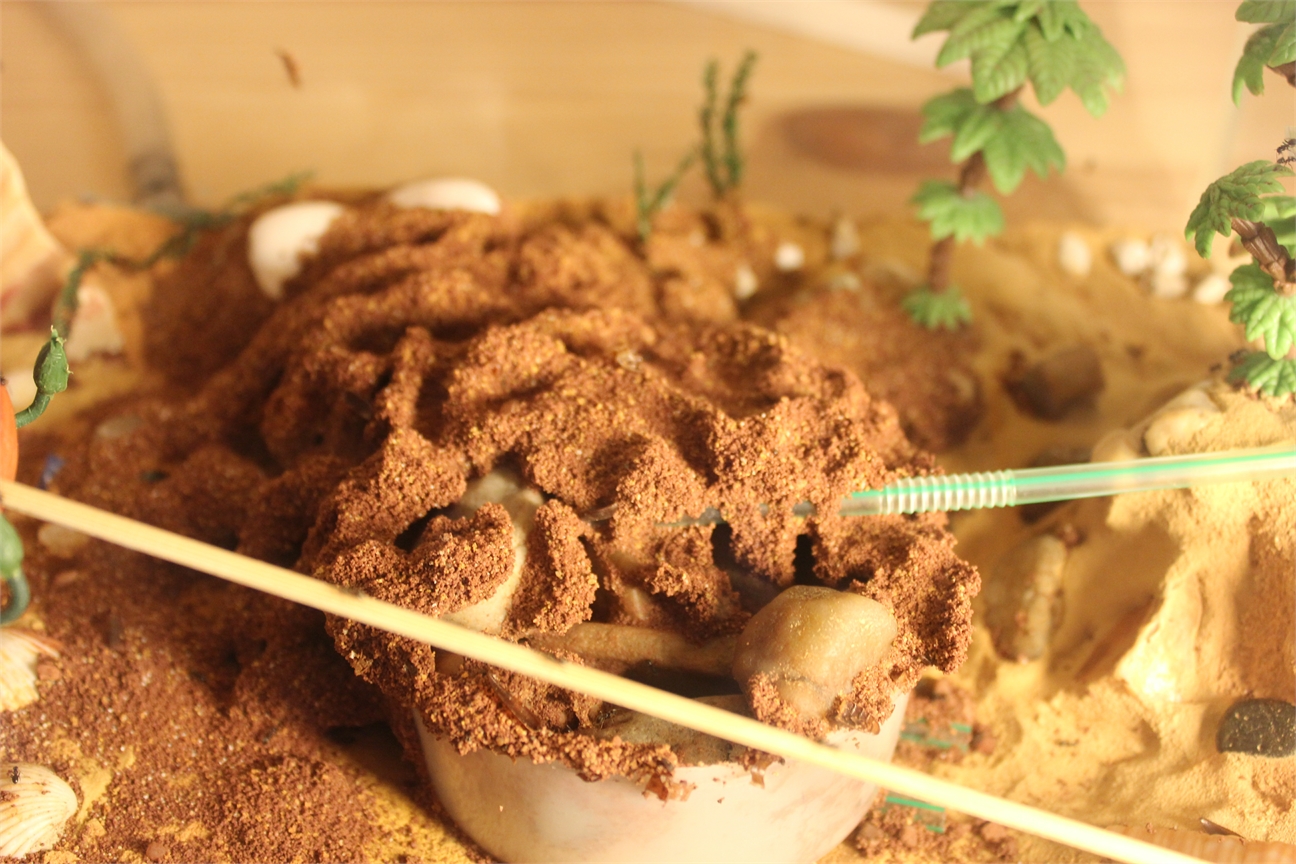 Dafür kleben sie so lange feuchten Sand auf die Seite des Trinkbehälters, bis das Wasser auf den Boden gesaugt wird und sie alles umgraben können.