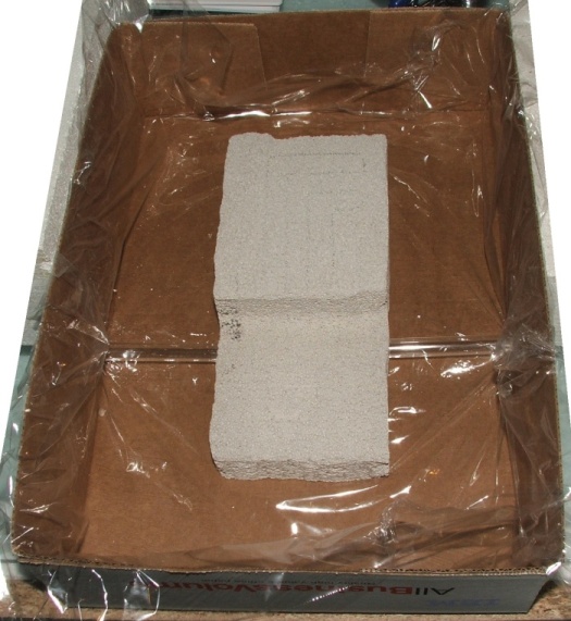- Hier ist das umgedrehte Ytongnest in der Styroporform zu sehen, die Scheibe liegt darunter, damit man sie noch rausnehmen kann, wurde sie nicht befestigt, sie liegt später einfach fest in der Zementform.