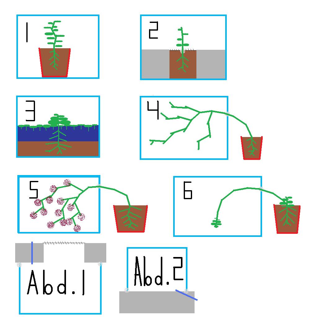 bei Becken sechs lässt man einen Ableger in das Becken wachsen, mögliche Pflanzen wären z.B. Erdbeeren,