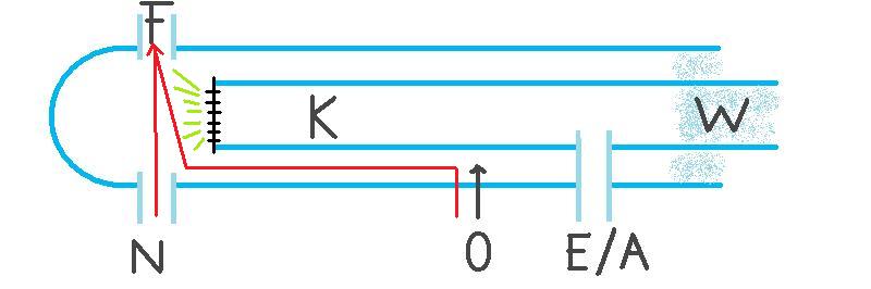 Hellblau eingeschoben sind Zugangsröhren zu sehen F für Futterquelle (oder Röhre dahin) und N für Neströhre, E/A steht für Ein-/Ausgang und ist die Röhre, über die man zunächst die Königin hinzugibt und den man dann später ans Nest anschließt, damit die Adoption stattfinden kann.