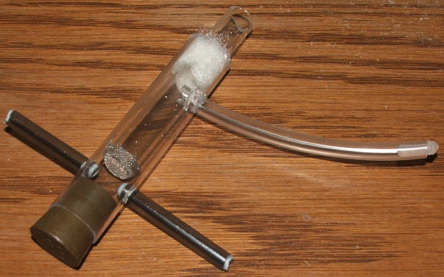 Nach rechts wird das Gebilde mit Watte abgedichtet, die Watte in der Röhre wird zusätzlich mit einer Spritze mit Wasser befüllt, damit die Königin nicht vertrocknet.