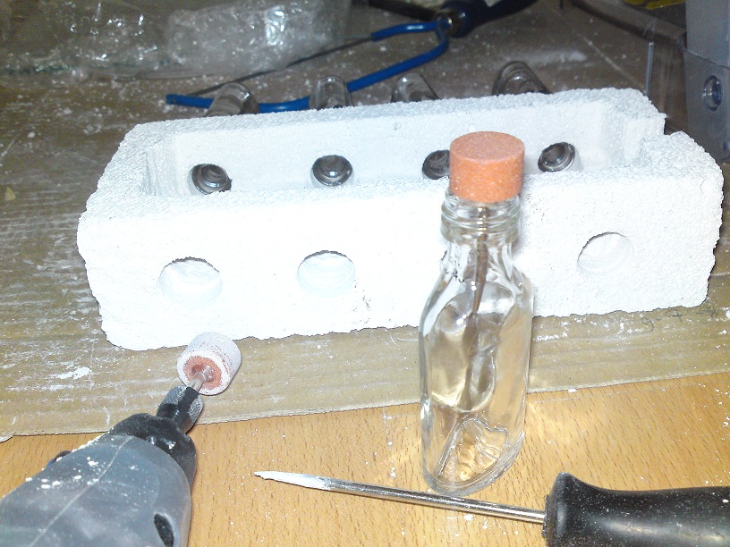 Ich säuberte acht der kleinen Flaschen und höhlte den Ytong aus. Mit Dremel + Bohrer und einem Schraubendreher war das schnell gemacht.